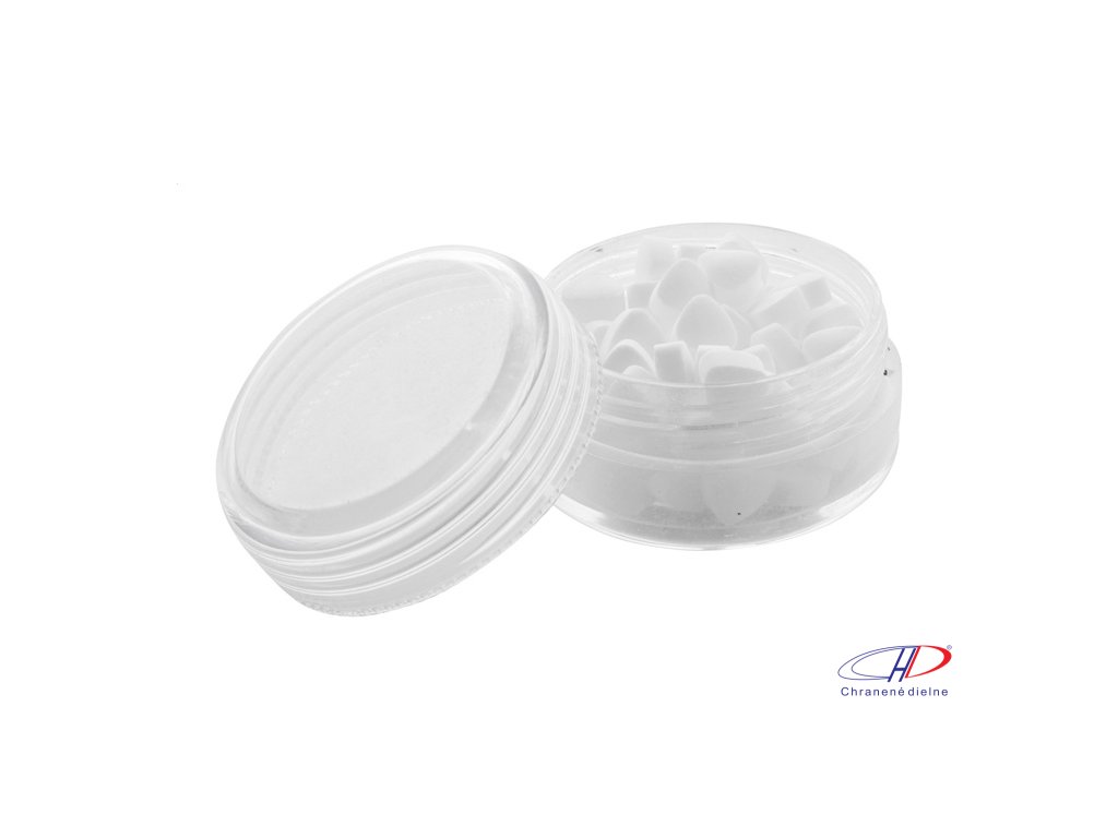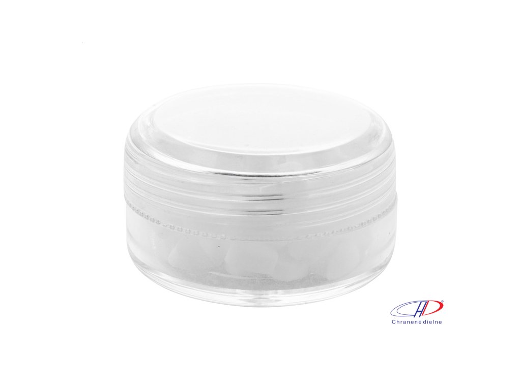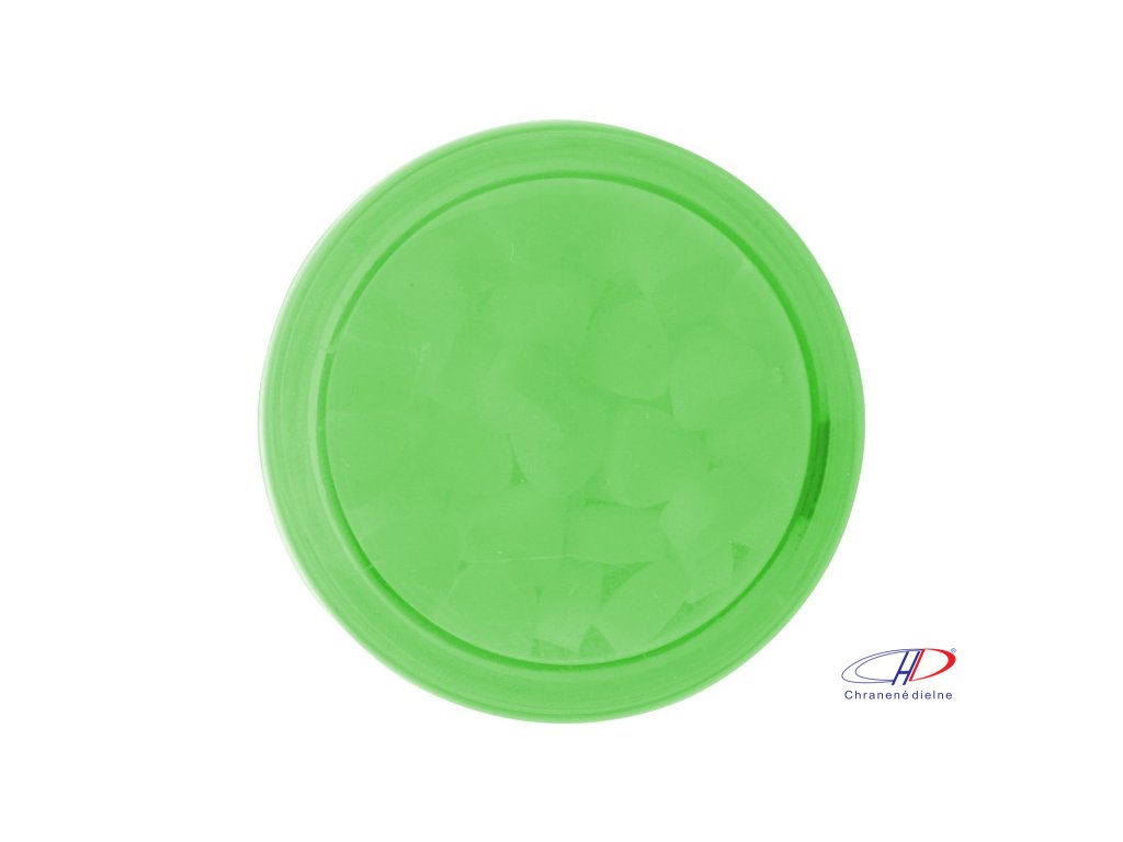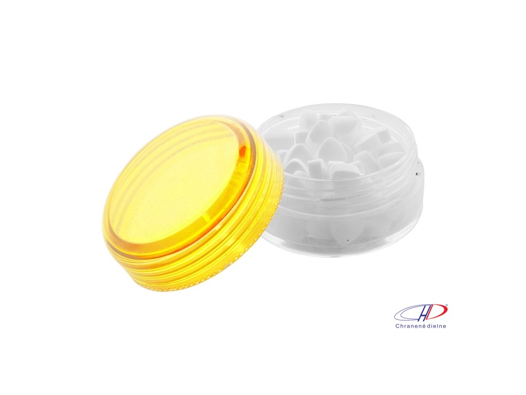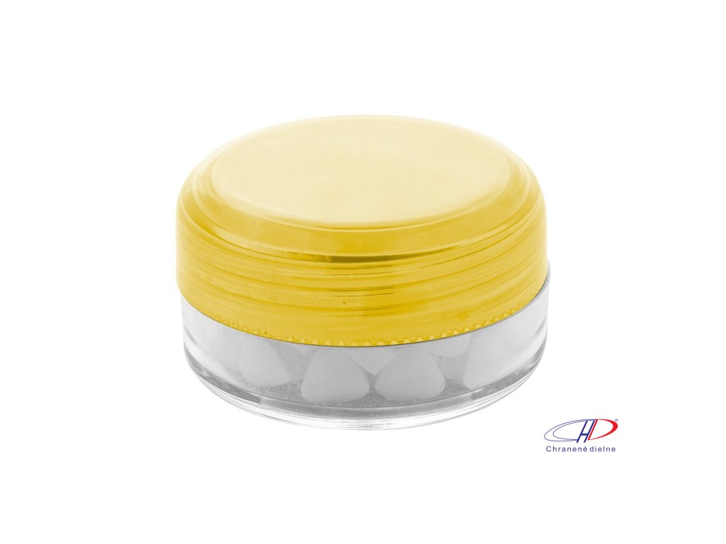 Okrúhla priehľadná plastová dóza s mintovými cukríkmi s farebným skrutkovacím viečkom. Obsahujúce cca. 12 gramov mentolových cukríkov bez cukru.Dodatočné parametre