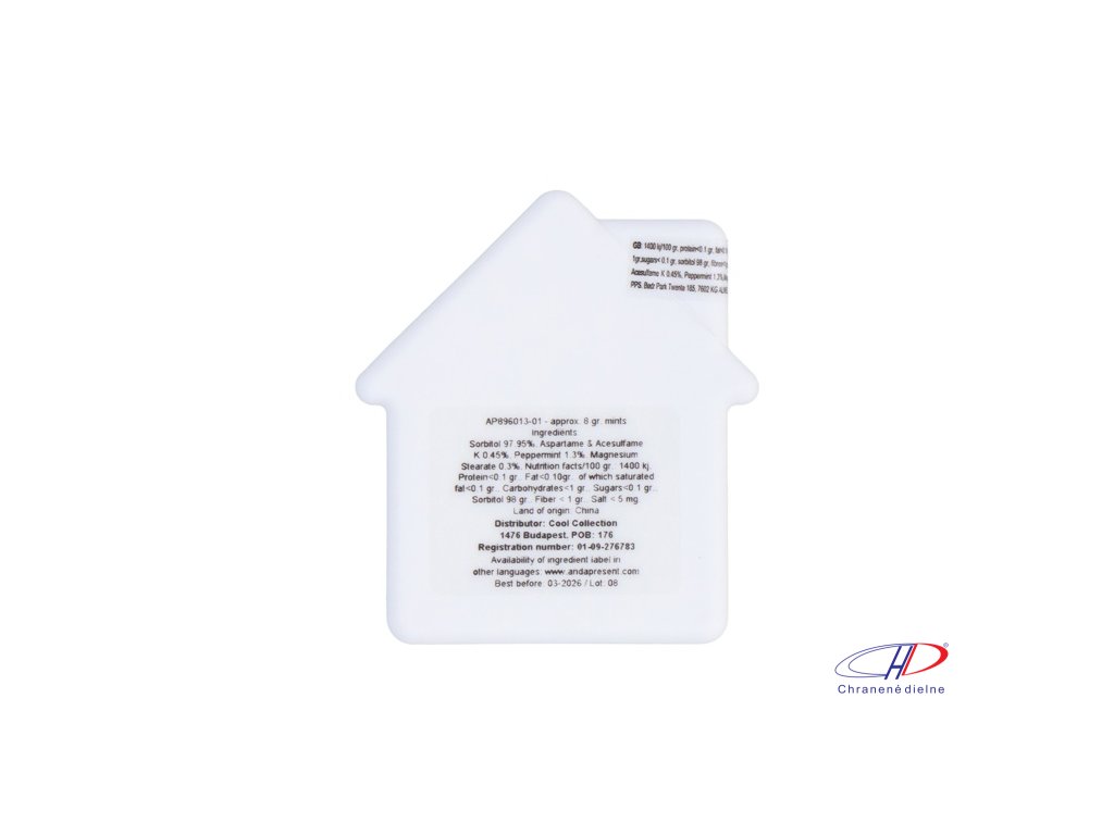 Plastový dávkovač mintových cukríkov v tvare domčeka s cca. 8 gramov mentolových cukríkov bez cukru.