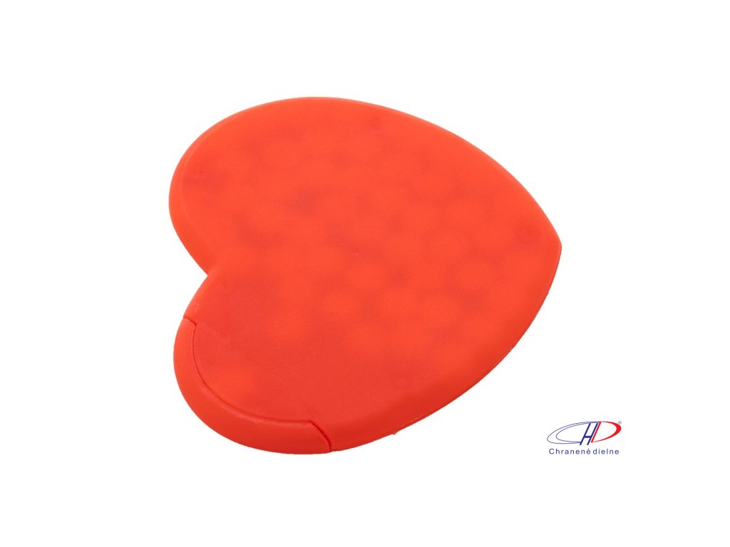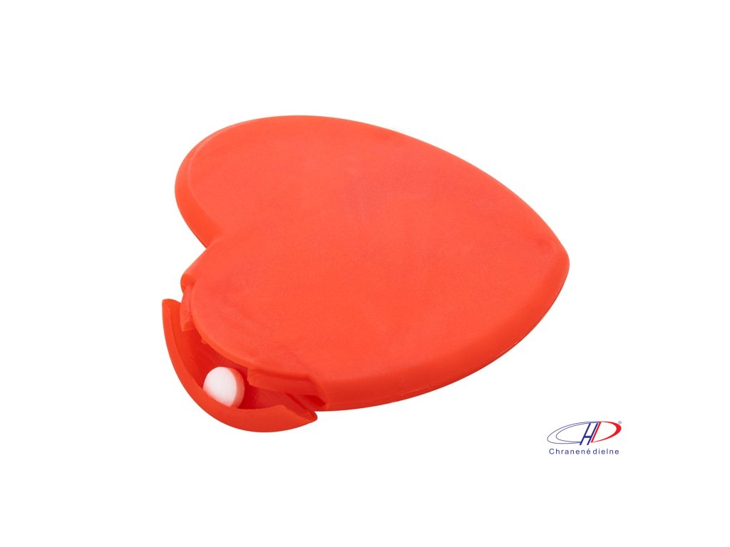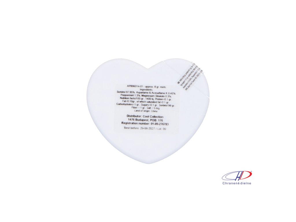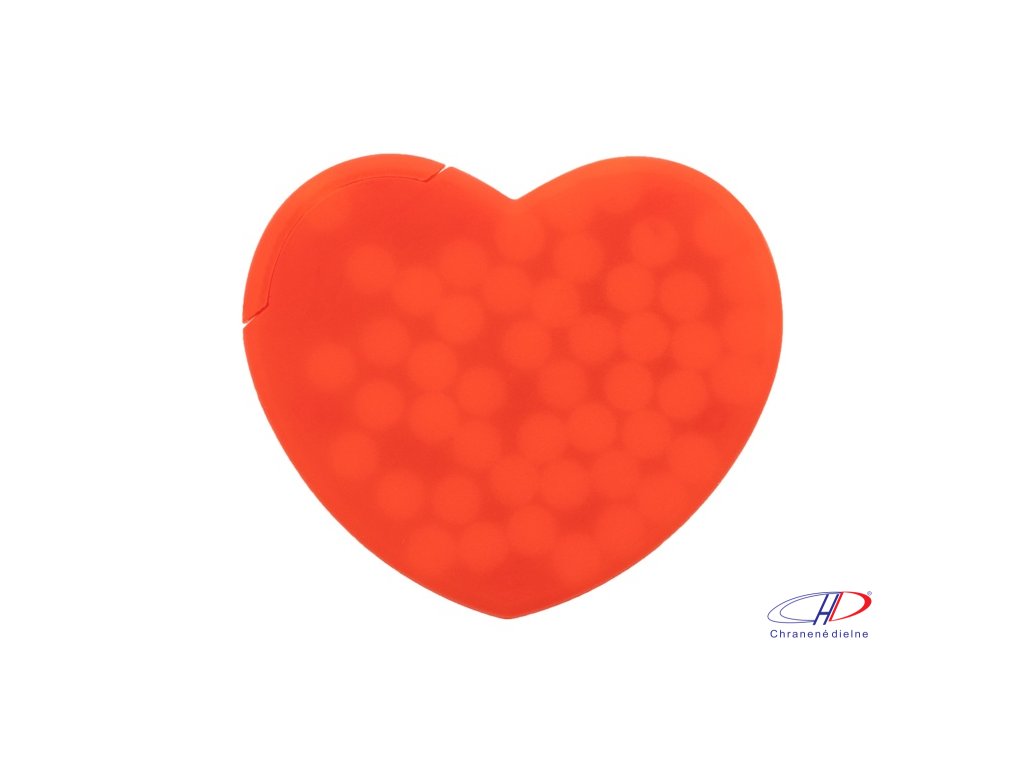 Plastový dávkovač mintových cukríkov v tvare srdca s cca. 8 gramov mentolových cukríkov bez cukru.