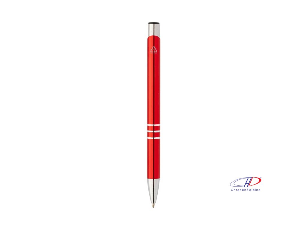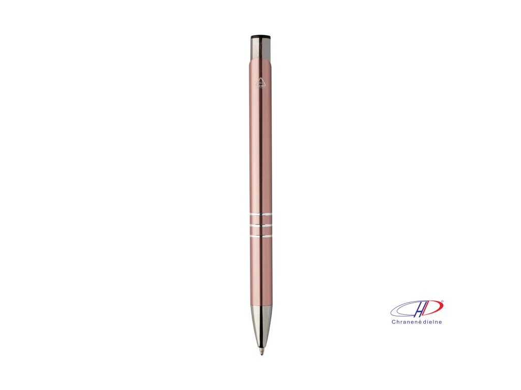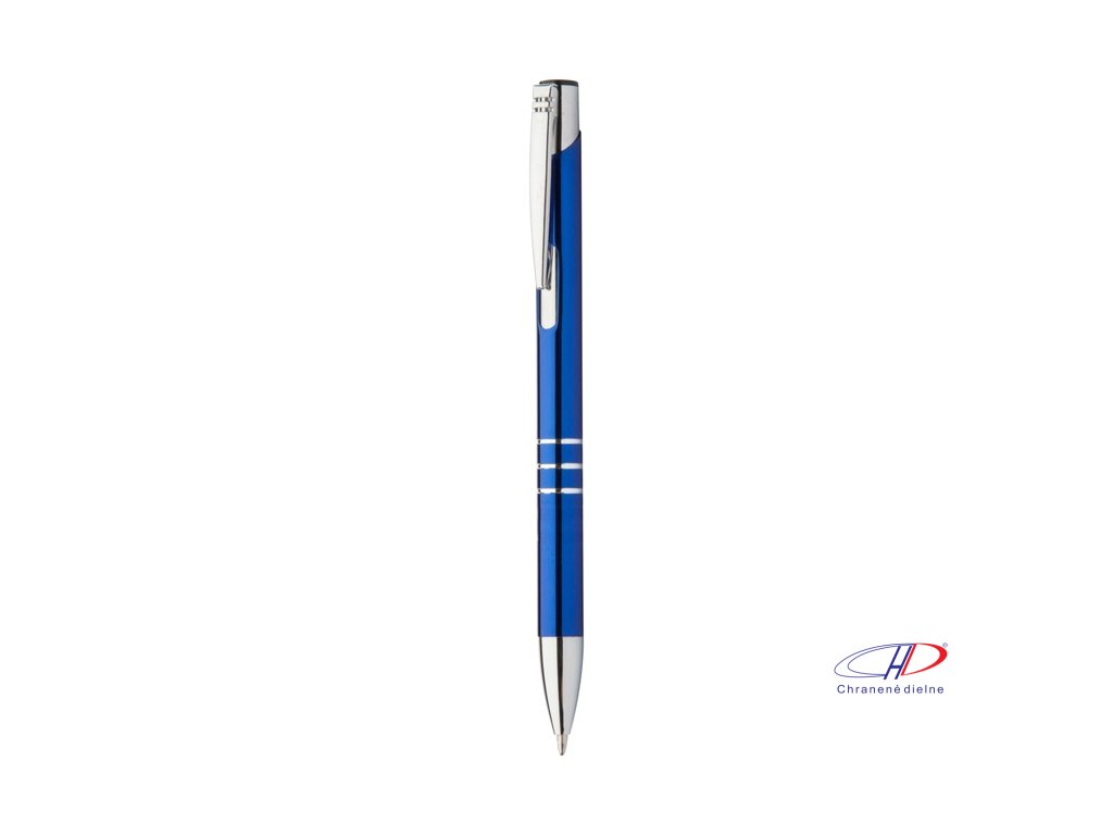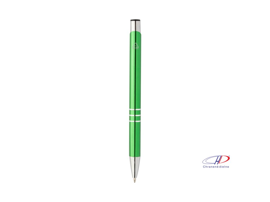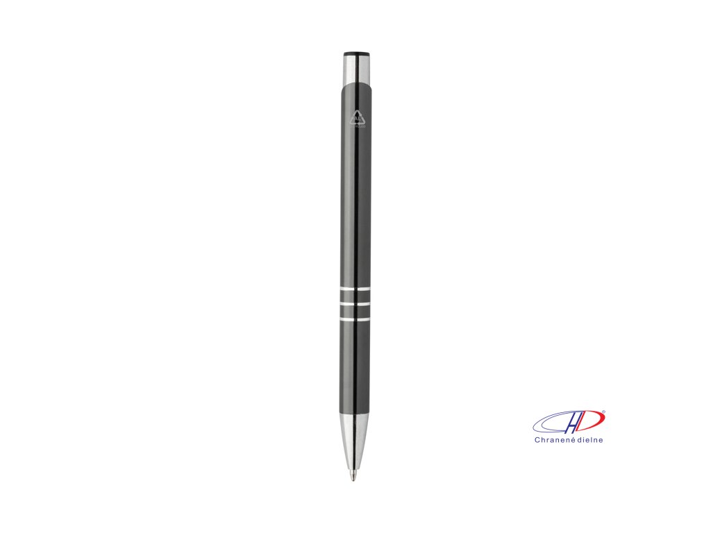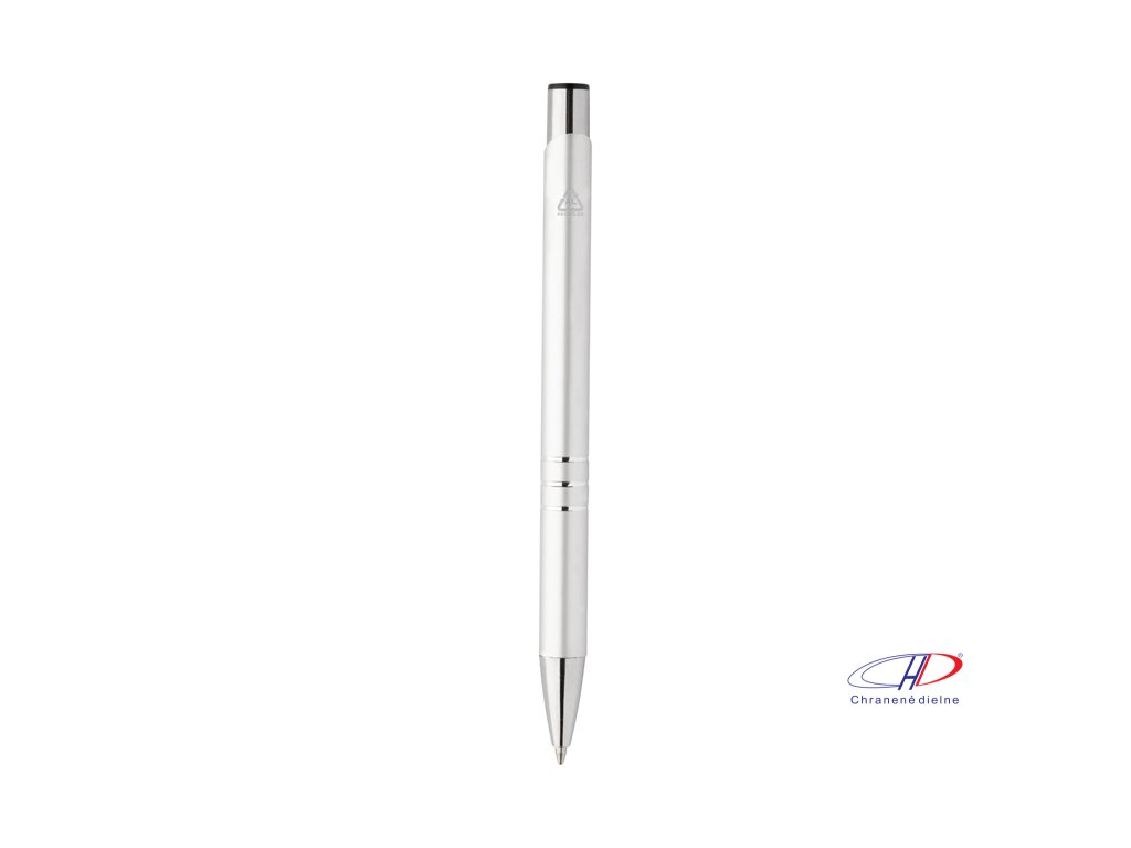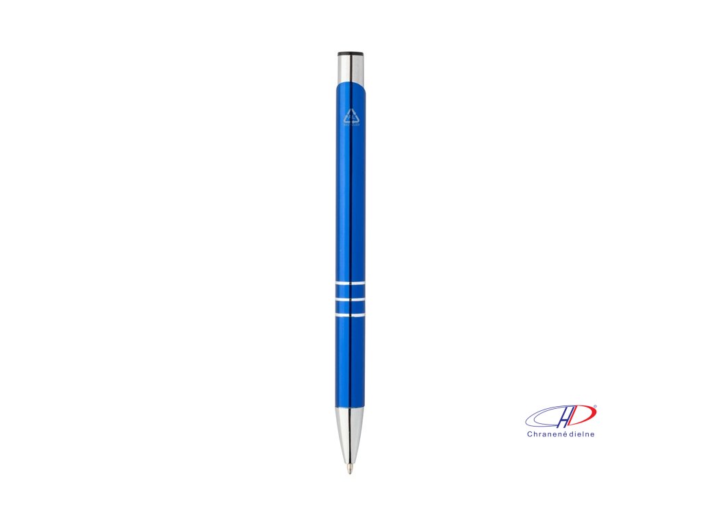 Guľôčkové pero z recyklovaného hliníka s metalickým povrchom a modrou náplňou.