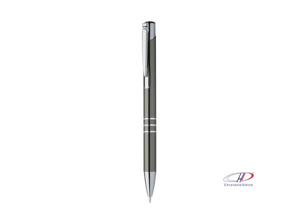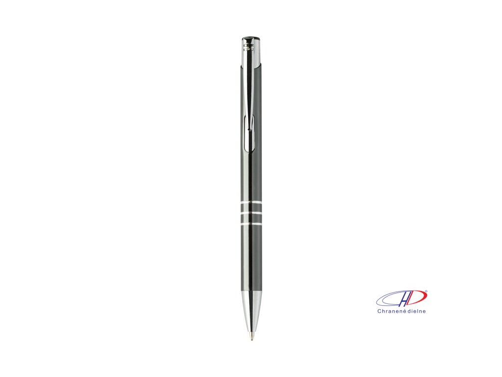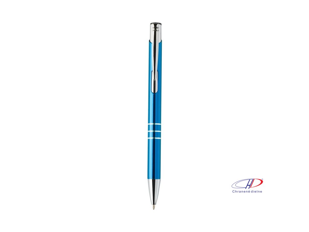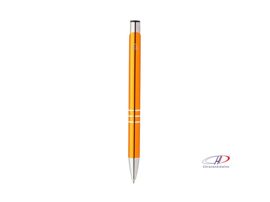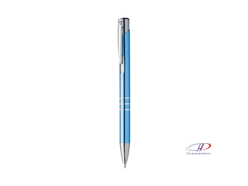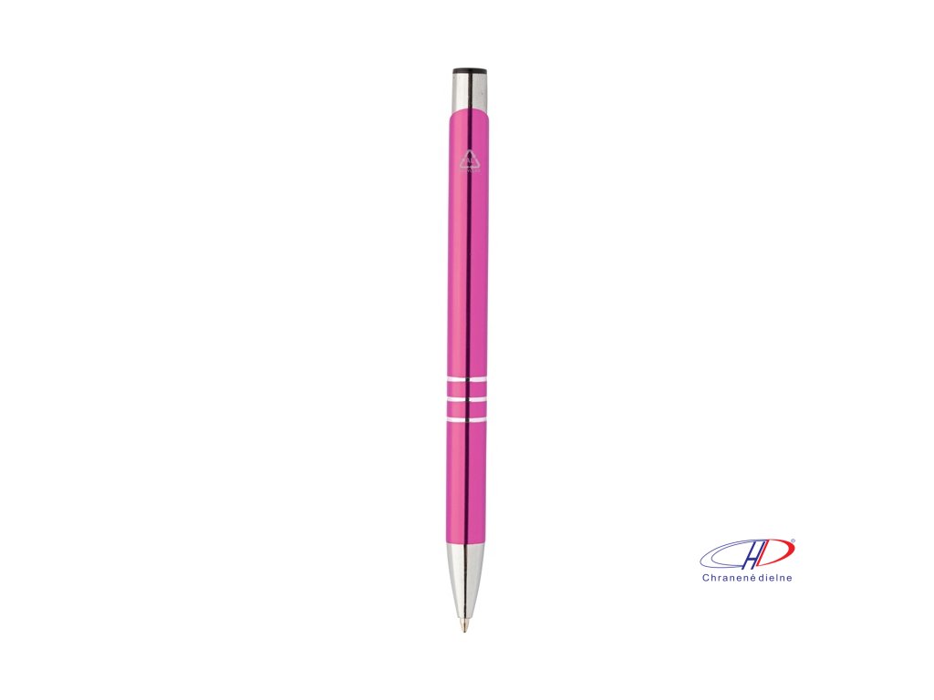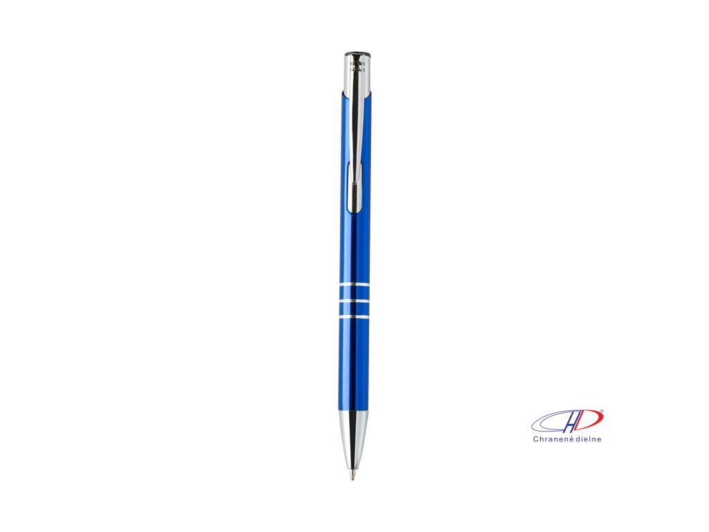 Guľôčkové pero z recyklovaného hliníka s metalickým povrchom a modrou náplňou.