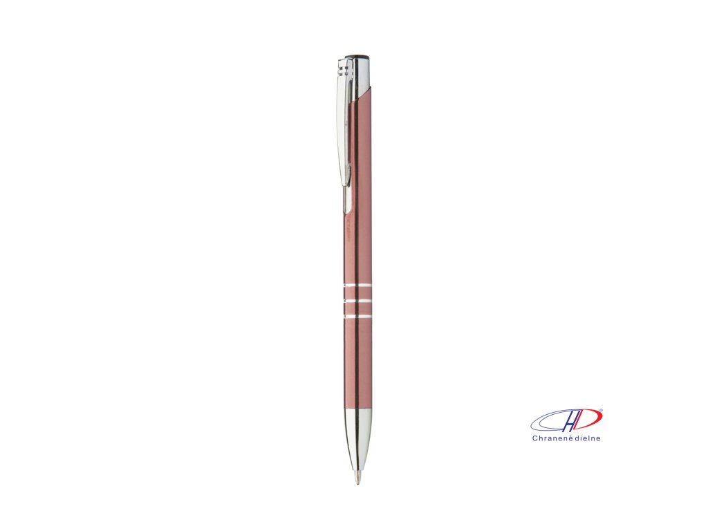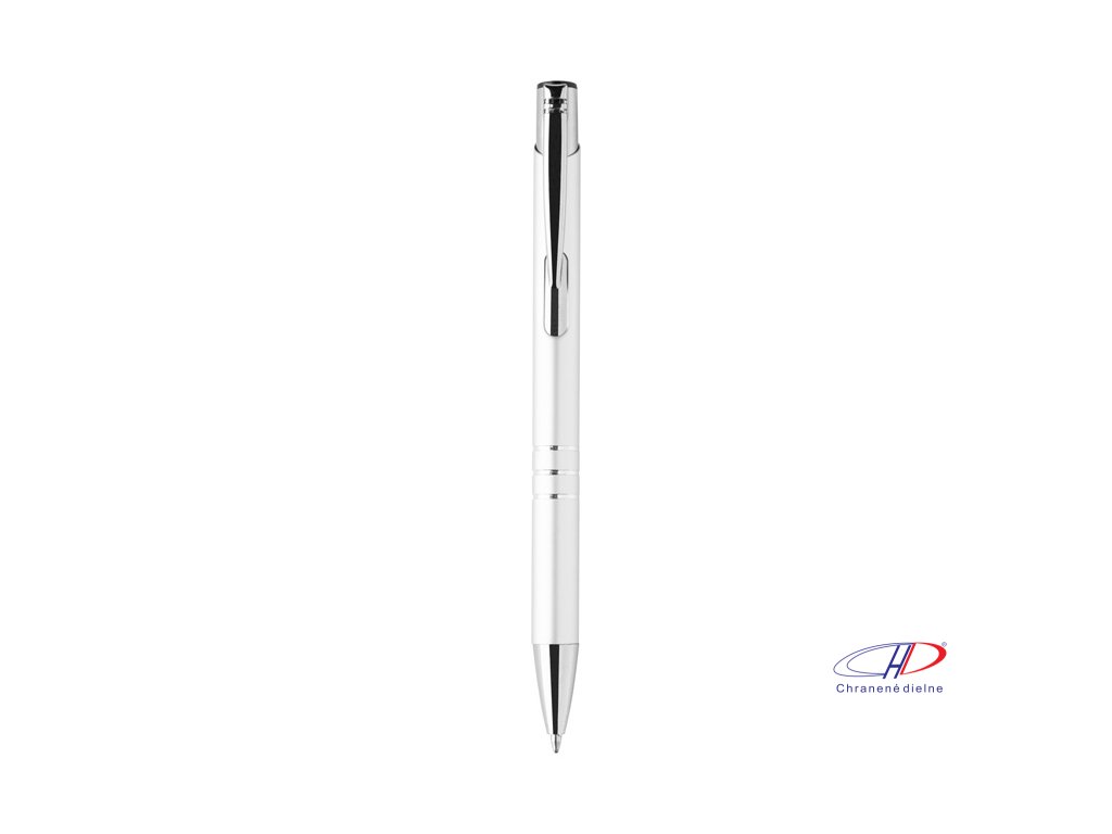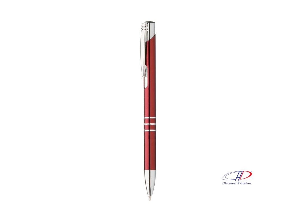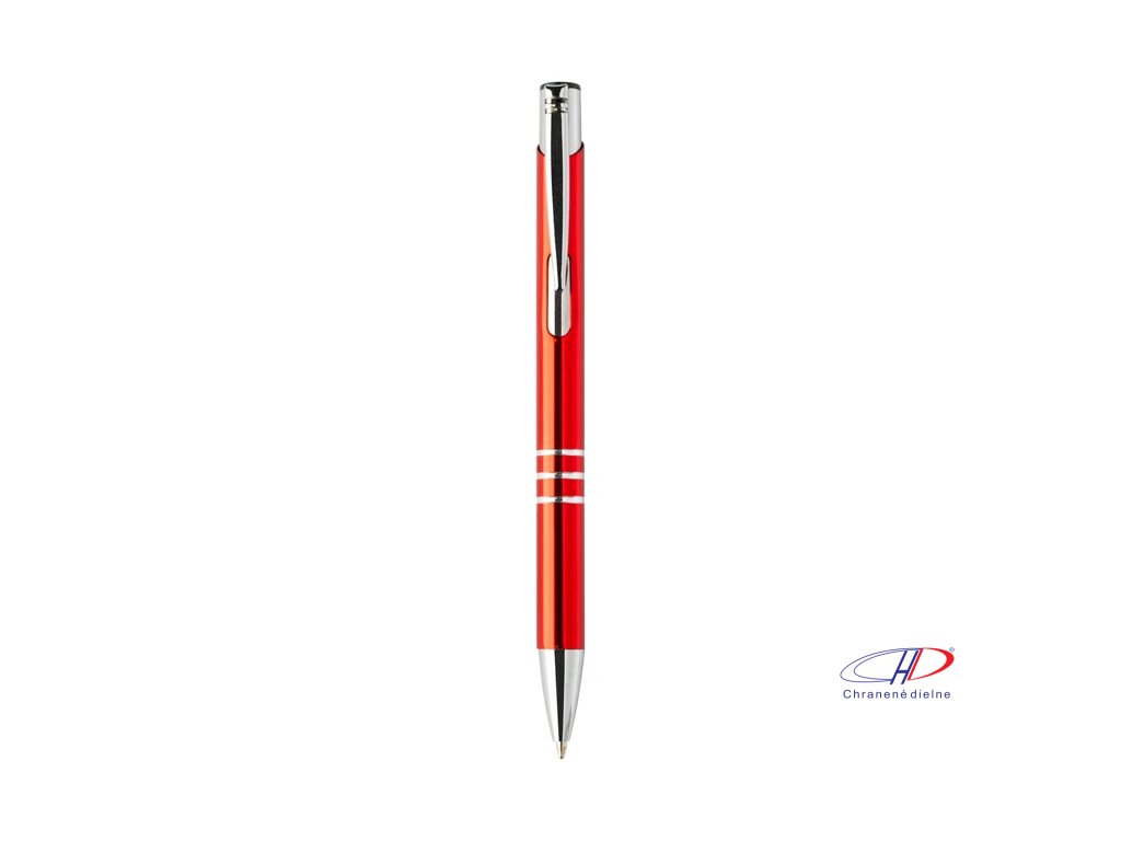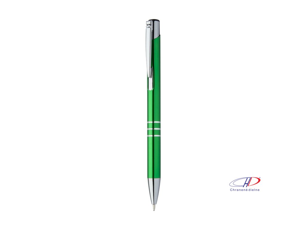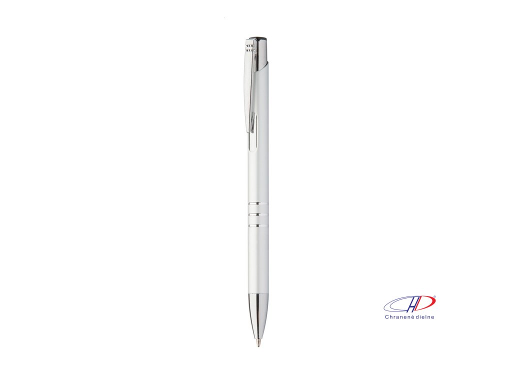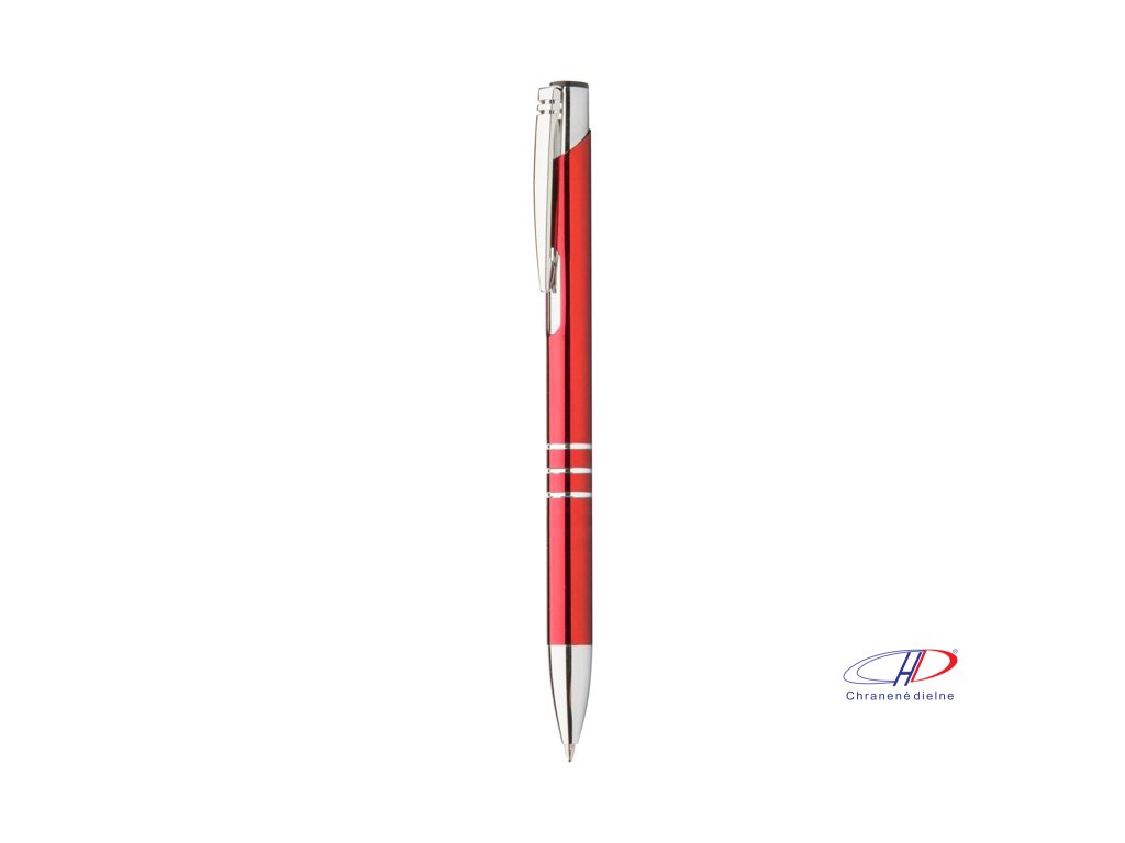 Guľôčkové pero z recyklovaného hliníka s metalickým povrchom a modrou náplňou.