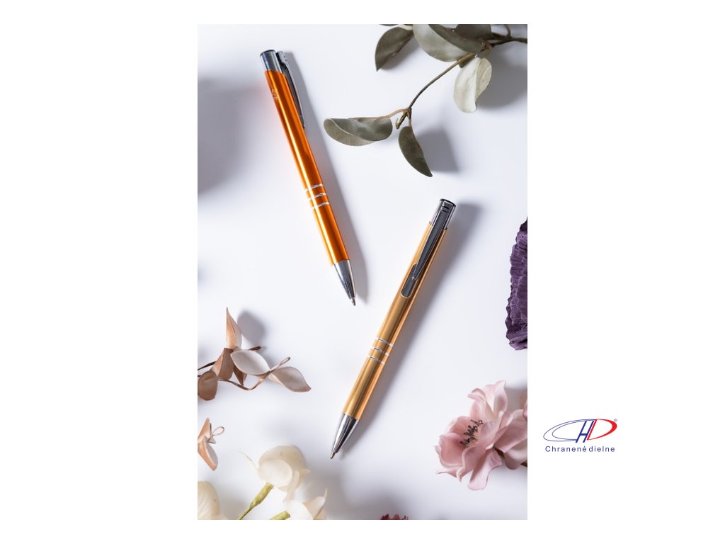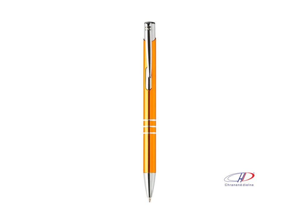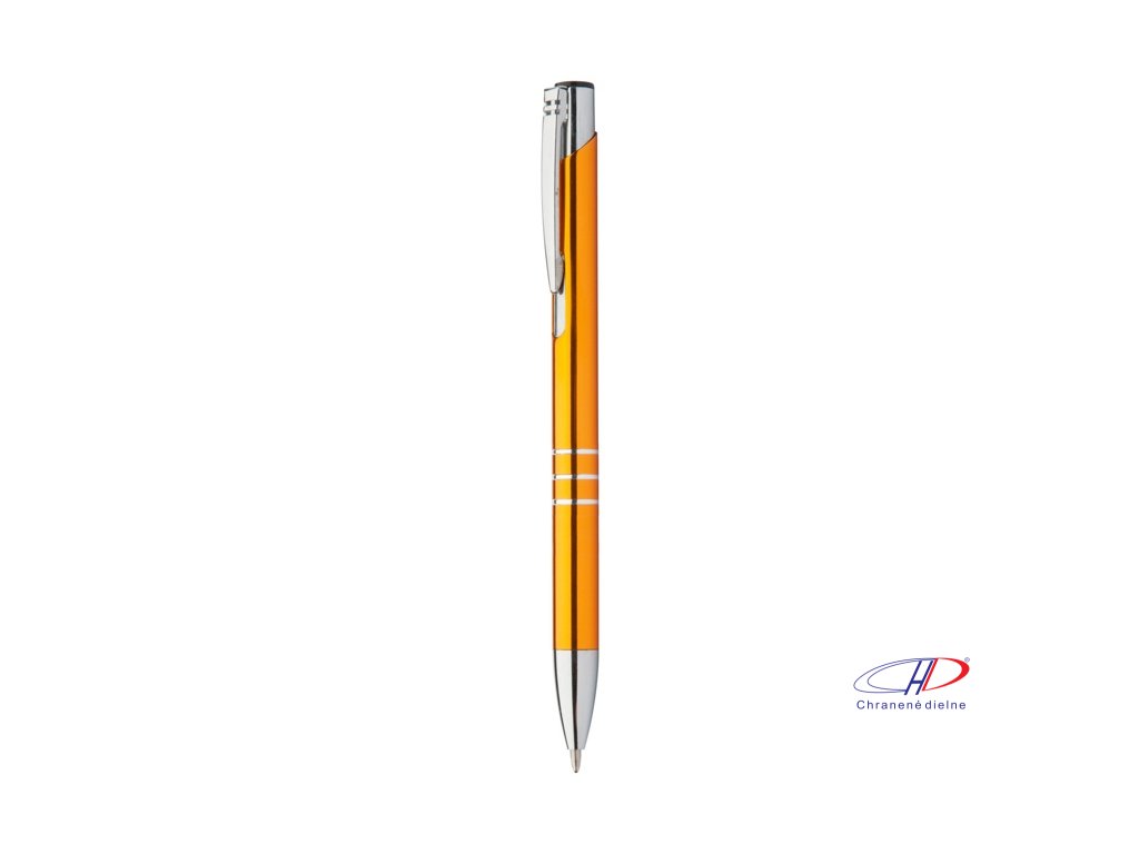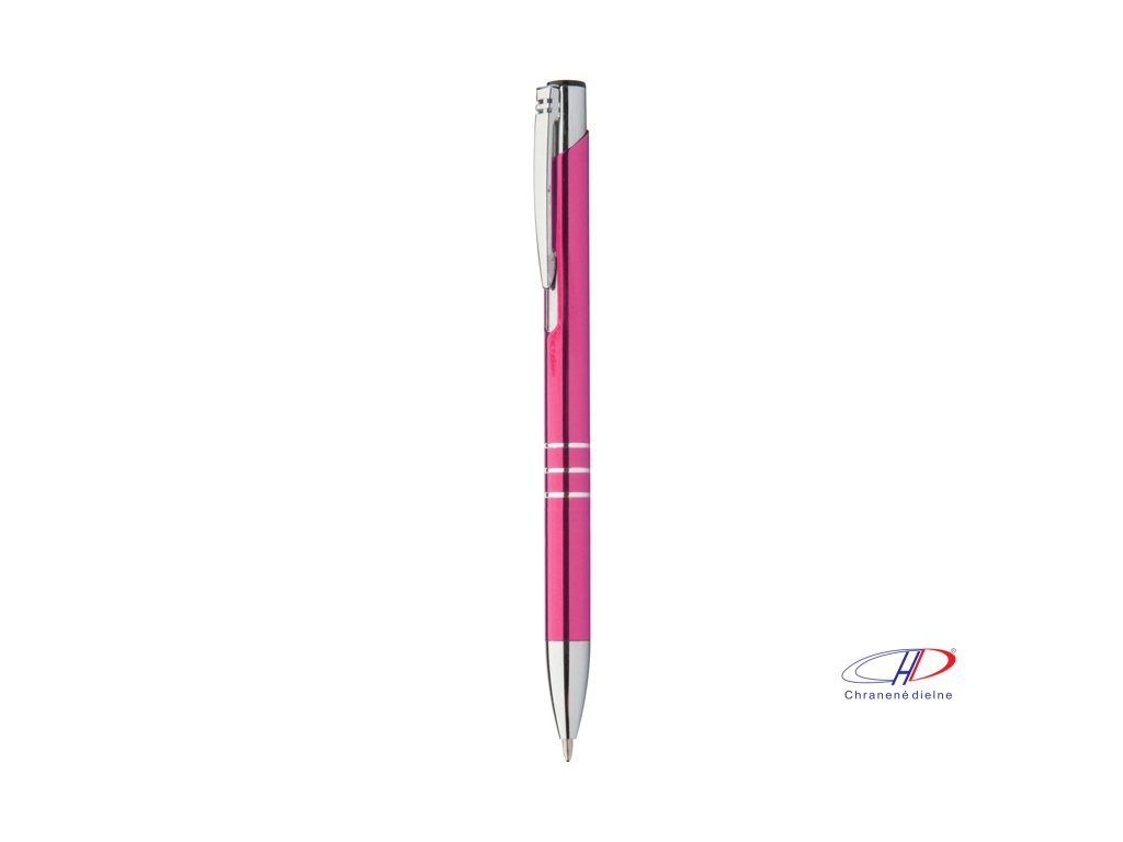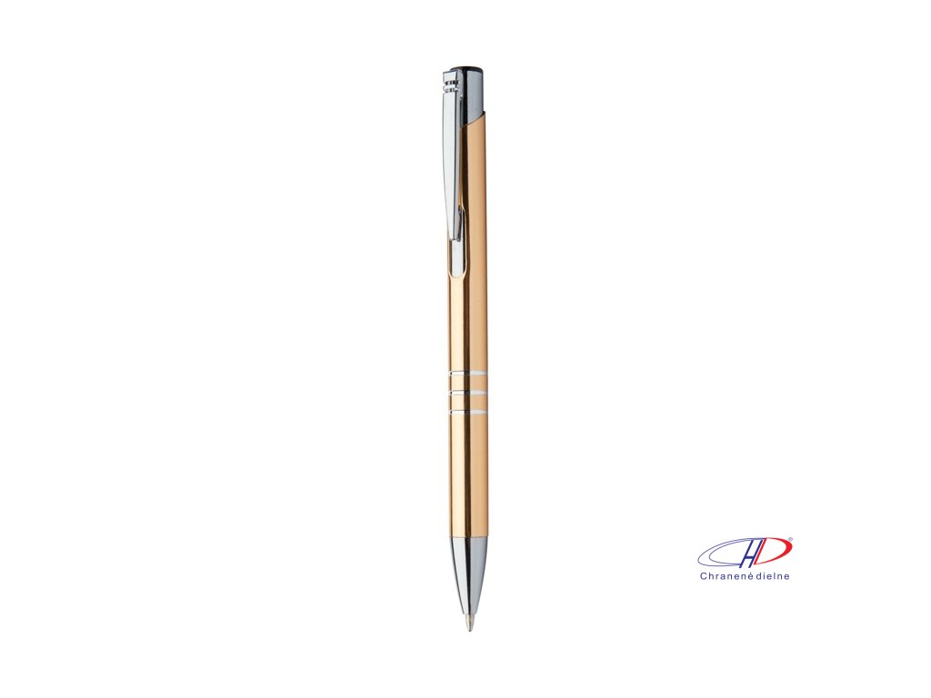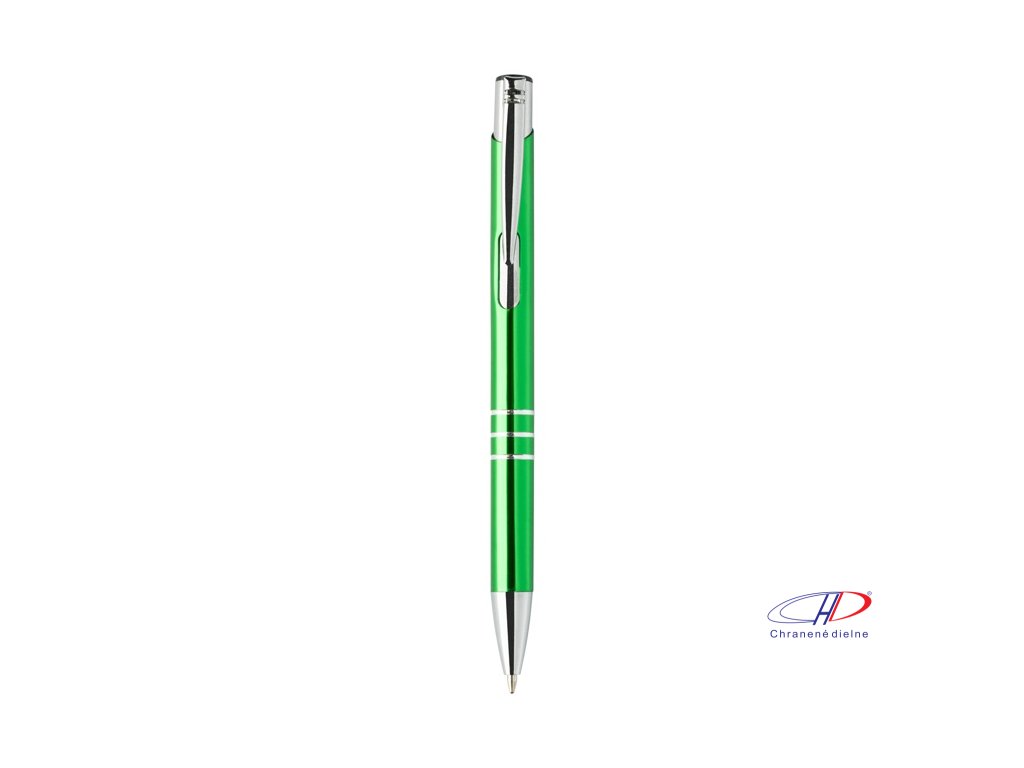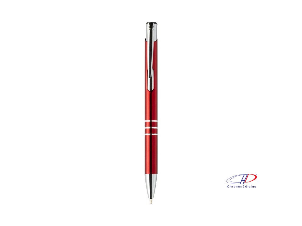 Guľôčkové pero z recyklovaného hliníka s metalickým povrchom a modrou náplňou.