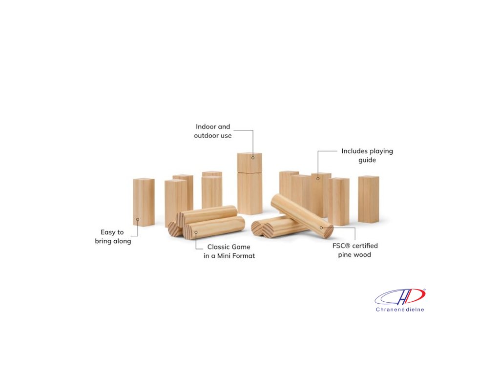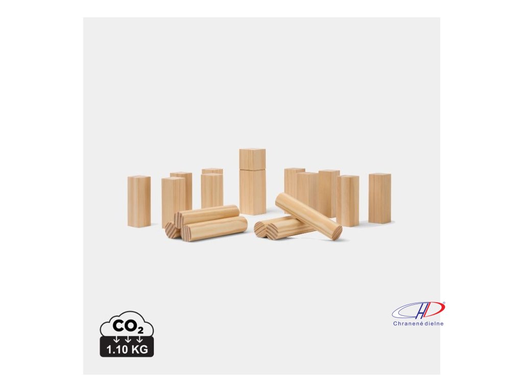 Súprava obsahuje jedného kráľa, desať kubbov a šesť hádzacích kolíkov. Cieľom hry je zraziť 5 súperových kubbov a potom zvrhnúť kráľa a vyhrať hru. Hra je zabalená v plátennej taške. Súčasťou balenia je leták s návodom.Dodatočné parametre