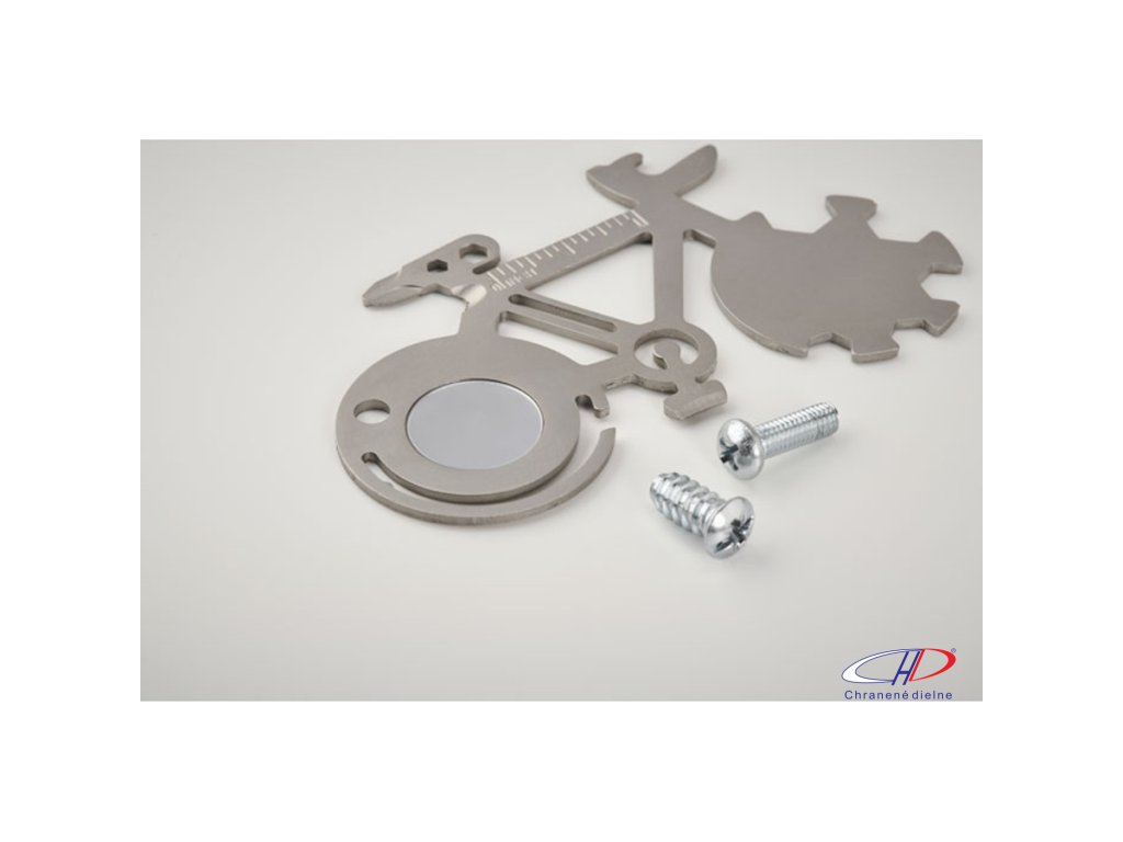 Multifunkční nářadí 11v1 z nerezové oceli ve tvaru jízdního kola. Otvírák na lahve, nůž, pravítko nebo křížový šroubovák a další.Dodatočné parametre
