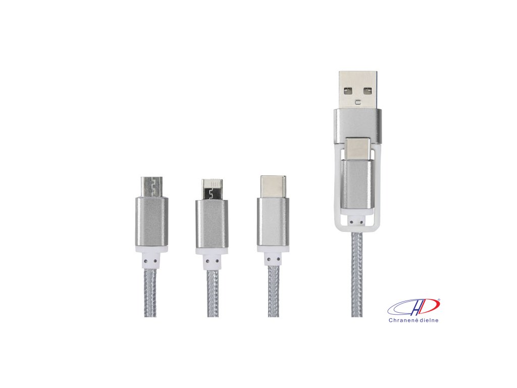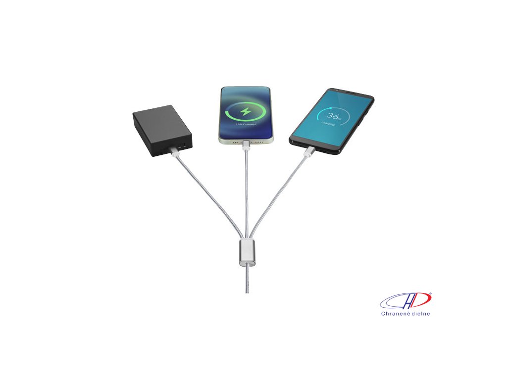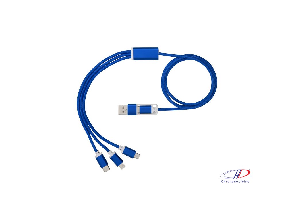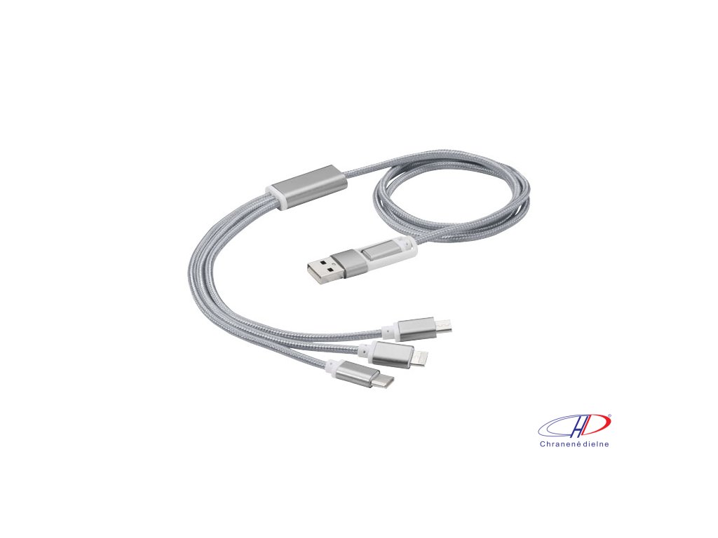 Opletený nylonový nabíjací kábel s 5 rôznymi konektormi: Vstup USB-C, vstup USB-A, výstup USB-C, výstup Apple® iOS a výstup micro USB. Vďaka tomu je možné kábel používať tiež so zariadeniami s výstupom USB-C, ktorý býva súčasťou novej generácie telefónovDodatočné parametre