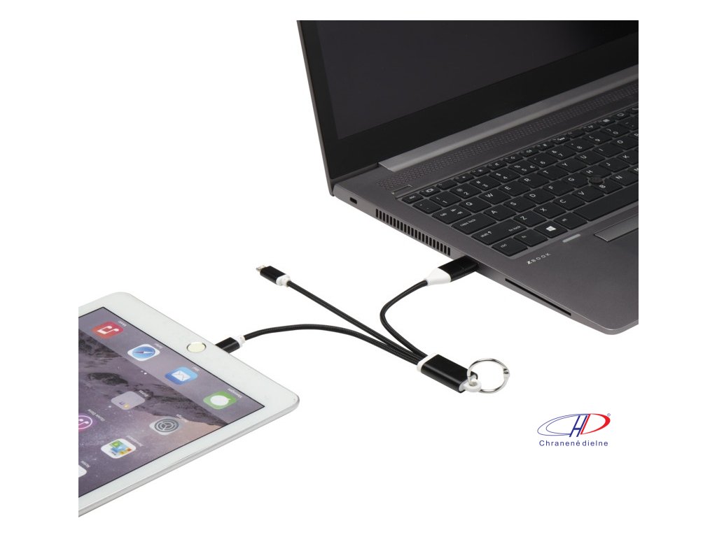 Nabíjací kábel s kľúčenkou 4v1, max. výkon 10W. Vďaka vstupným konektorom USB-A a USB-C v kombinácii s kombinovanými výstupnými konektormi typu C a Lightning/Micro USB môžete nabíjať väčšinu smartfónov, powerbánk a slúchadiel.Dodatočné parametre
