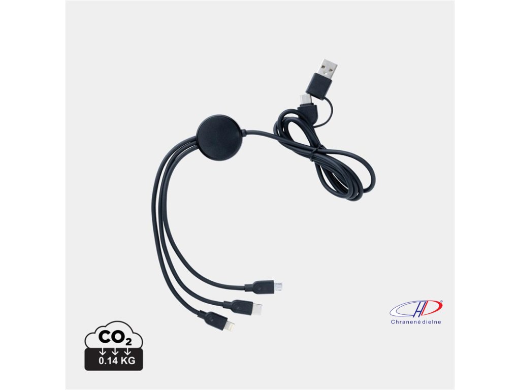 Nabíjací kábel 6 v 1. Puzdro z rec ABS plastu s RCS certifikáciou, kábel z rec TPE. Podiel recyklovaného materiálu: 57%. 5 konektorov: USB C/USB A vstup, USB C/micro USB/iOS výstup. Bez PVC. Balené v FSC krabičke.Dodatočné parametre