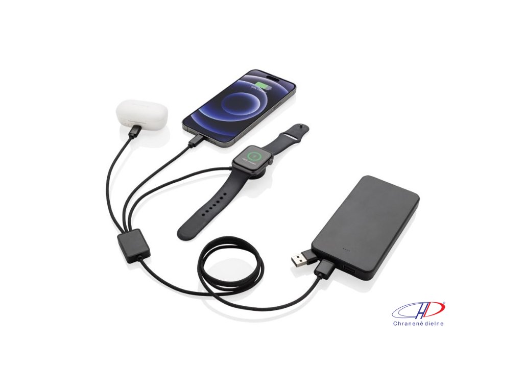 S duálnym vstupným konektorom: USB A a typ C. S dvojitým výstupným konektorom: Ponúka celkom 6 možností nabíjania. 2,5 W nabíjačka hodiniek (kompatibilná s Apple Watch a Samsung). Súčasťou je kábel s dĺžkou 120 cm. Podporuje nabíjanie do 5V/2A. PVC free.Dodatočné parametre