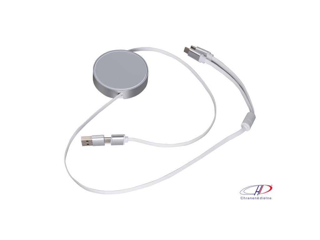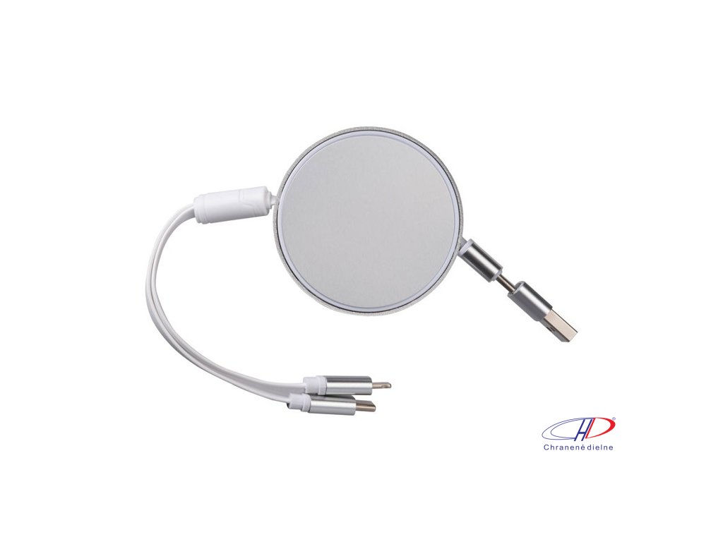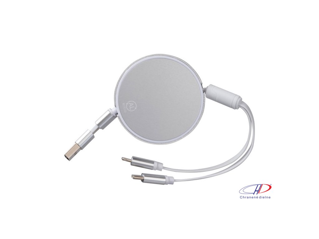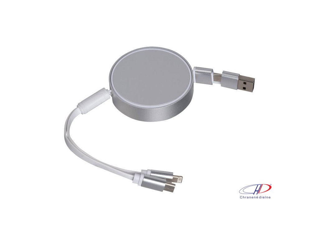 Nabíjací kábel s USB konektorom na zadnej strane a portami pre zariadenia USB-C a iOS. Vyrobený z recyklovaného hliníka, kombinuje moderný dizajn s eleganciou. Ideálny na používanie na cestách.Dodatočné parametre