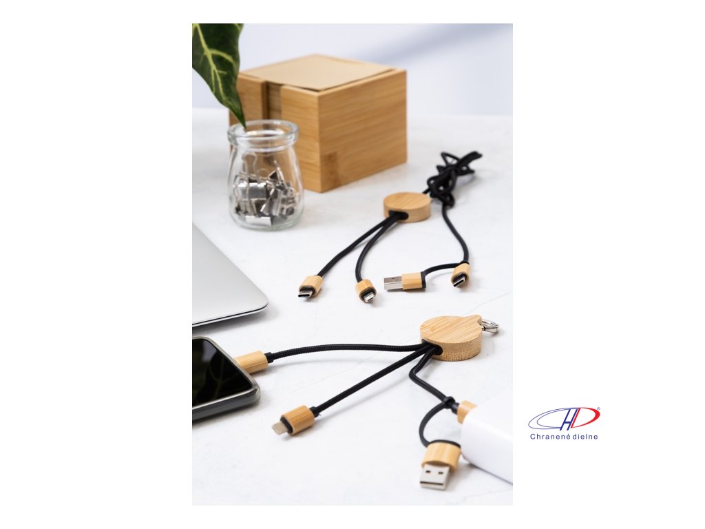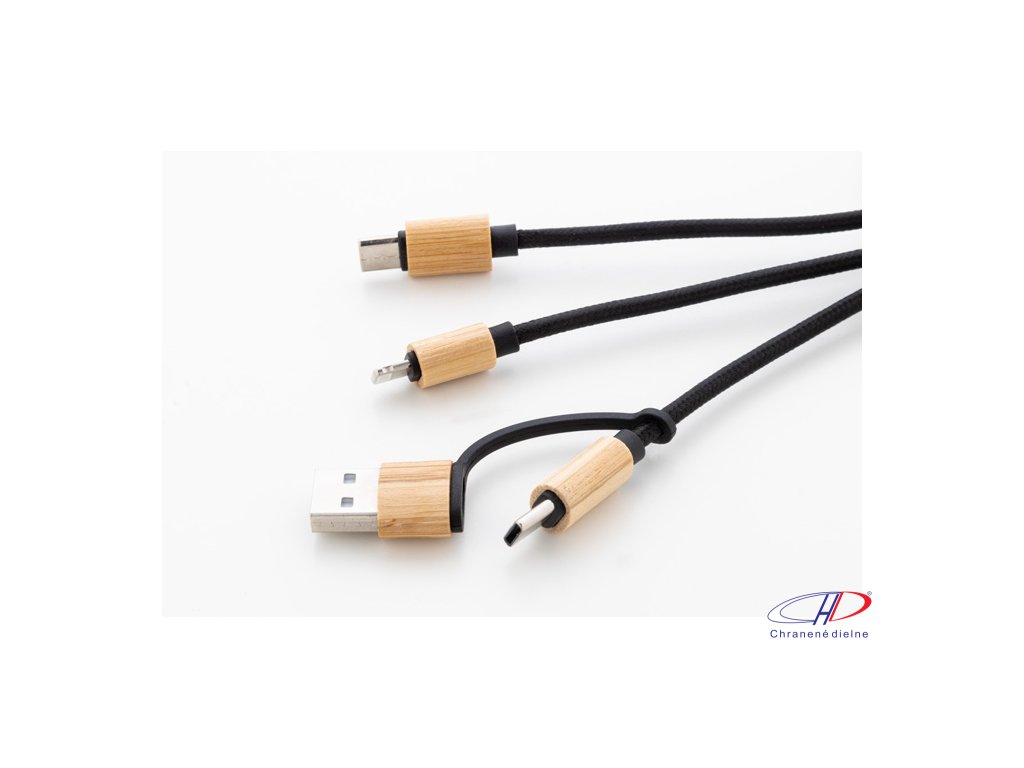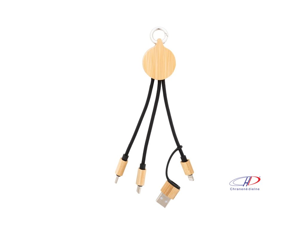 RPET a bambusový USB nabíjací kábel s krúžkom na kľúče. S konektormi micro USB, USB-C a Lightning. So vstupmi USB a USB-C.Dodatočné parametre