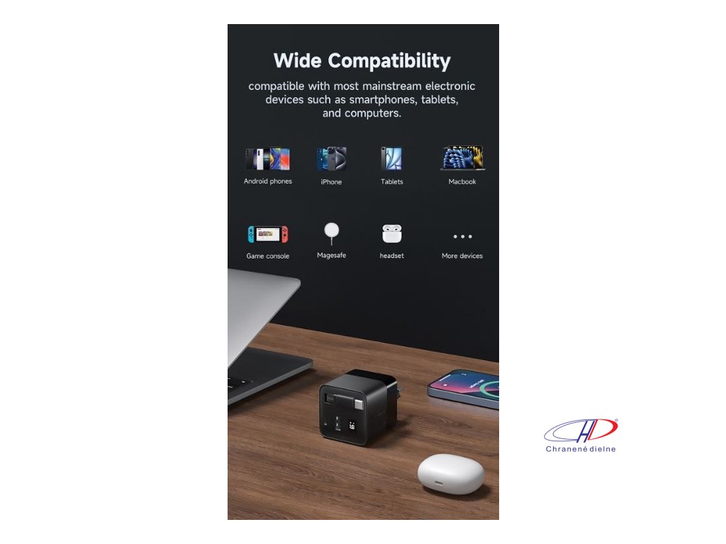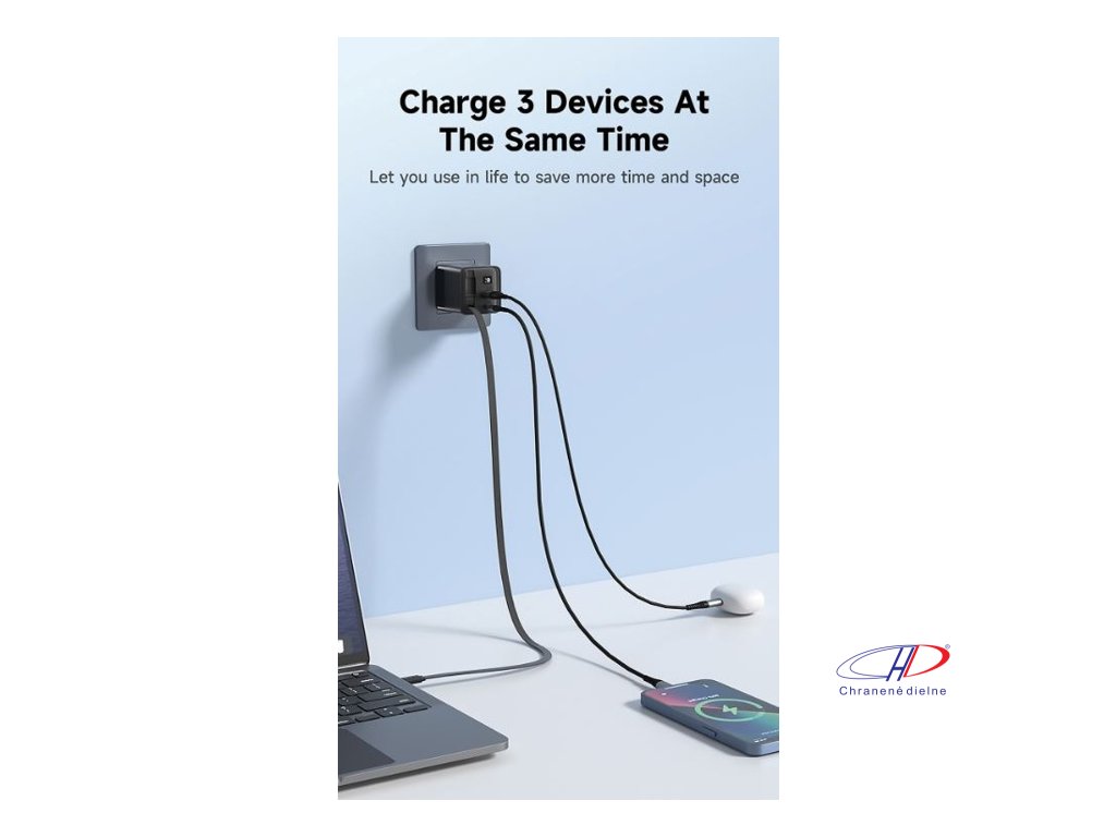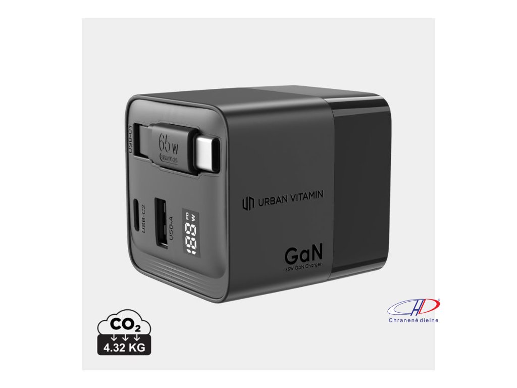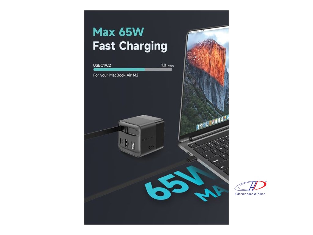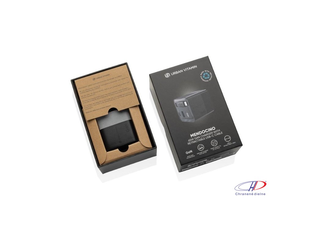 65W PD GaN nabíjačka s 80 cm navíjacím USB-C káblom. Vymeniteľné zástrčky pre EÚ a UK. Nabíja všetky vaše zariadenia plnou rýchlosťou vrátane laptopov, tabletov a telefónov – dokáže nabíjať 3 zariadenia naraz. PVC free.Dodatočné parametre