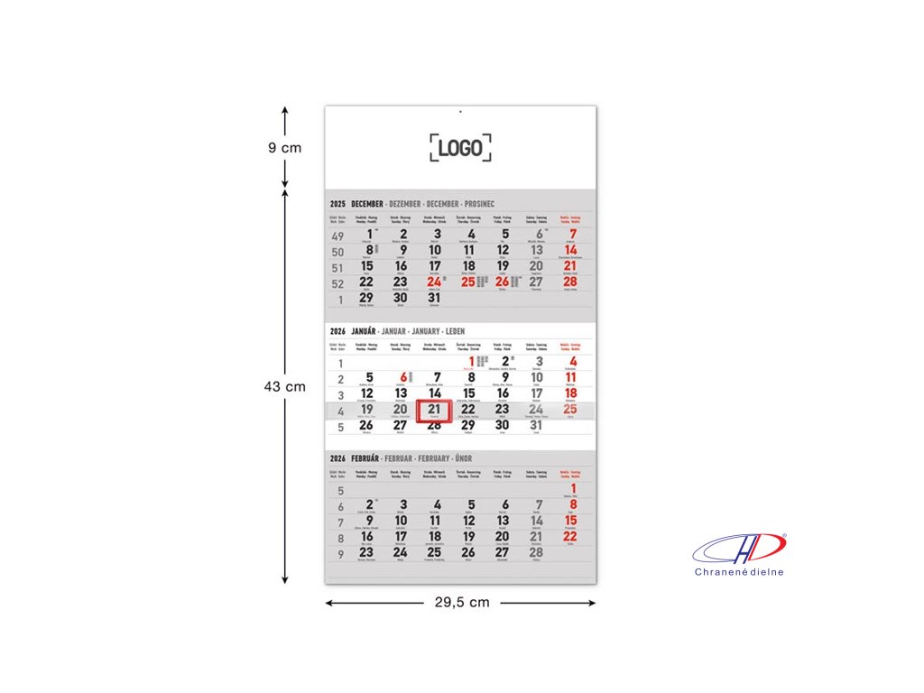 MINIMÁLNY ODBER 3 kusy. Väzba: šitá V3. Kalendárium: CZ/SK/DE/GB. 12 listov. Praktický plánovací kalendár s trojmesačným rozložením a orientačnou lištou s posuvným jazdcom. Obsahuje kalendárium so slovenskými menami a svetovými sviatkami na šedom pozadíDodatočné parametre