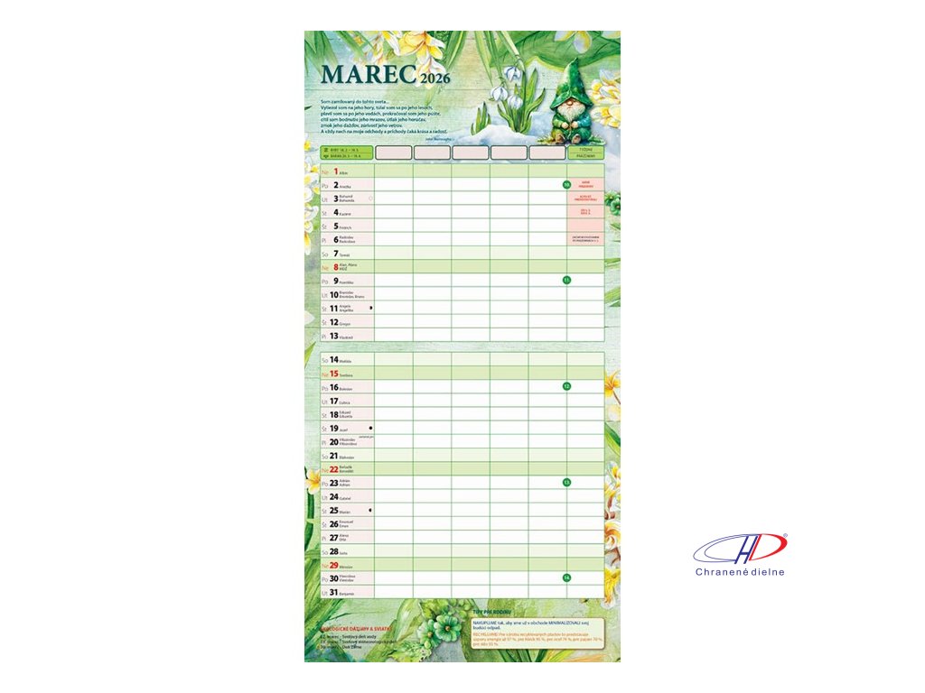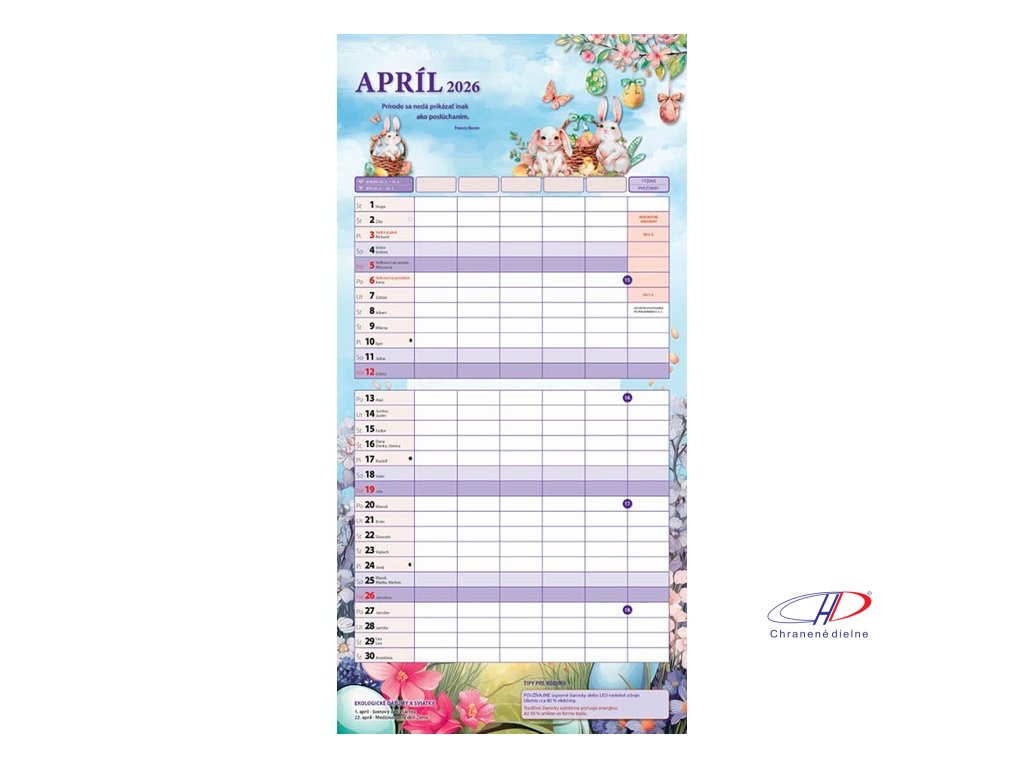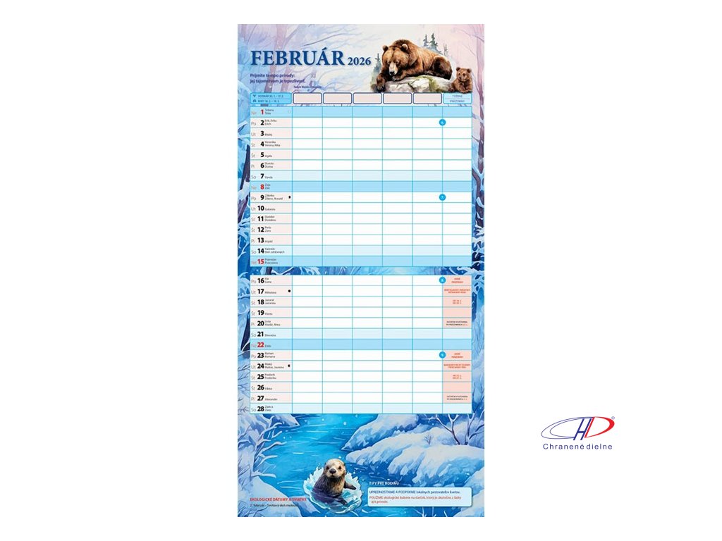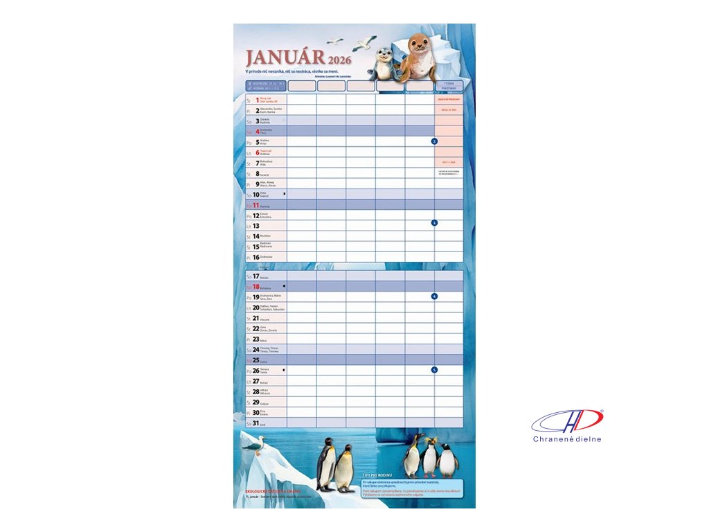 Každý mesiac je doplnený o ilustrácie, inšpiratívne mottá, ekologické dátumy a sviatky, tipy pre rodinu, prázdniny. Súčasťou sú aj samolepky s emotikonmi a piktogramami. Kalendár obsahuje aj pero. Kalendárium: SK. Rozsah: 14 listov.Dodatočné parametre