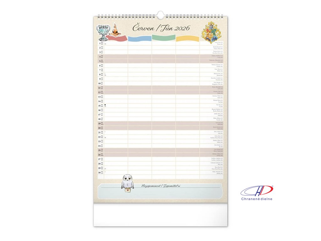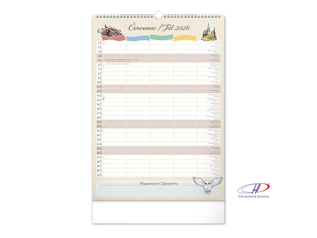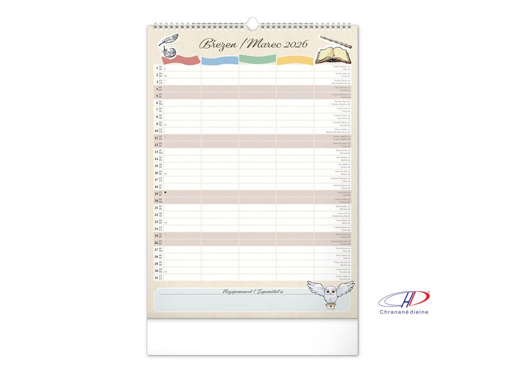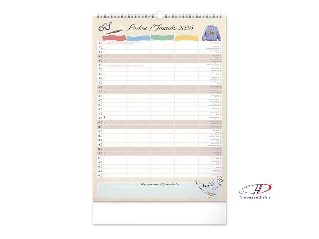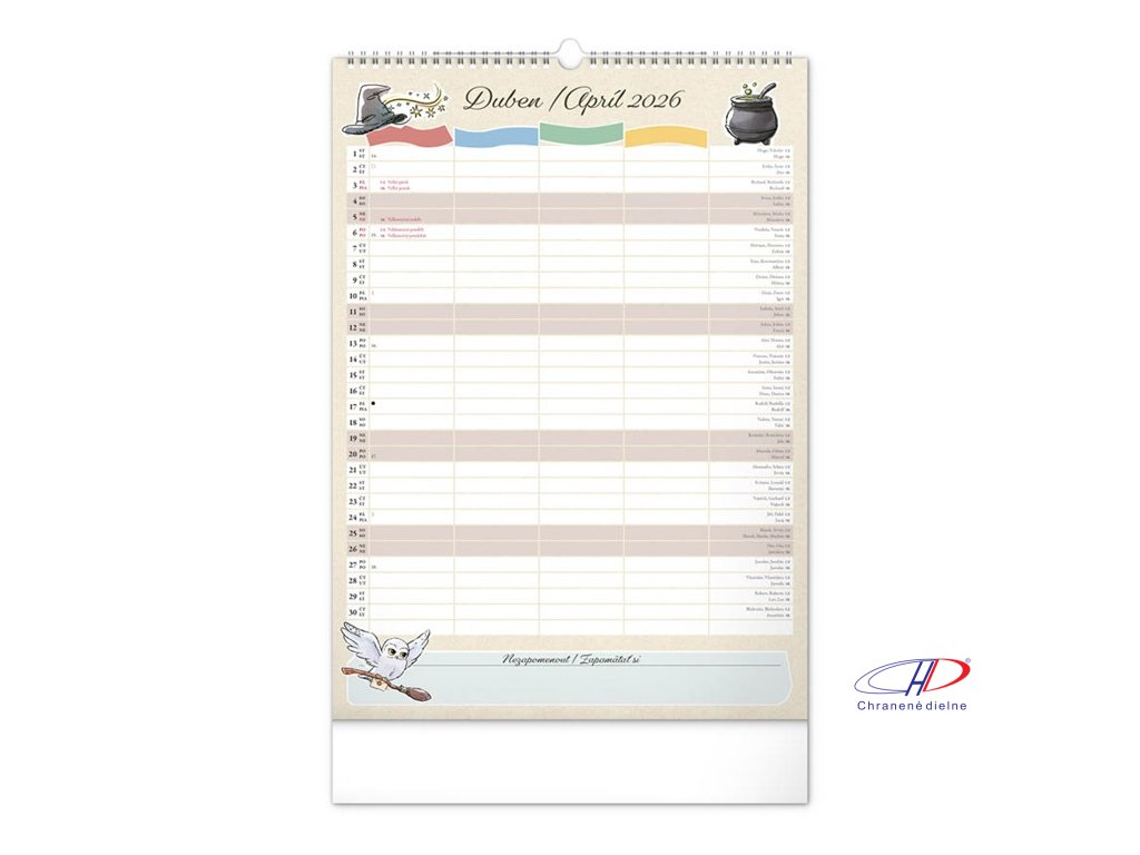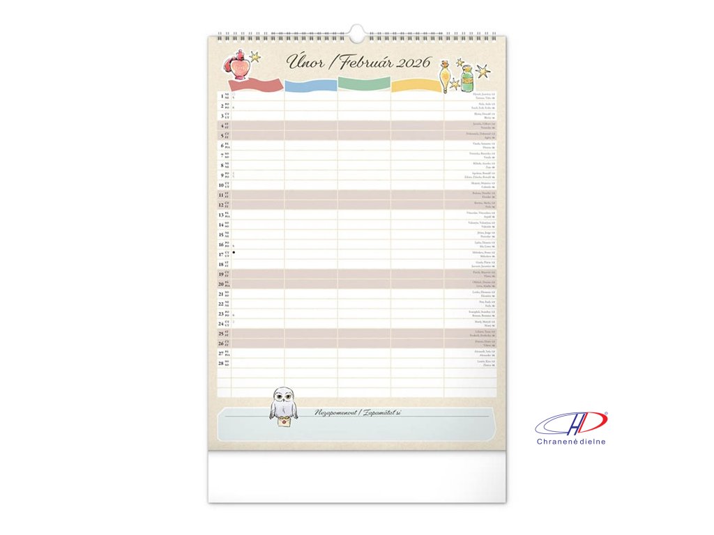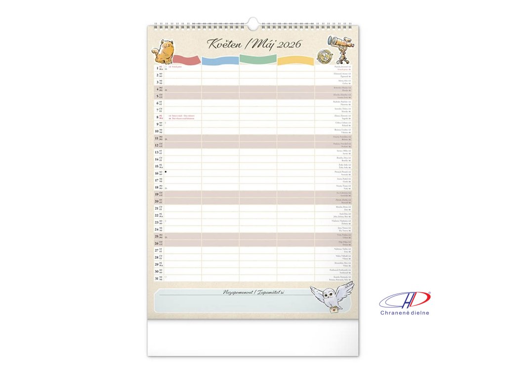 MINIMÁLNY ODBER 1 kus. Väzba: dvojitá špirála. Kalendárium: CZ/SK. 14 listov. Kalendár má české a slovenské kalendárium a samostatný plánovač až pre štyroch členov domácnosti, nechýbajú štátne sviatky ani mesačné fázyDodatočné parametre