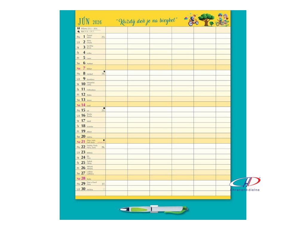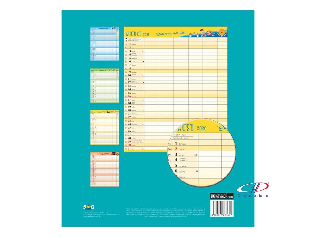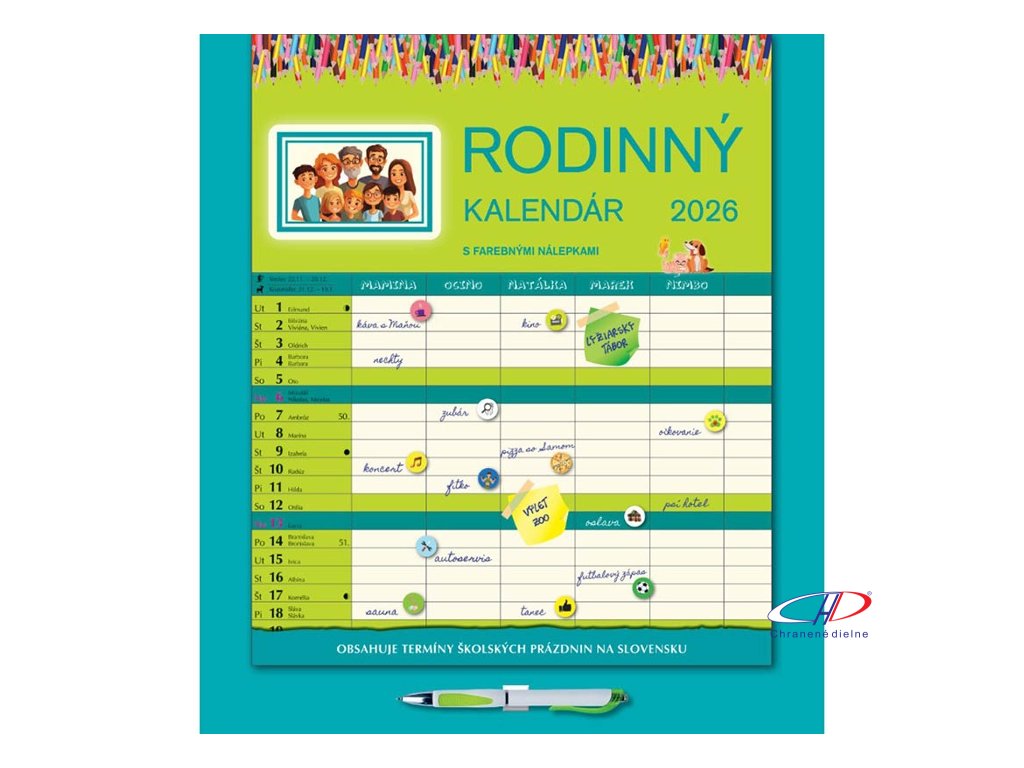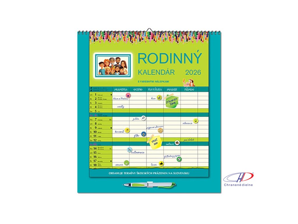 Kalendár ponúka priestor na zapisovanie aktivít celej domácnosti. Každý mesiac je doplnený o ilustrácie, mottá. Súčasťou balenia sú aj samolepky s emotikonmi a piktogramami. Kalendár obsahuje aj pero. Kalendárium: SK. Rozsah: 14 listov.Dodatočné parametre