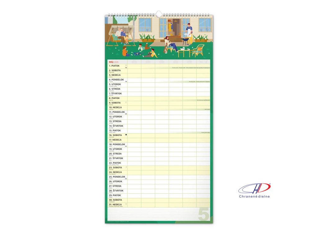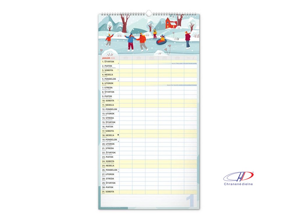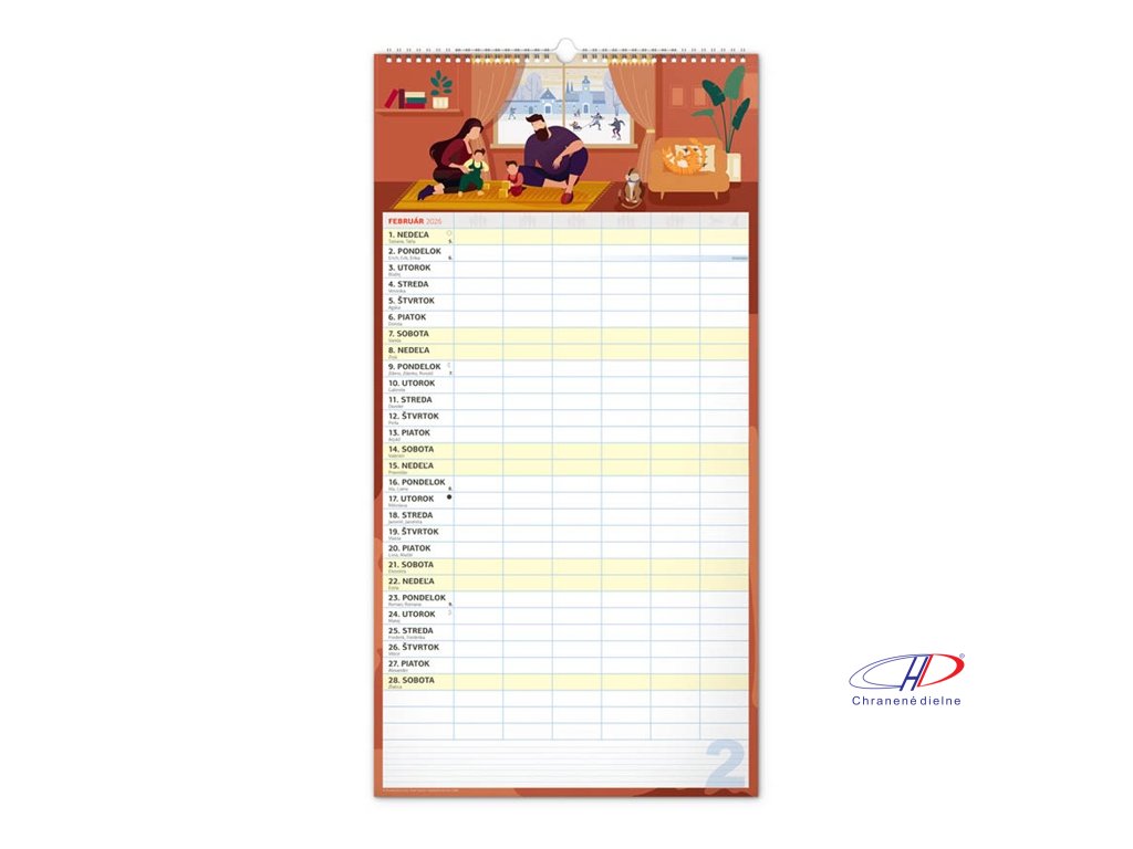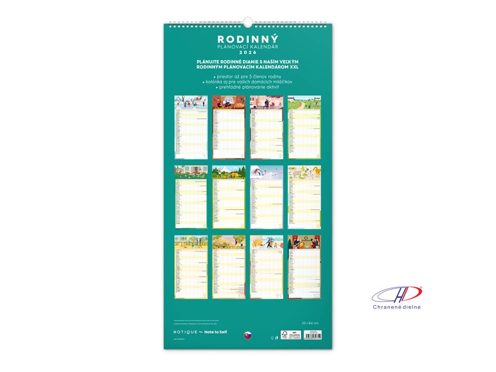 MINIMÁLNY ODBER 2 kusy. Väzba: dvojitá špirála. Kalendárium: SK. 14 listov. Slovenské kalendárium a samostatný plánovač aktivít až pre šesť členov domácnosti dopĺňajú veselé grafické motívy pre každé ročné obdobieDodatočné parametre