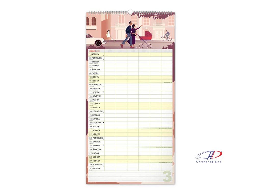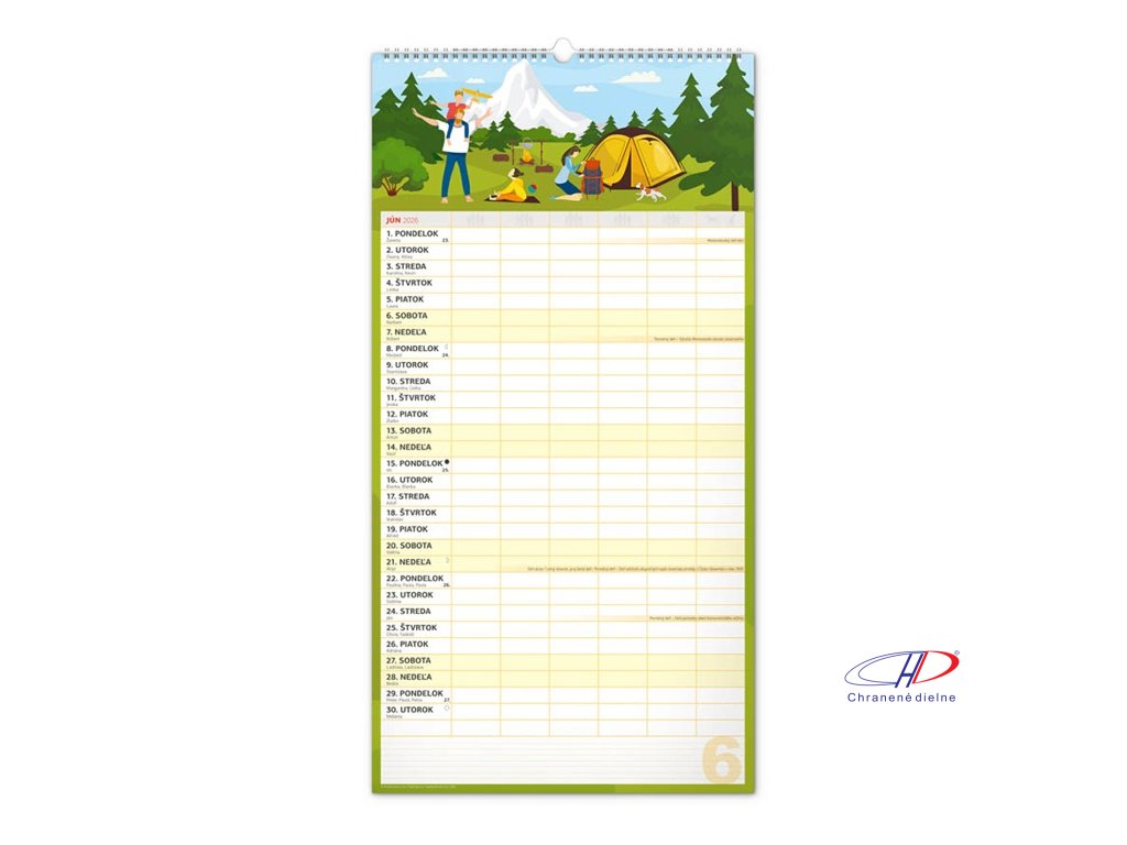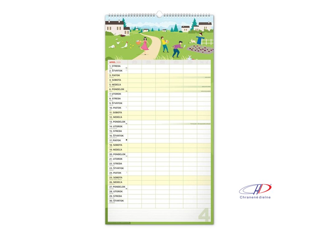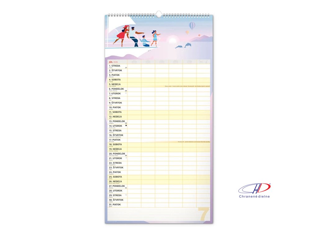 MINIMÁLNY ODBER 2 kusy. Väzba: dvojitá špirála. Kalendárium: SK. 14 listov. Slovenské kalendárium a samostatný plánovač aktivít až pre šesť členov domácnosti dopĺňajú veselé grafické motívy pre každé ročné obdobieDodatočné parametre