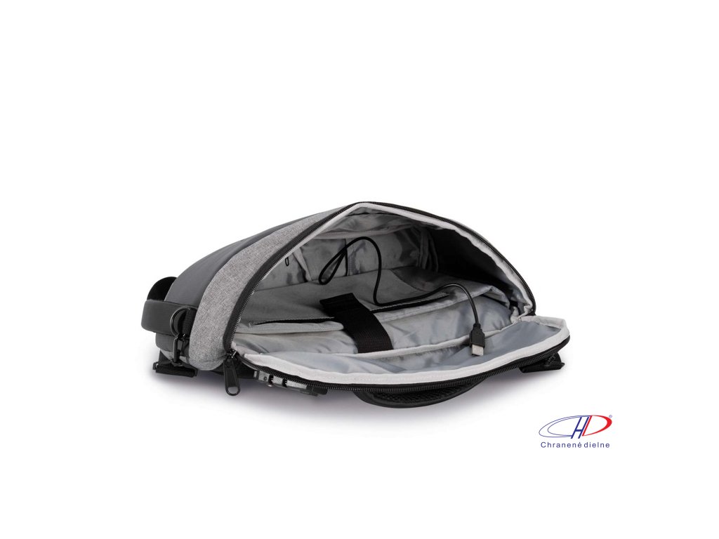 Zapínanie na zips na zadnej strane s TSA zámkom. Nastaviteľné popruhy a hrudný popruh. Viazacie popruhy pod taškou. Bočné vrecko s portom USB a vnútorným micro-USB káblom (súčasť balenia), bočné vrecko so špirálovým káblom na zabezpečenie proti krádeži.Dodatočné parametre
