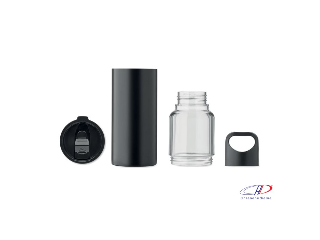 Znovu naplniteľná fľaša 2 v 1 z Tritanu a dvojstenný pohár z recyklovanej nehrdzavejúcej ocele (90 % recyklovaný a 10 % nehrdzavejúca oceľ). 2 viečka z PP materiálu. Celkový objem 610 ml, pohár 350 ml.Dodatočné parametre