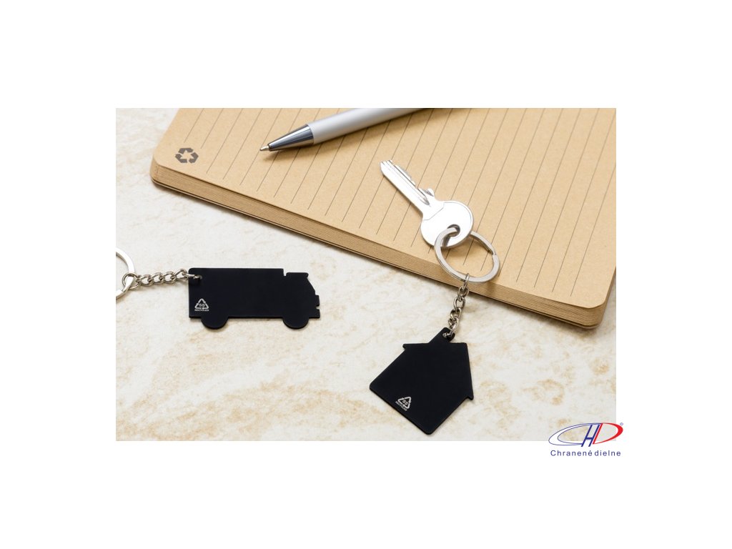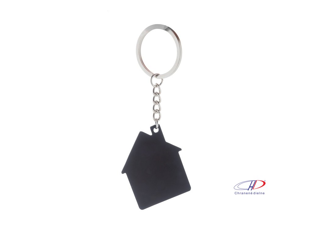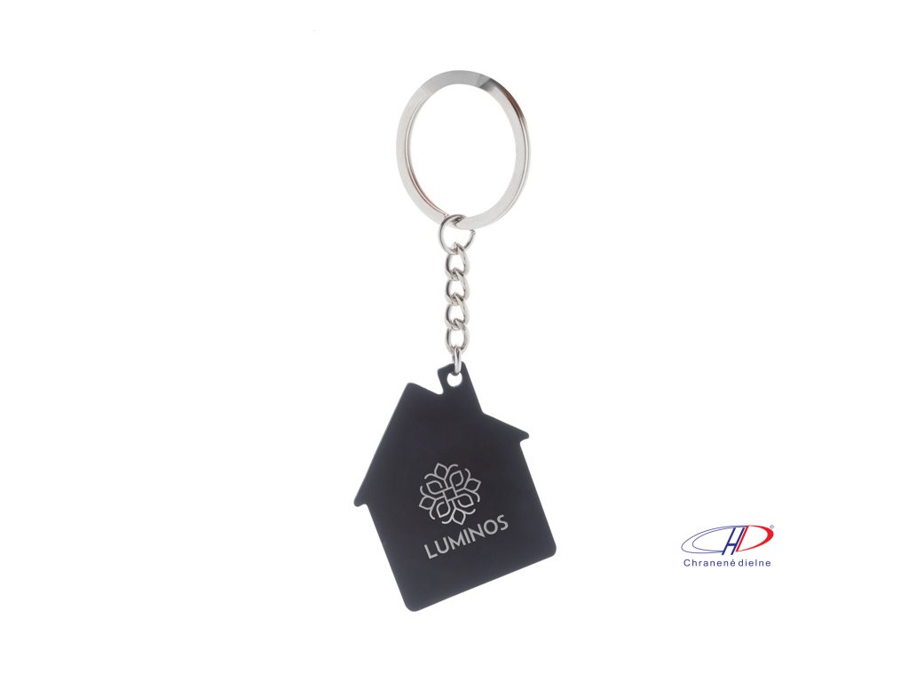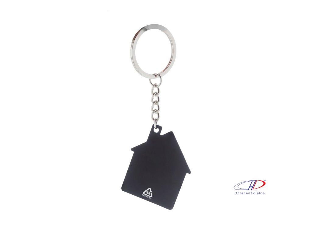 Prívesok na kľúče z recyklovanej nerezovej ocele v tvare domčeka s pogumovaným povrchom. So špeciálnou vrstvou na zrkadlové laserové gravírovanie.Dodatočné parametre