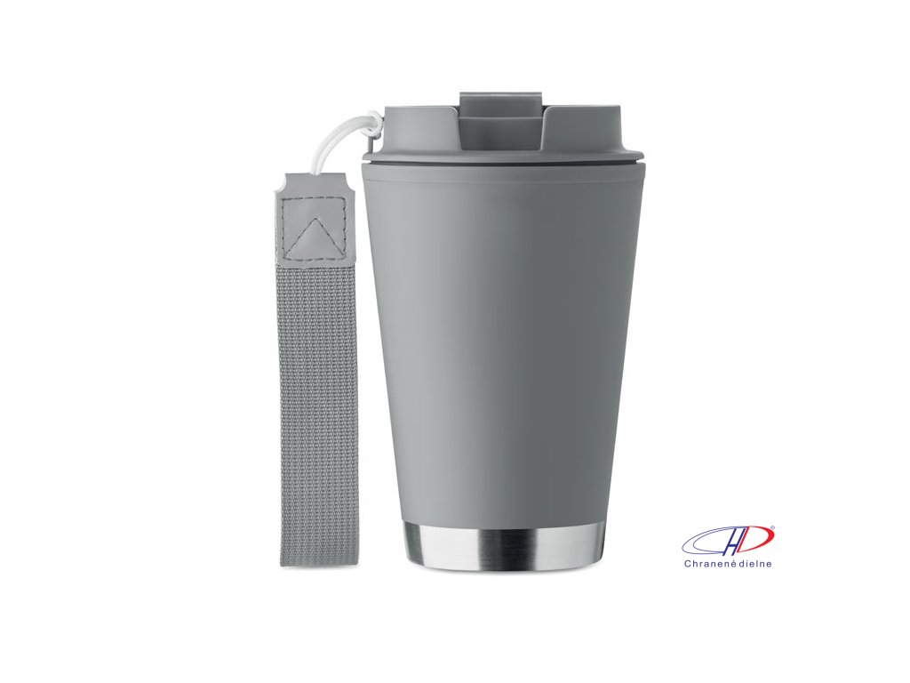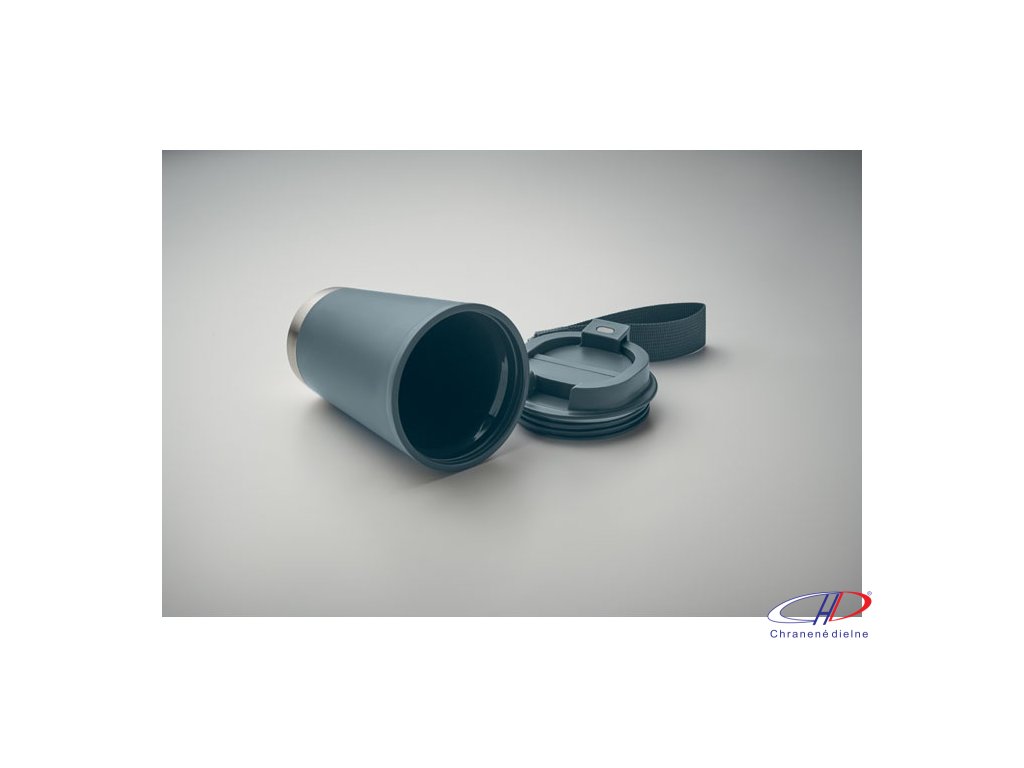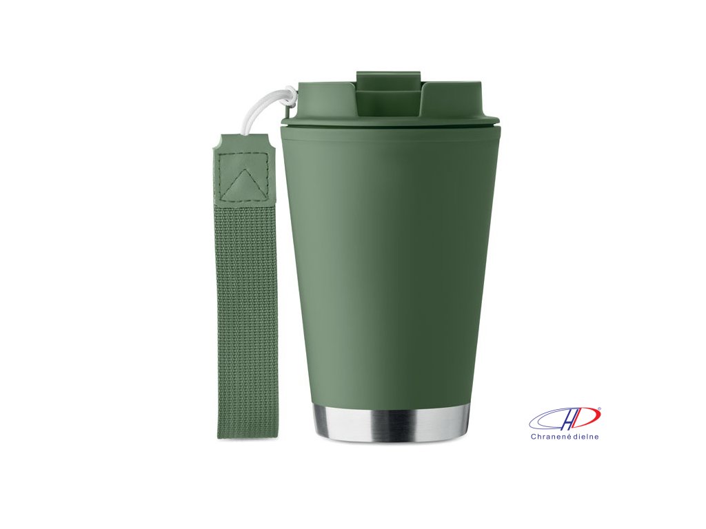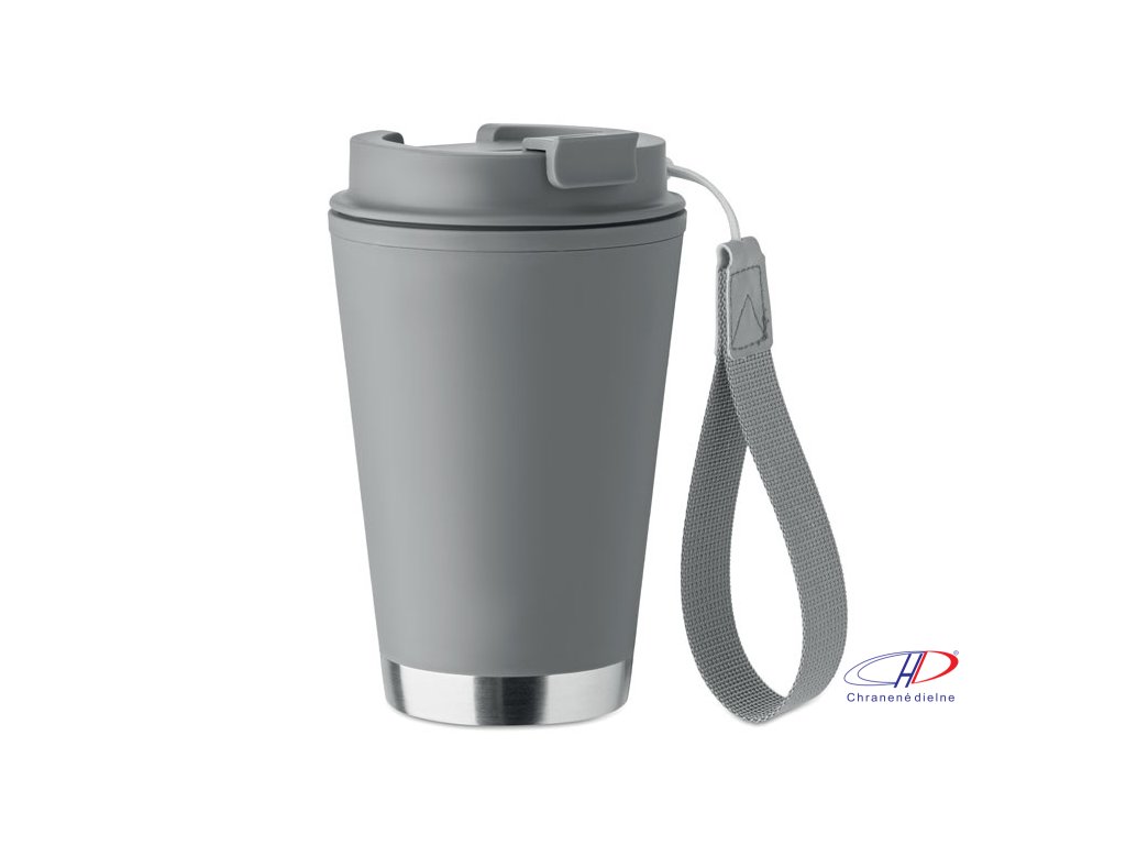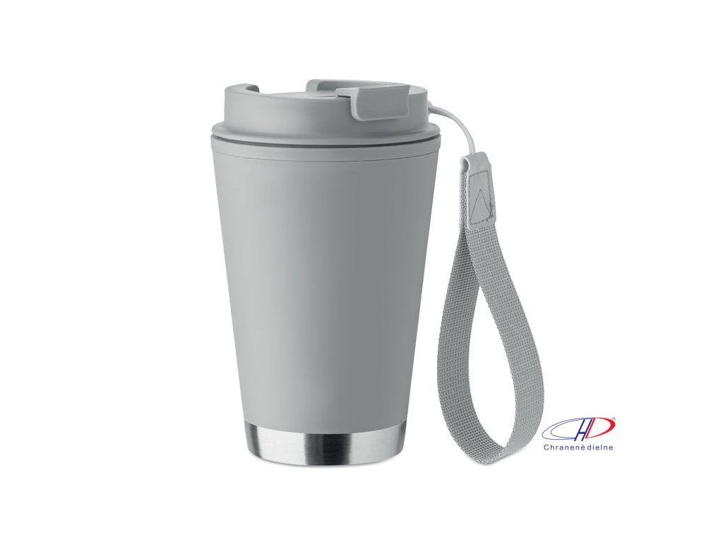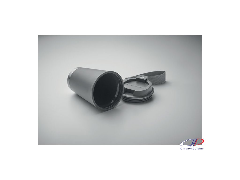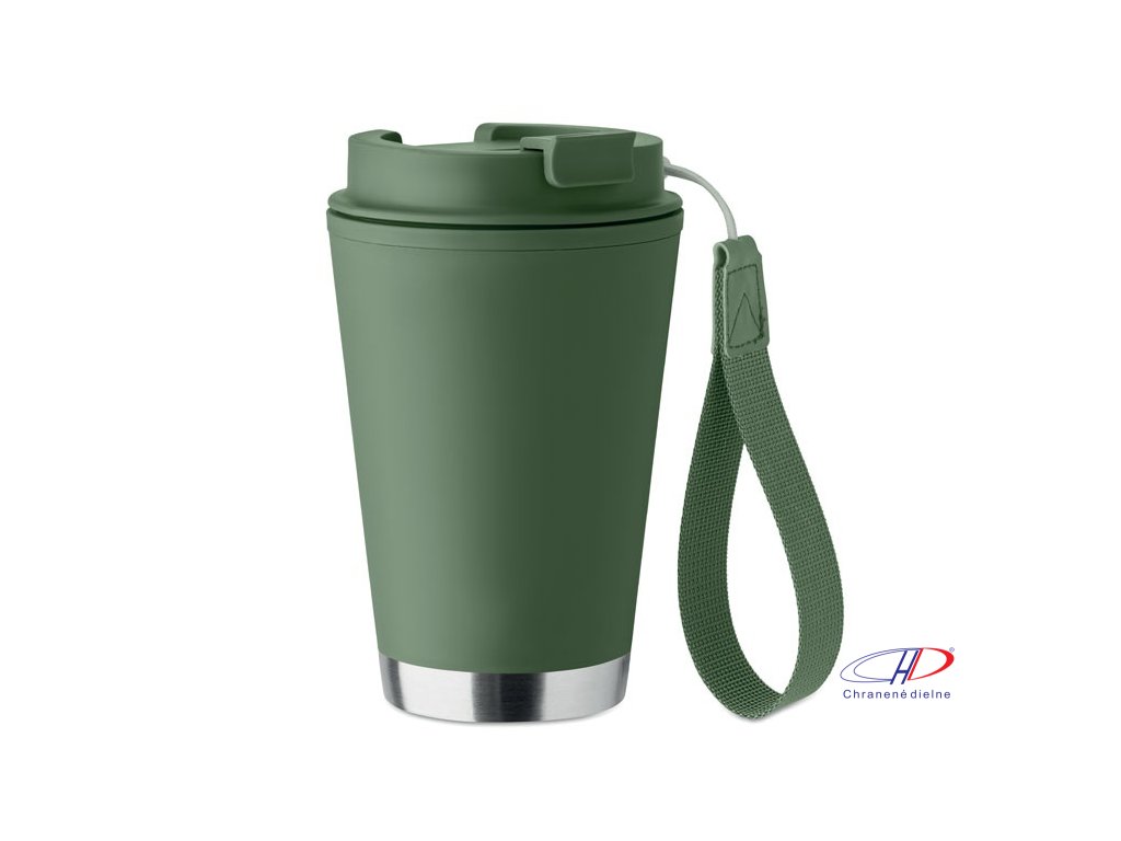 Dvojstenný termopohár s vnútornou stenou z PP plastou a vonkajšou stenou z recyklovanej nerezovej ocele. Pásik na zápästie z RPET. Objem 300 ml.Dodatočné parametre
