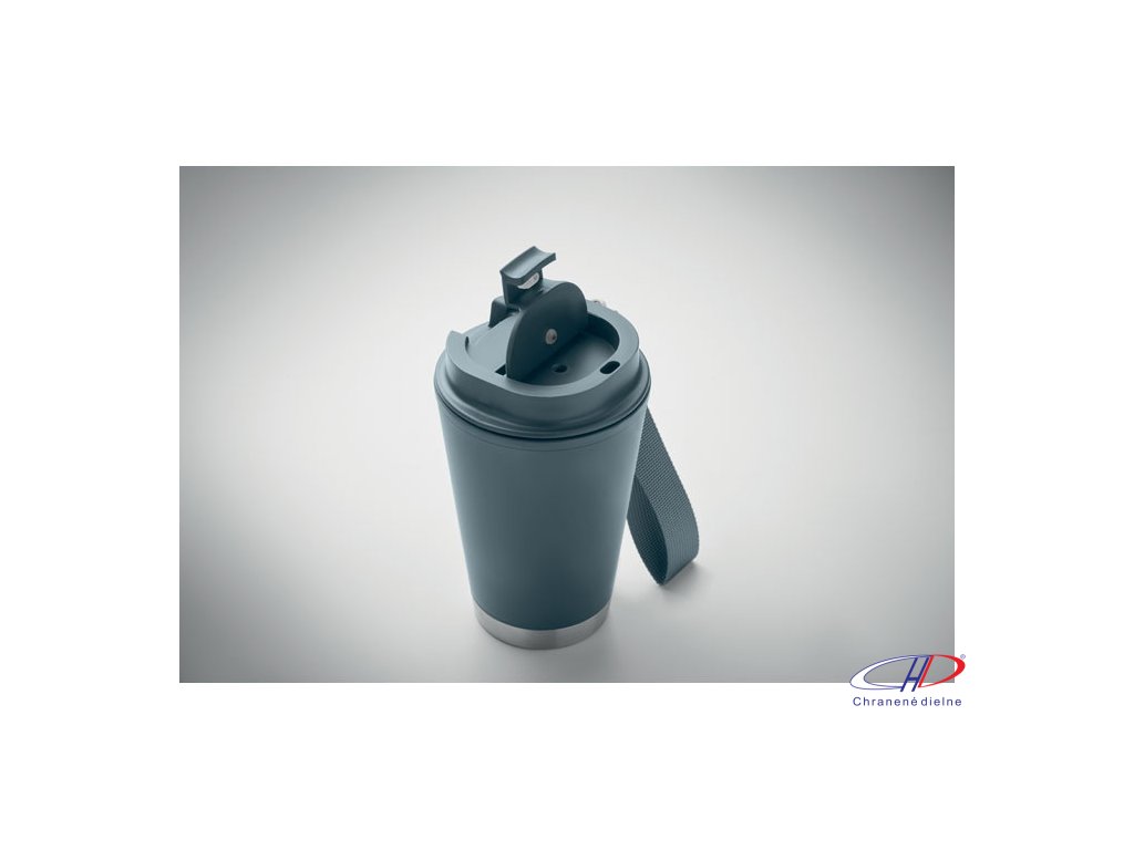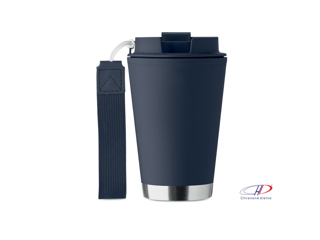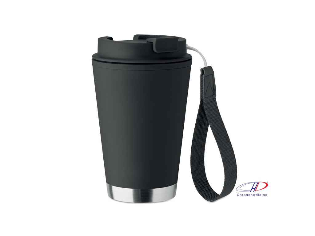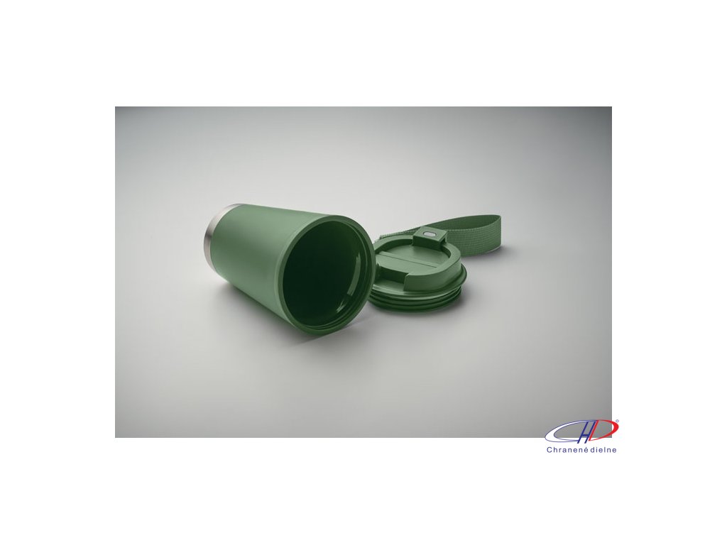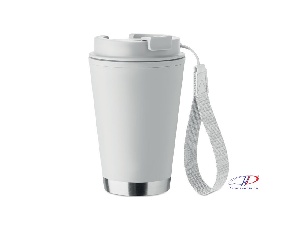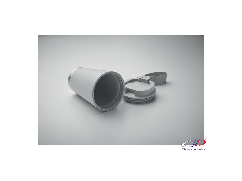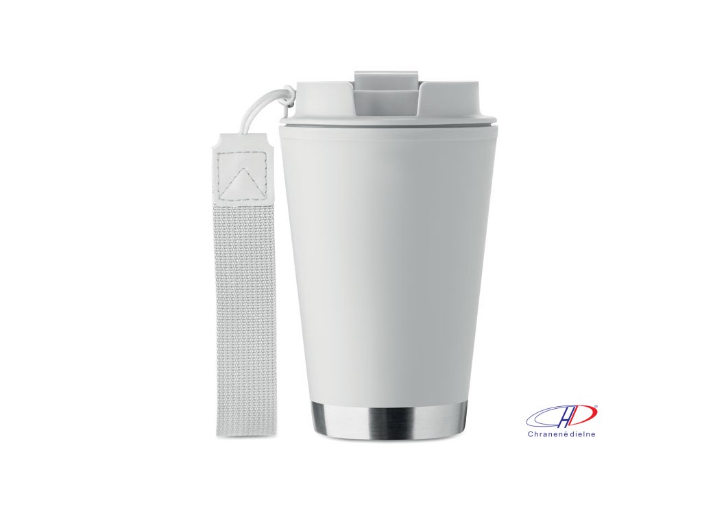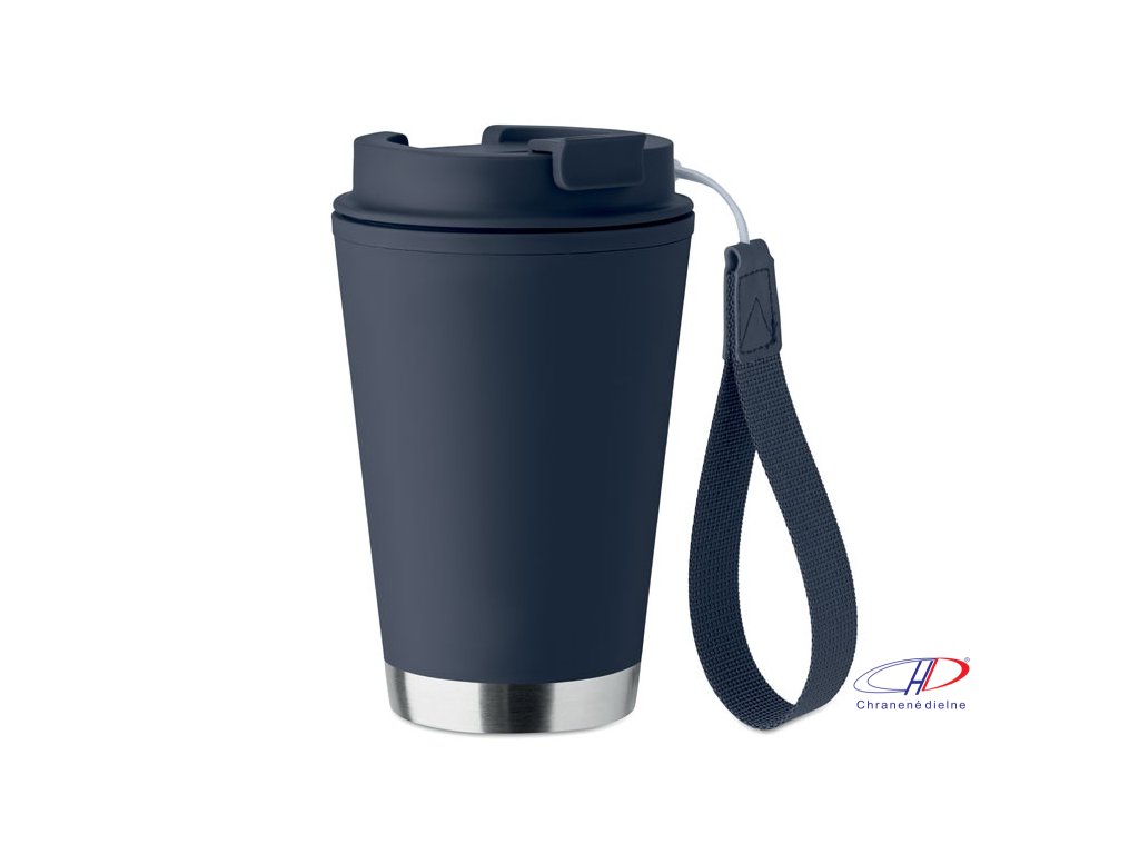 Dvojstenný termopohár s vnútornou stenou z PP plastou a vonkajšou stenou z recyklovanej nerezovej ocele. Pásik na zápästie z RPET. Objem 300 ml.Dodatočné parametre