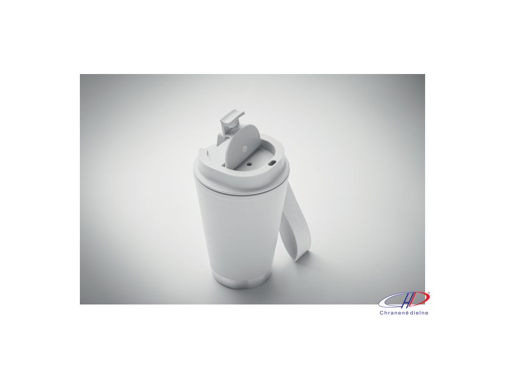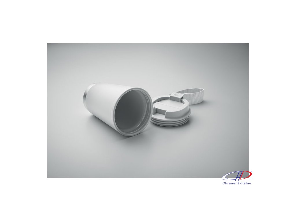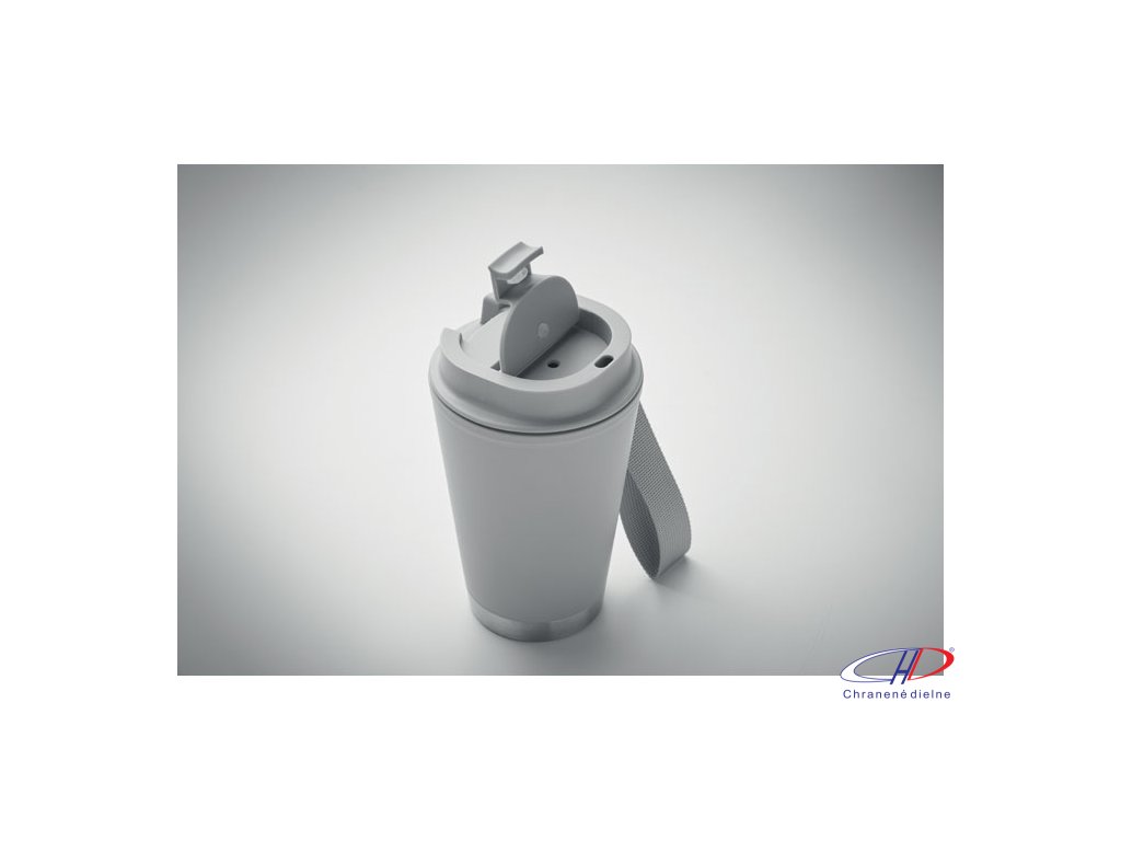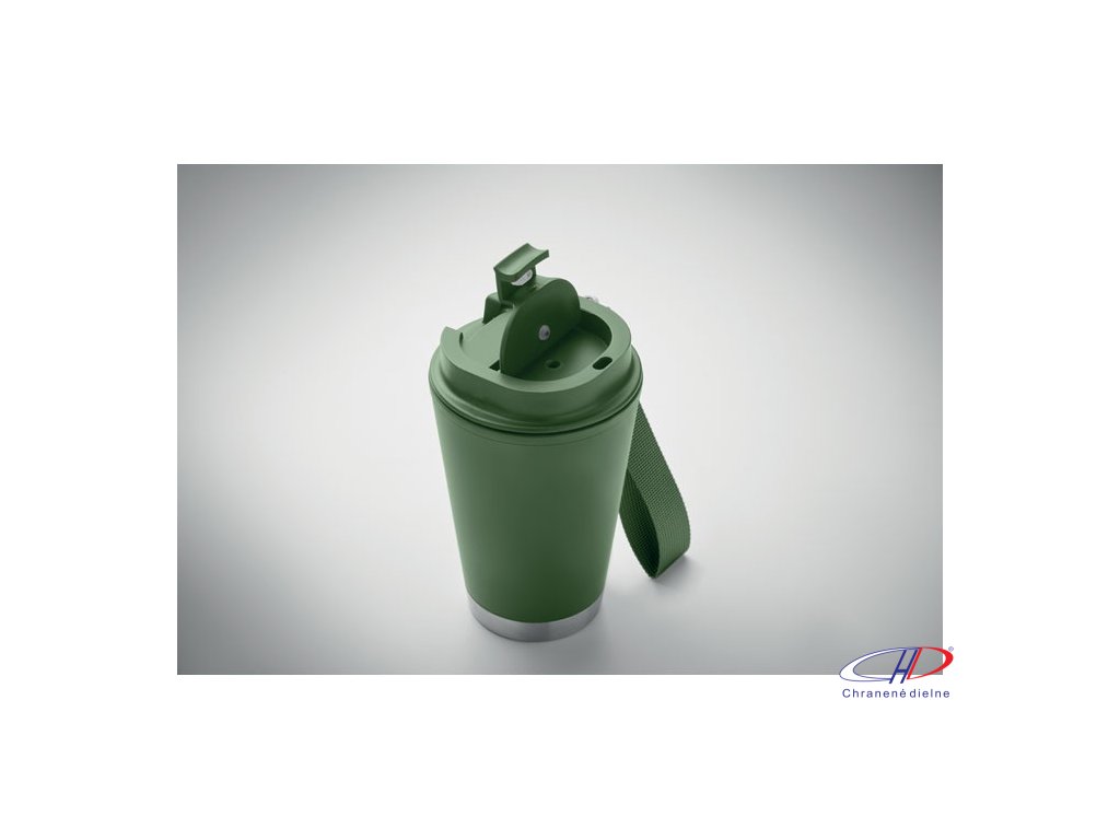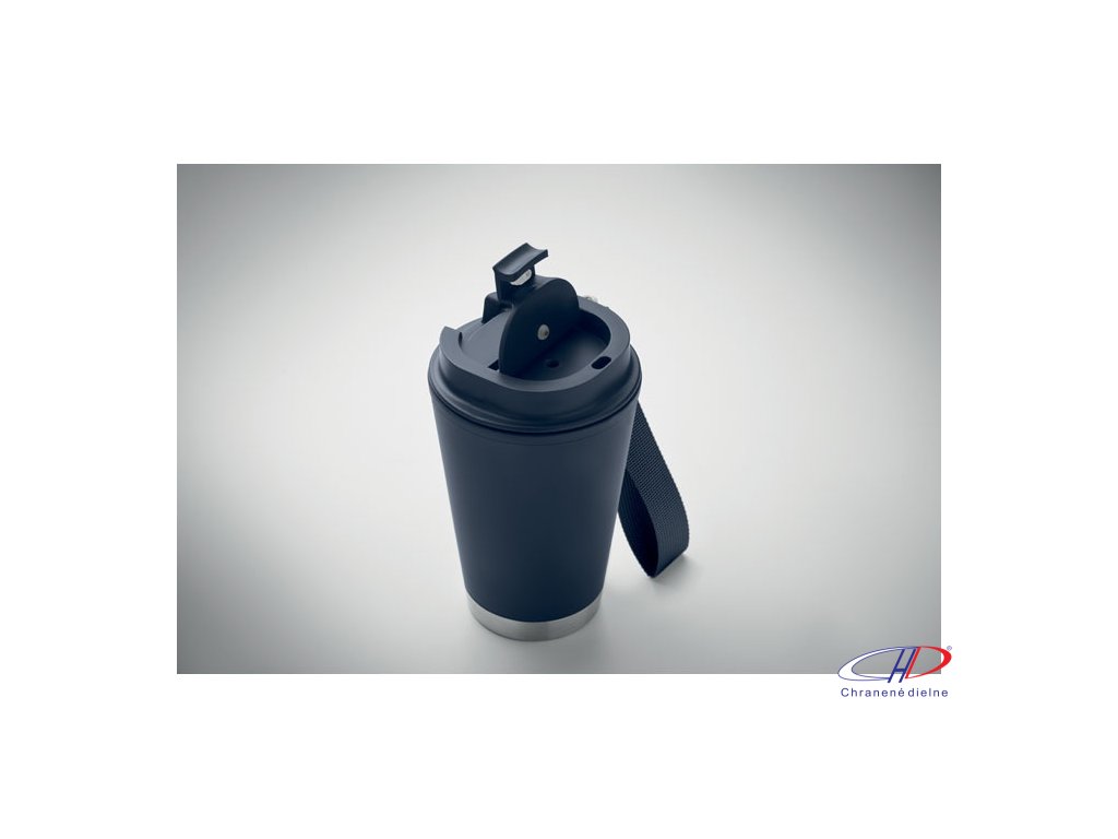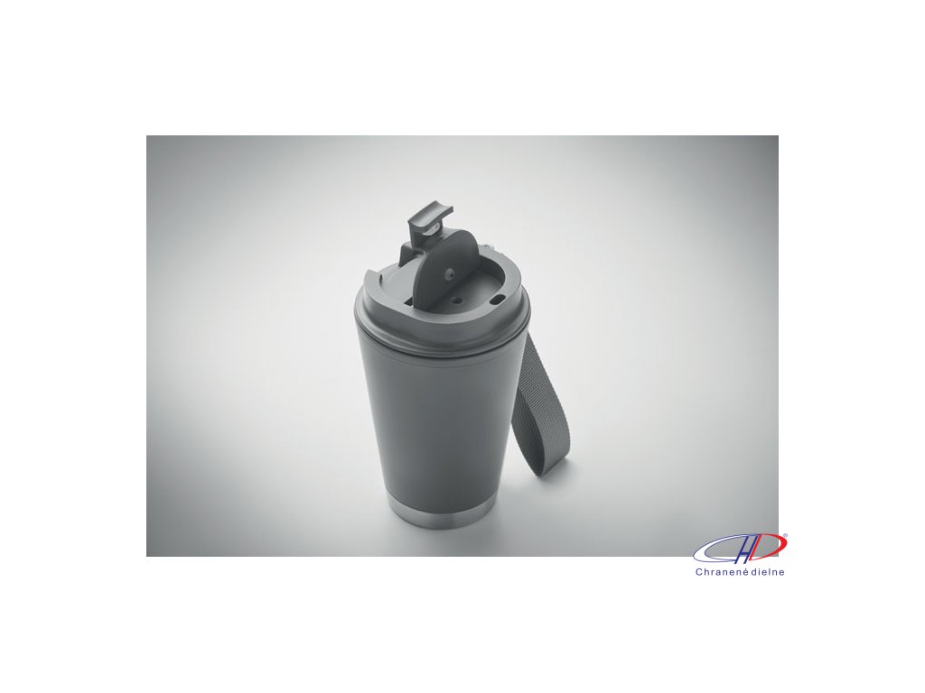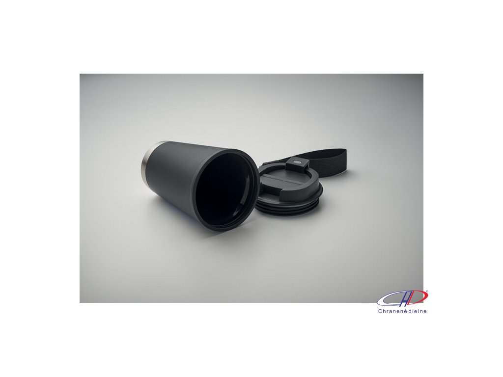 Dvojstenný termopohár s vnútornou stenou z PP plastou a vonkajšou stenou z recyklovanej nerezovej ocele. Pásik na zápästie z RPET. Objem 300 ml.Dodatočné parametre