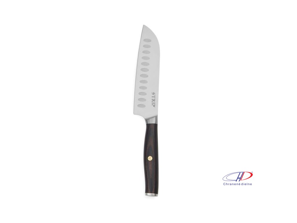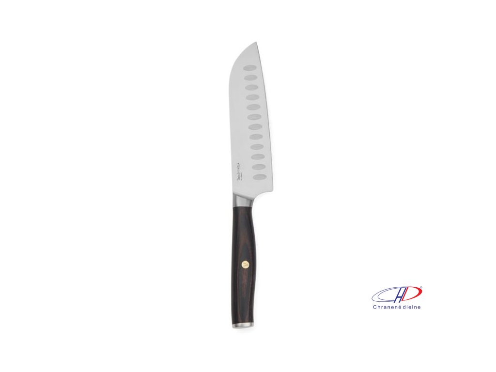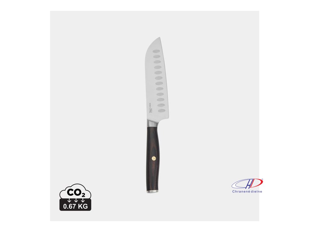 Čepeľ noža santoku je s vrúbkami, čo prináša hladšie rezanie a krájanie. Nôž je vyrobený z vysoko kvalitnej nerezovej ocele. Krásna rukoväť pakkawood. Veľkosť noža: 25,6 cm (čepeľ 14 cm). RCS certifikácia. Podiel recyklátu: 24%.Dodatočné parametre
