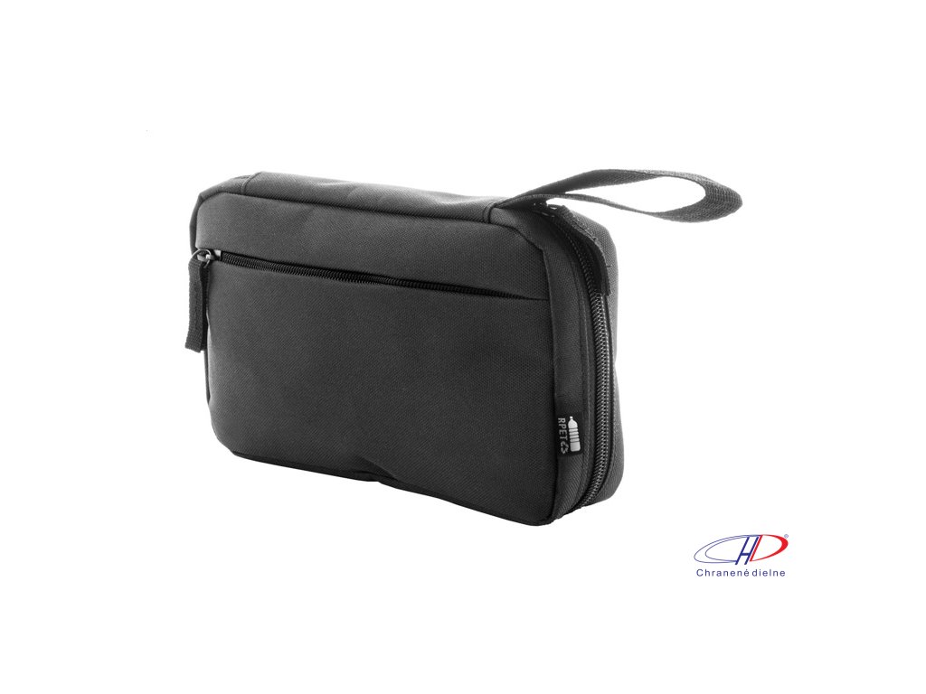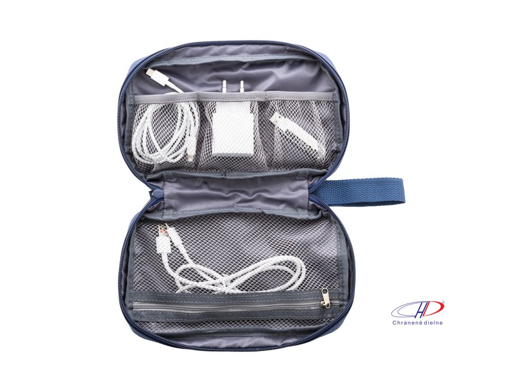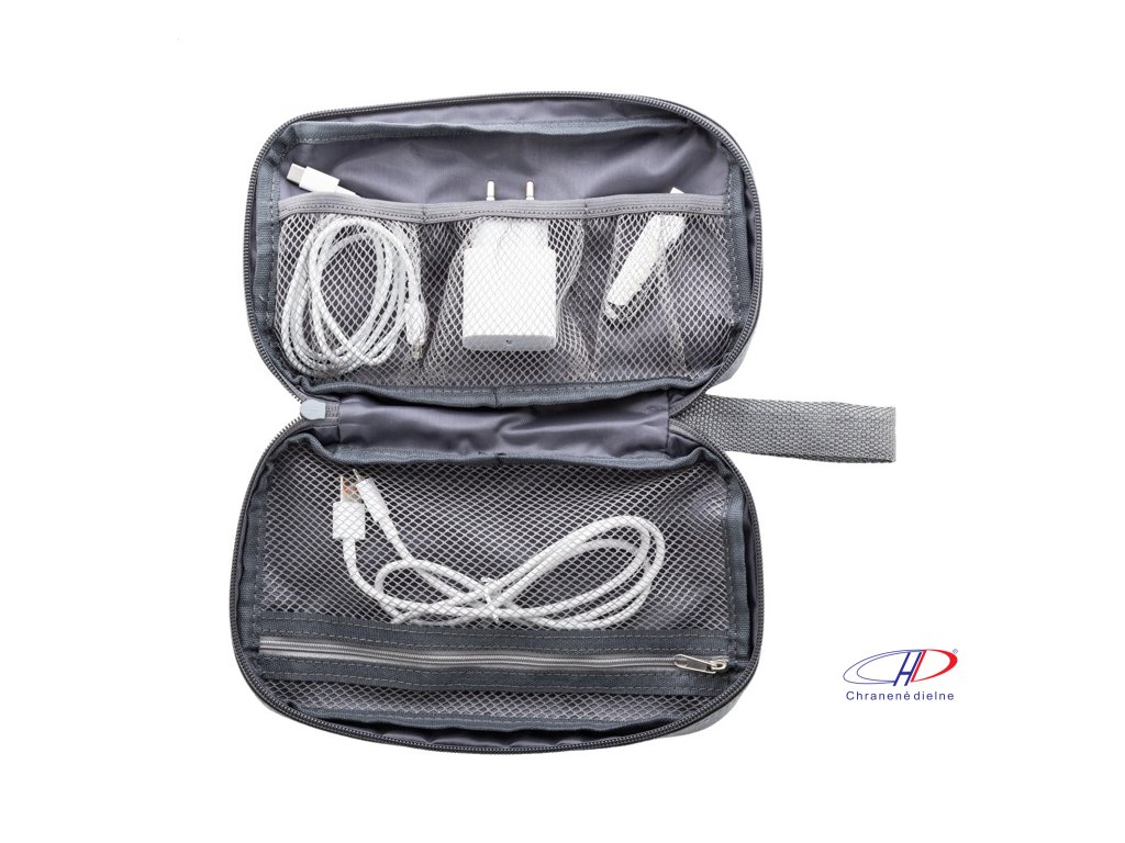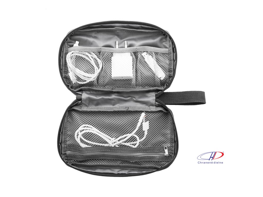 Puzdro na organizér káblov RPET na zips s vnútornými priehradkami zo sieťoviny a predným vreckom na zips. 900D RPET polyester s výrazným štítkom RPET.Dodatočné parametre