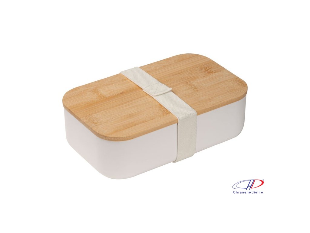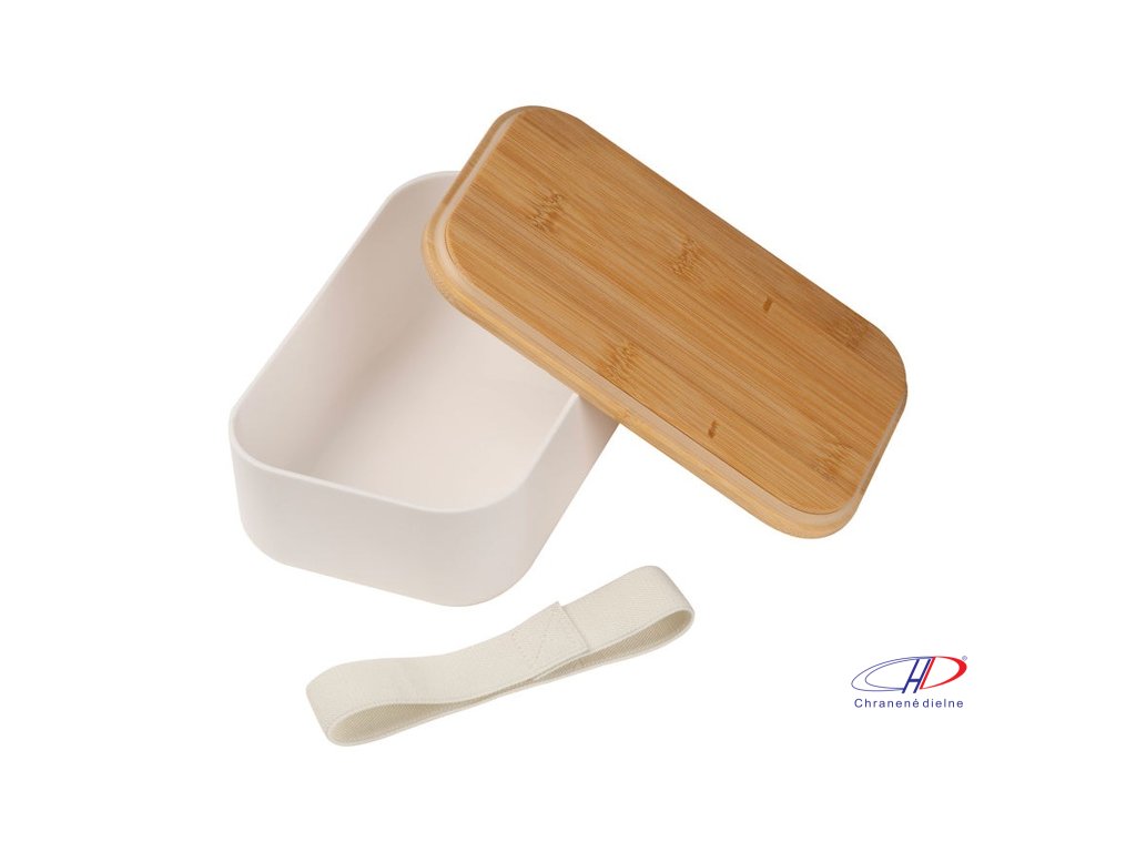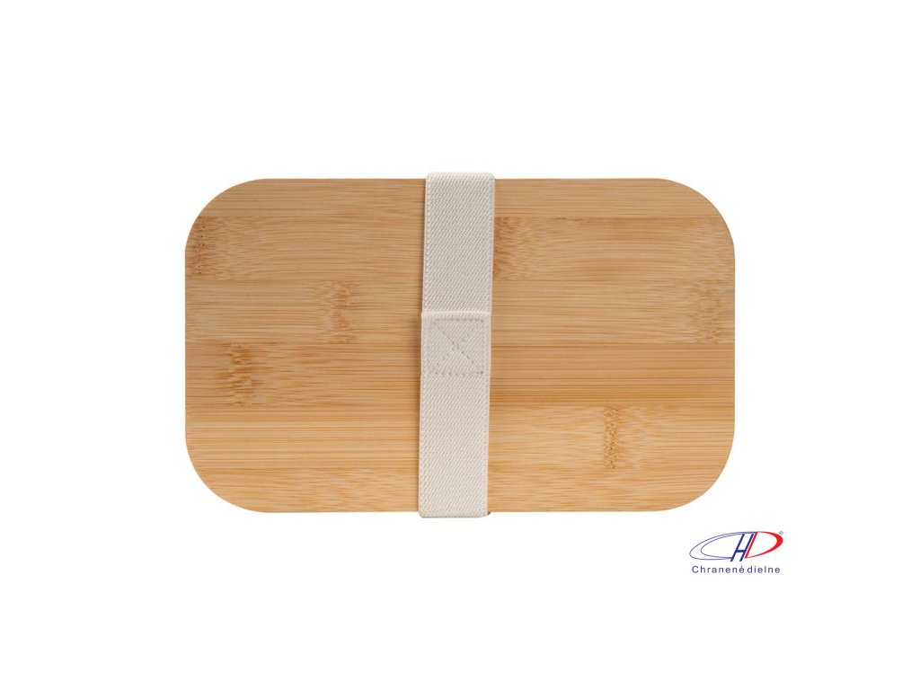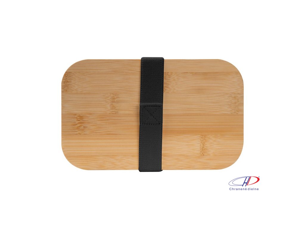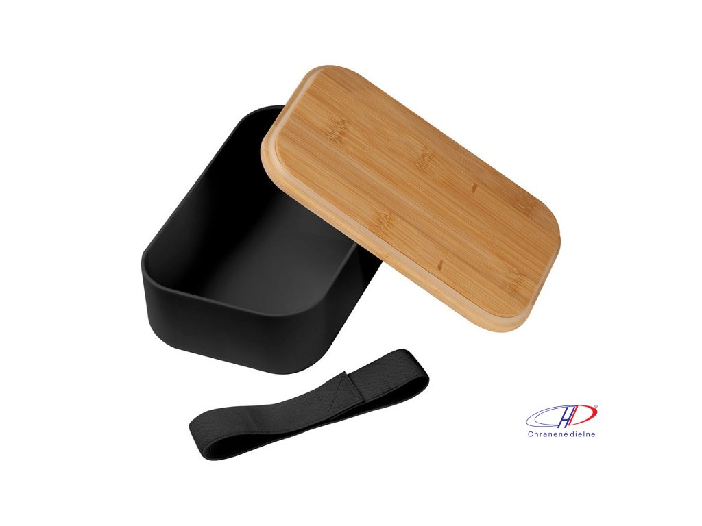 Plastový obedár s bambusovým vekom a flexibilnou elastickou páskou pre bezpečné uchytenie.Dodatočné parametre