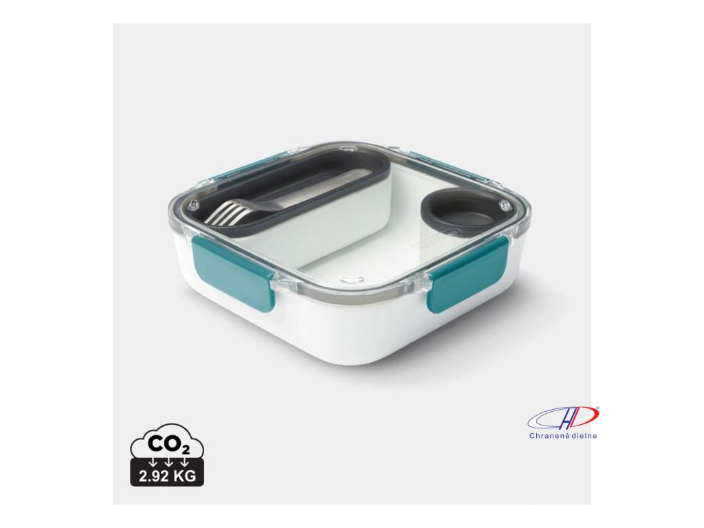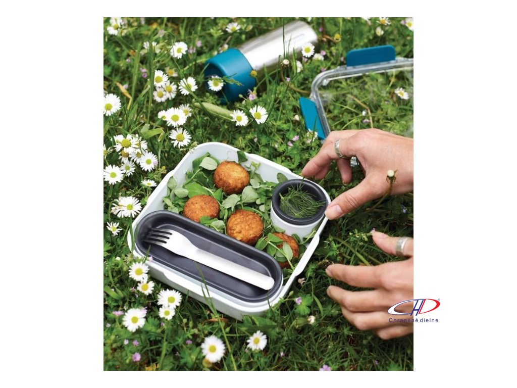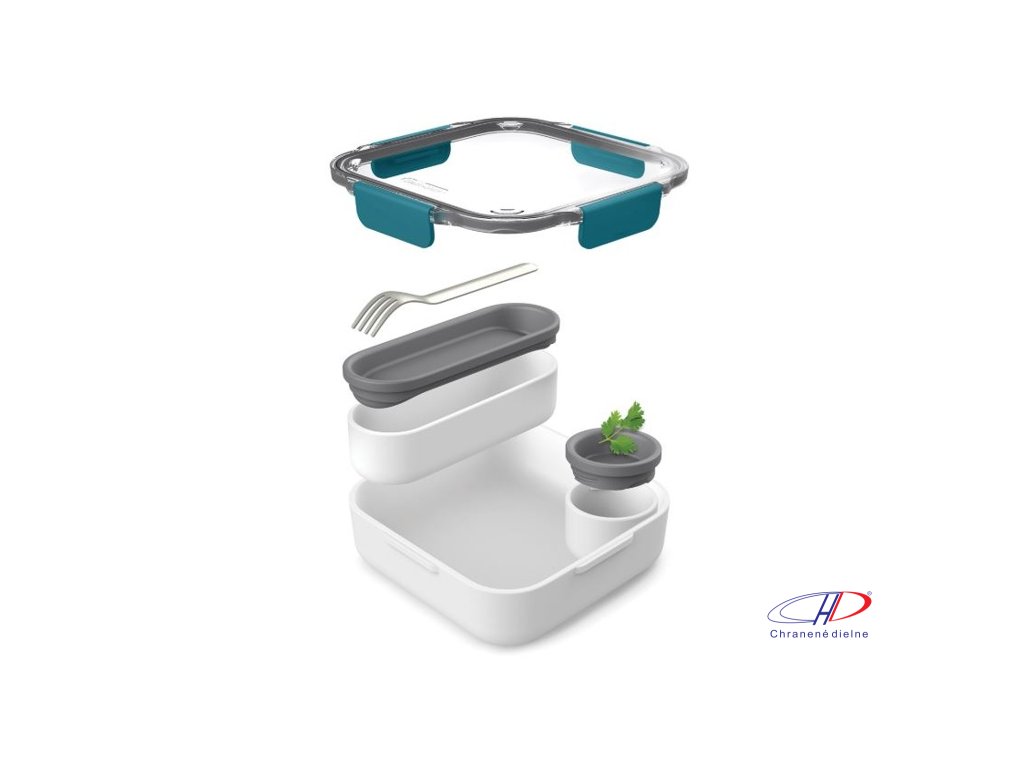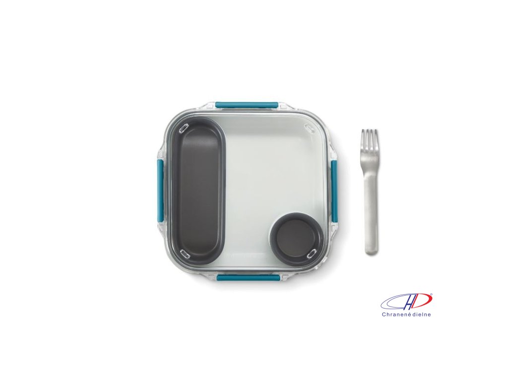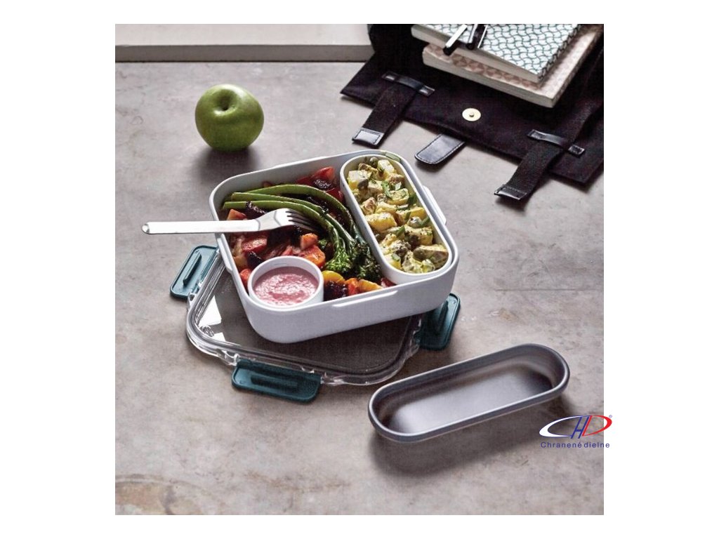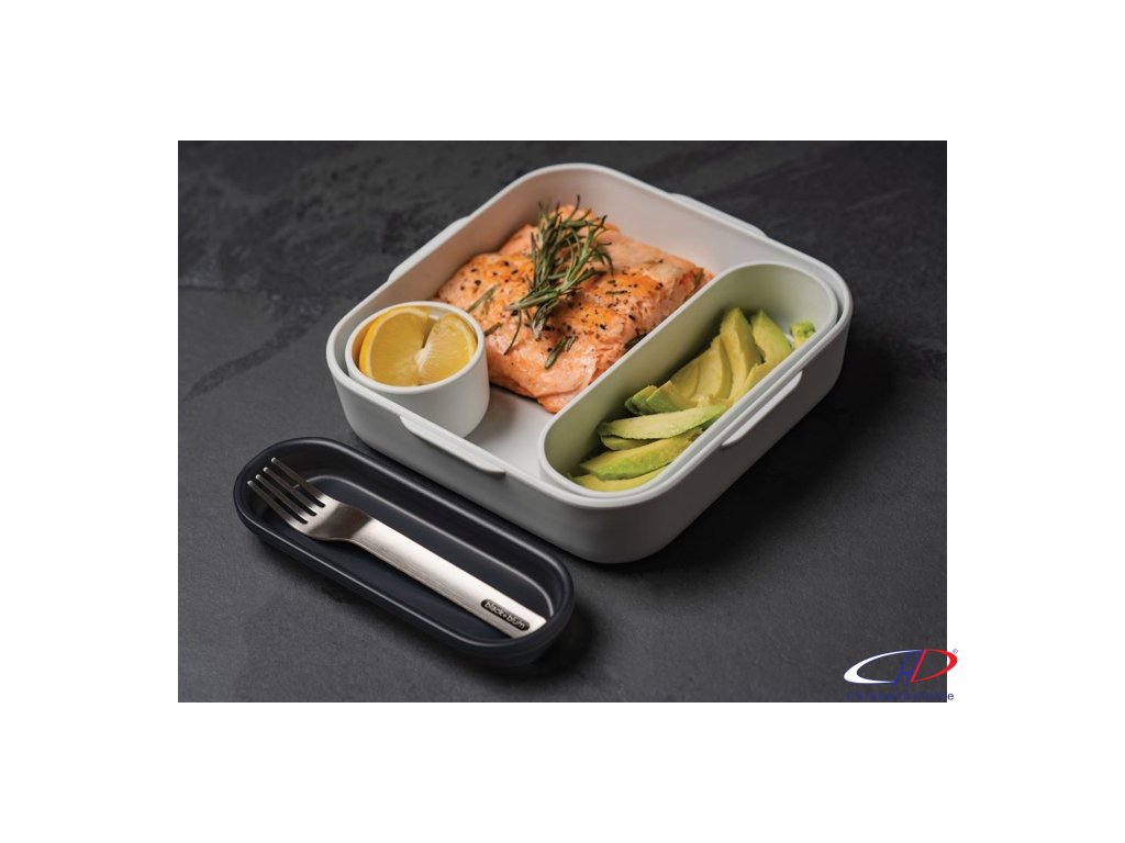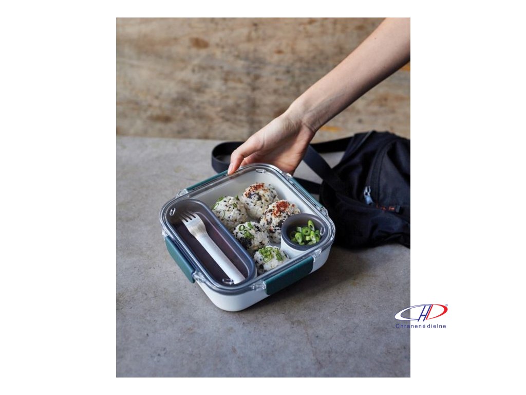 Dizajn pripomínajúci keramickú misku. Vnútorný hlavný oddiel, nepriepustný oddiel na omáčky a prílohy vo veku, nerezovú vidličku. Všetko okrem veka je vhodné do umývačky aj do mikrovlnnej rúry.Dodatočné parametre