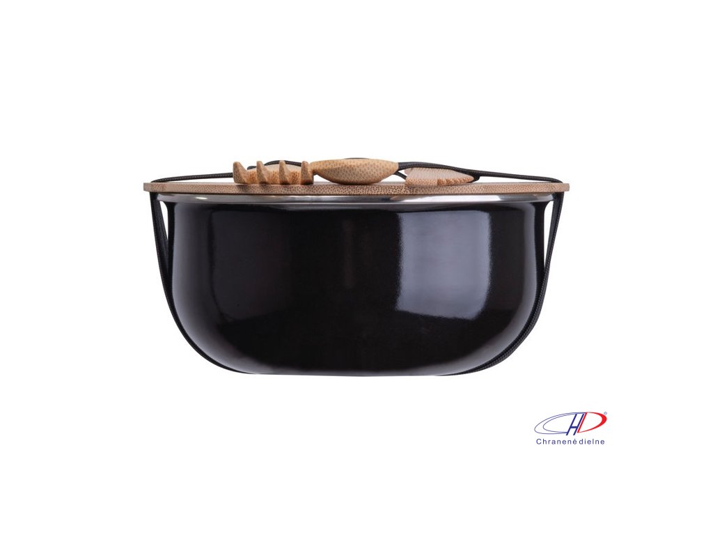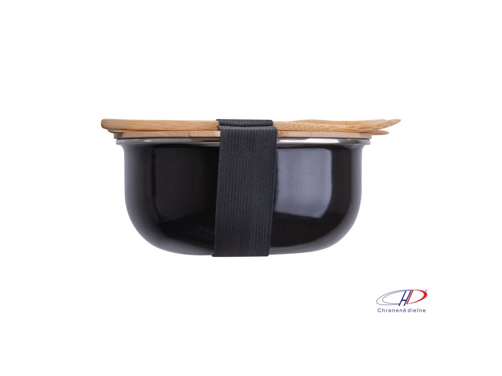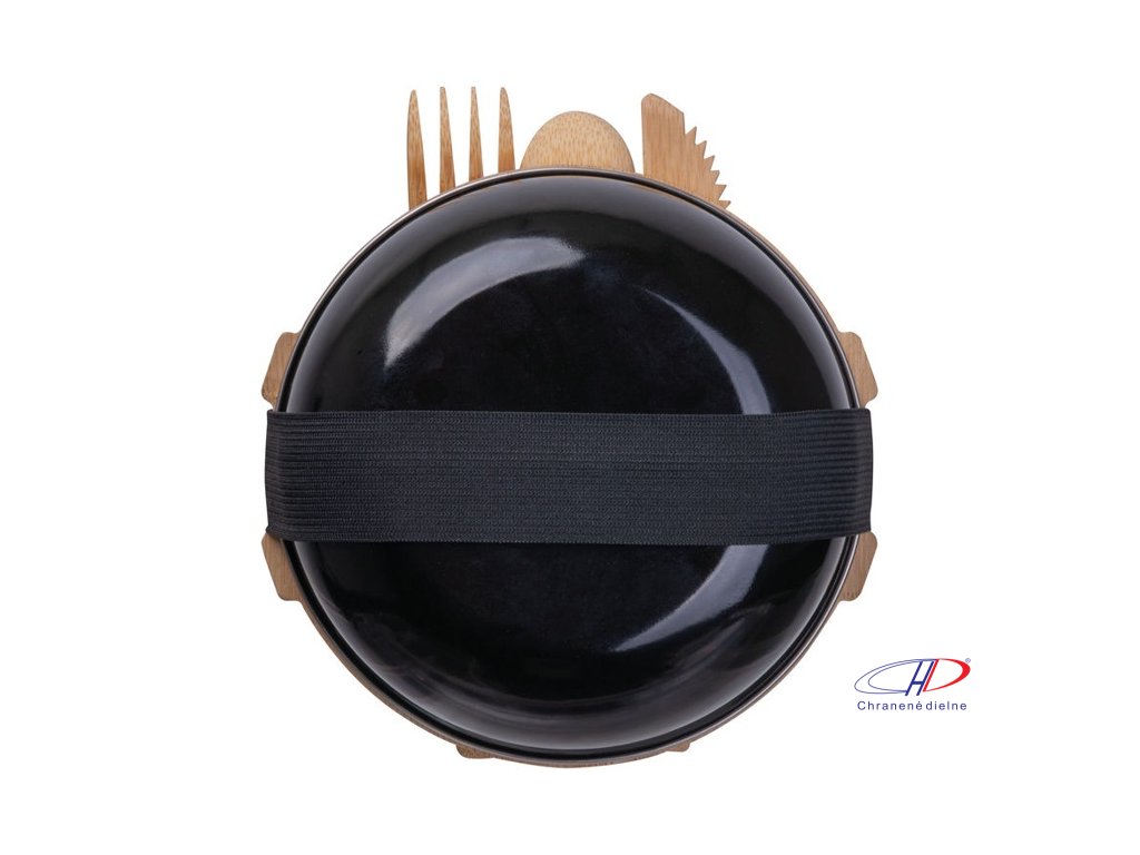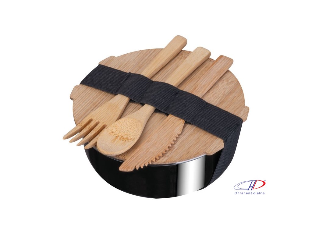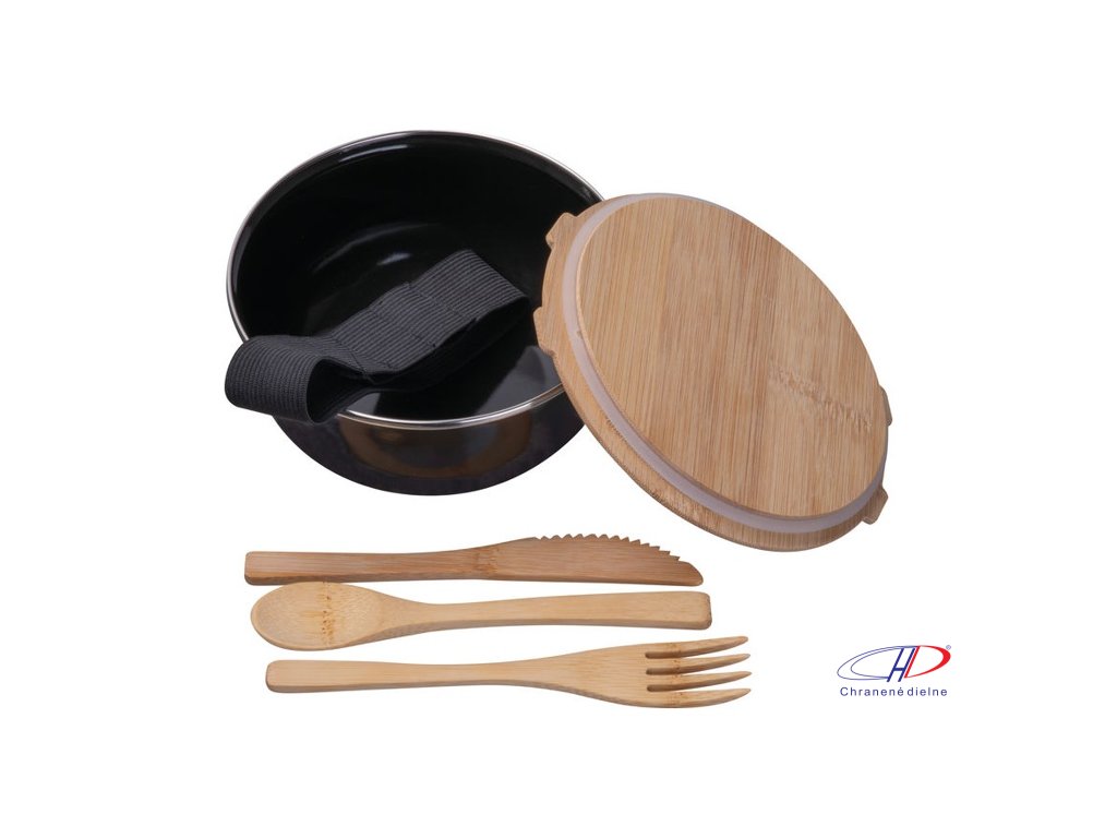 Obedár z nehrdzavejúcej ocele 700 ml s bambusovým viečkom, ku ktorému patrí bambusová lyžica, vidlička a nôž. Viečko a príbory sú pohodlne upevnené na nádobe pomocou elastickej pásky.Dodatočné parametre