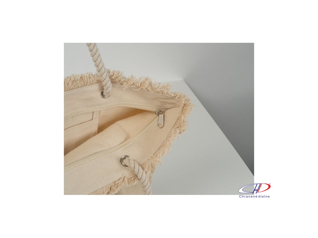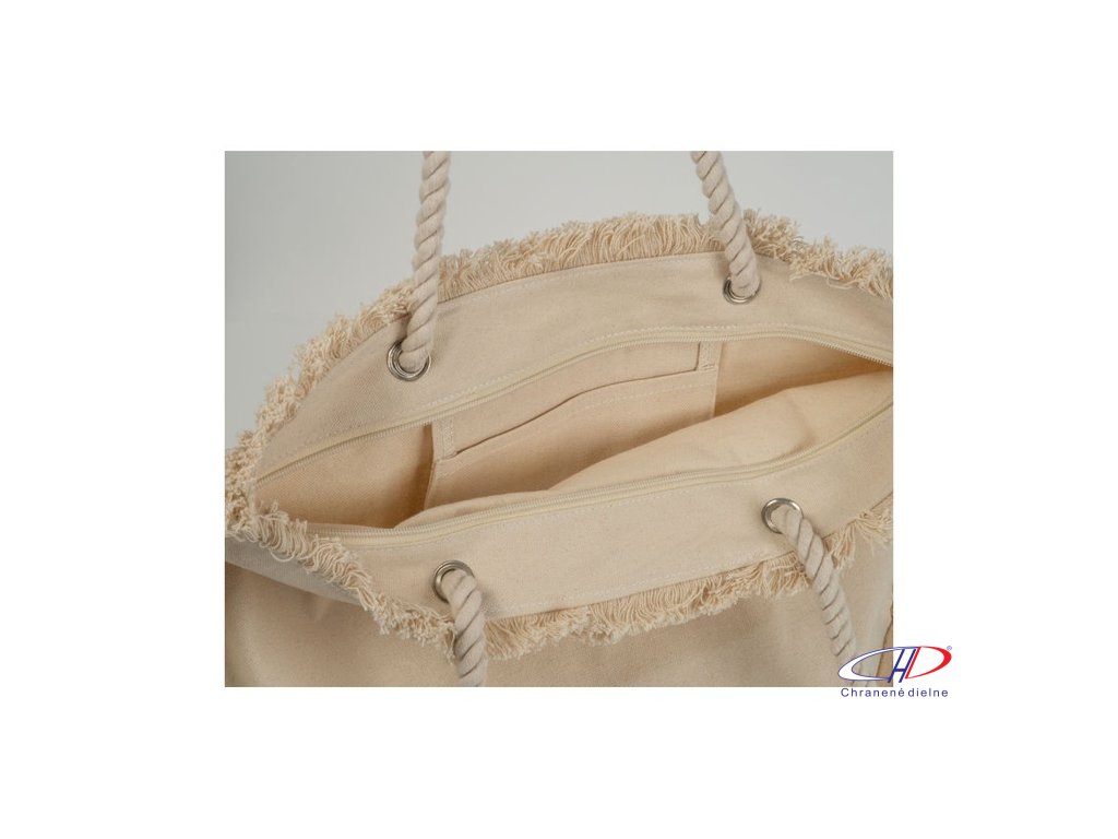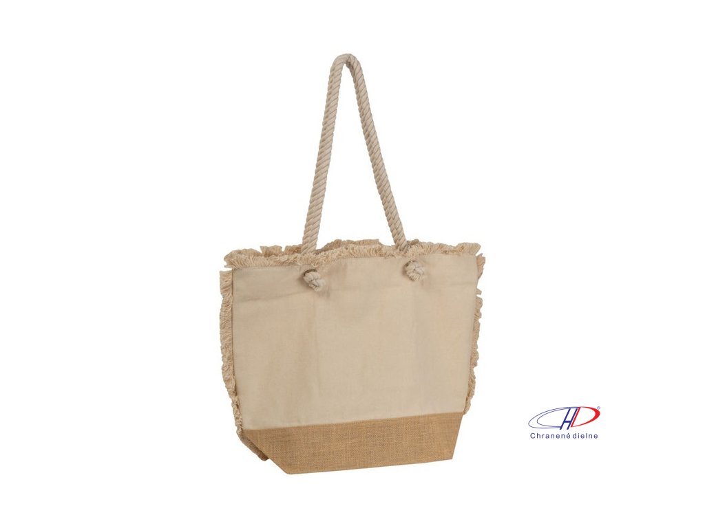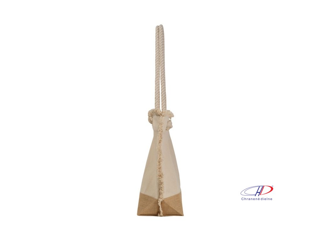 Oeko-Tex® plážová taška 320g/m2 zo štruktúrovaného bavlneného materiálu prírodnej farby s jutovým dnom a šnúrovanými ušami. Ideálna na pláž.Dodatočné parametre