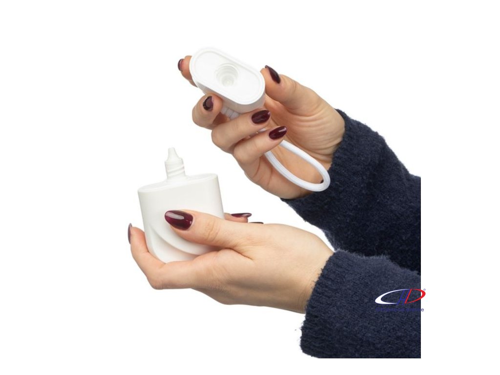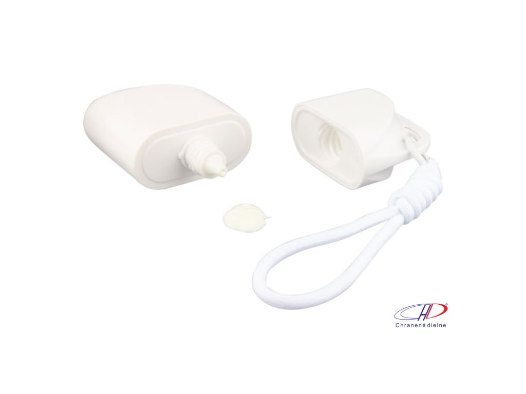 PP obal s 50 ml opaľovacím krémom (SPF50) a polyesterovou šnúrkou na zápästie zodpovedajúcej farby s kovovým háčikom. Na zadnej strane je nálepka.Dodatočné parametre