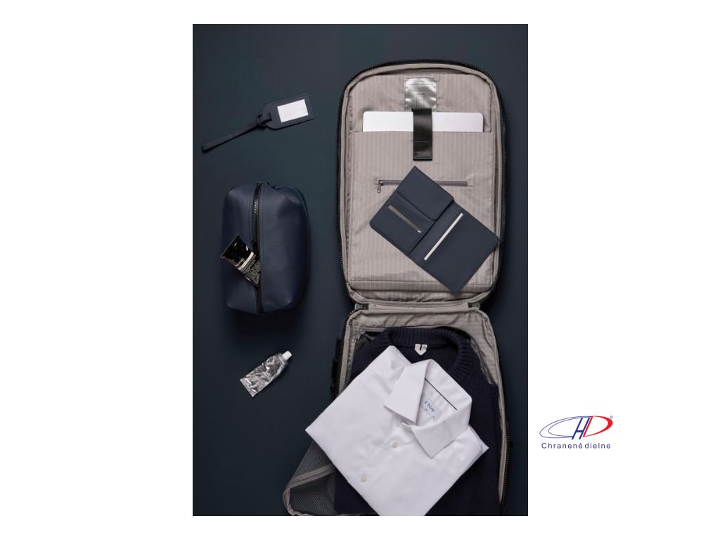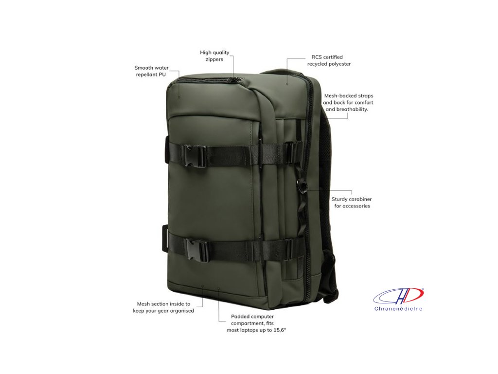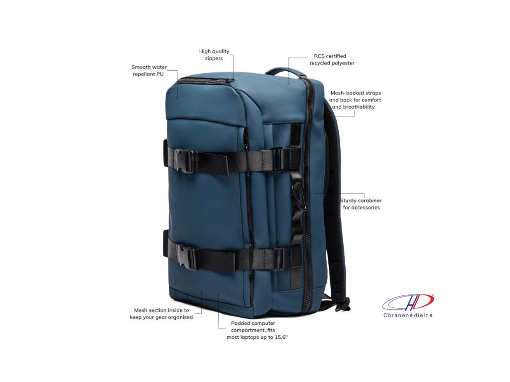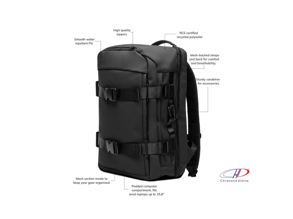 Ruksak z RPET RCS s PU povlakom. Sieťovaná zadná strana, priehradka na notebook, dve vonkajšie vrecká a sieťovanú časť vo vnútri. Pevná horná rukoväť a karabína na upevnenie menších predmetov. Popruh na kufor, bočný zips. Podiel recyklátu: 16 %Dodatočné parametre
