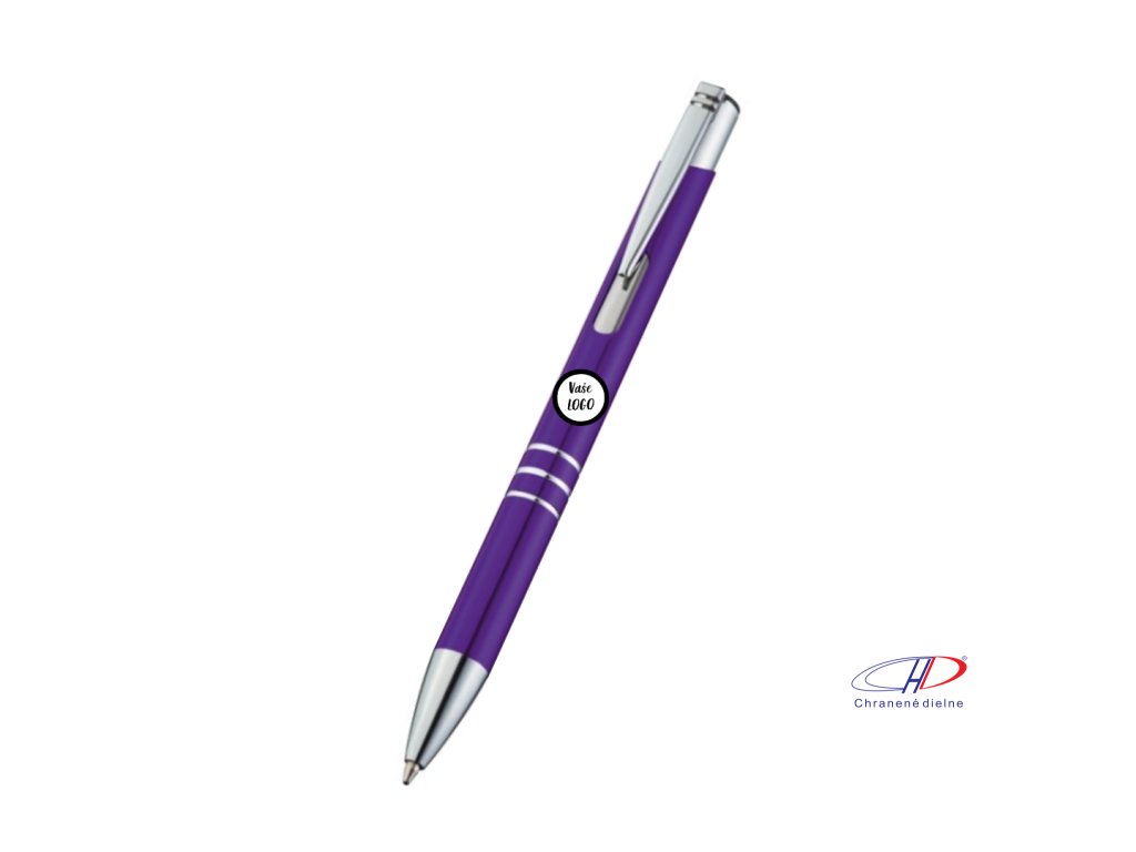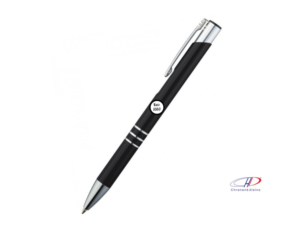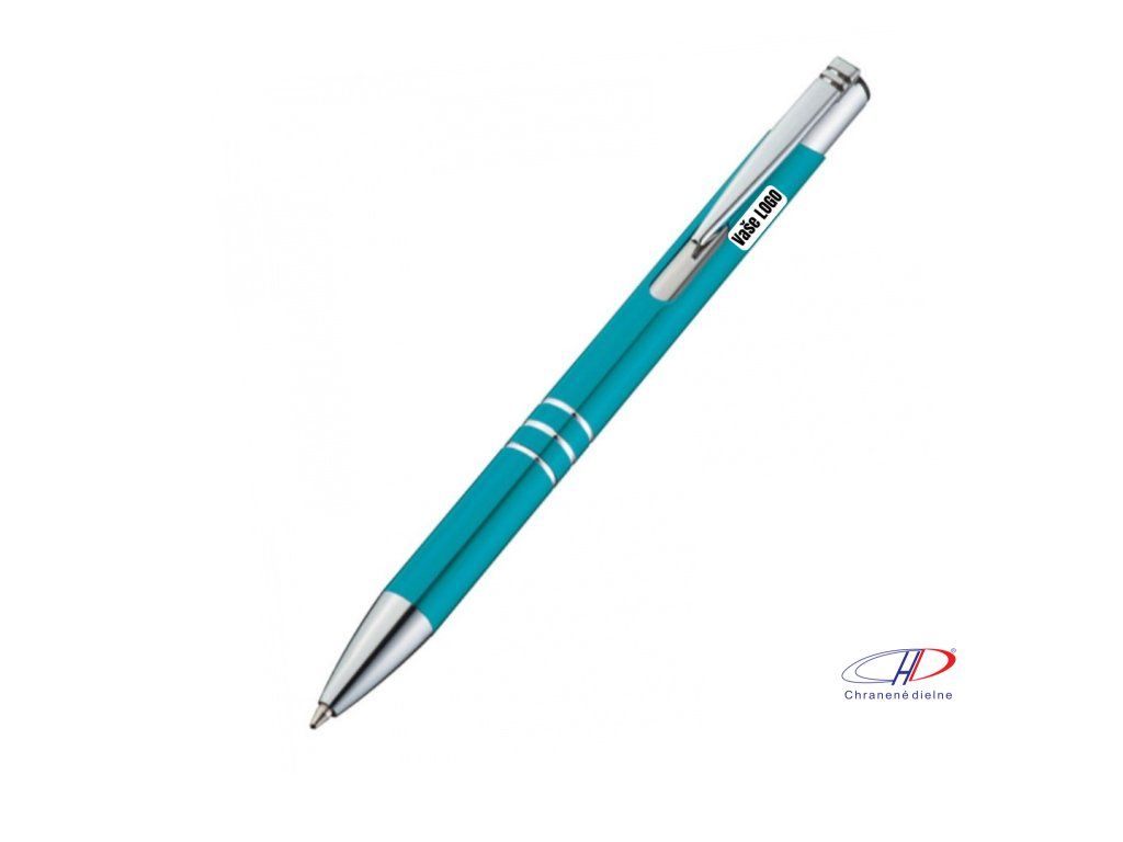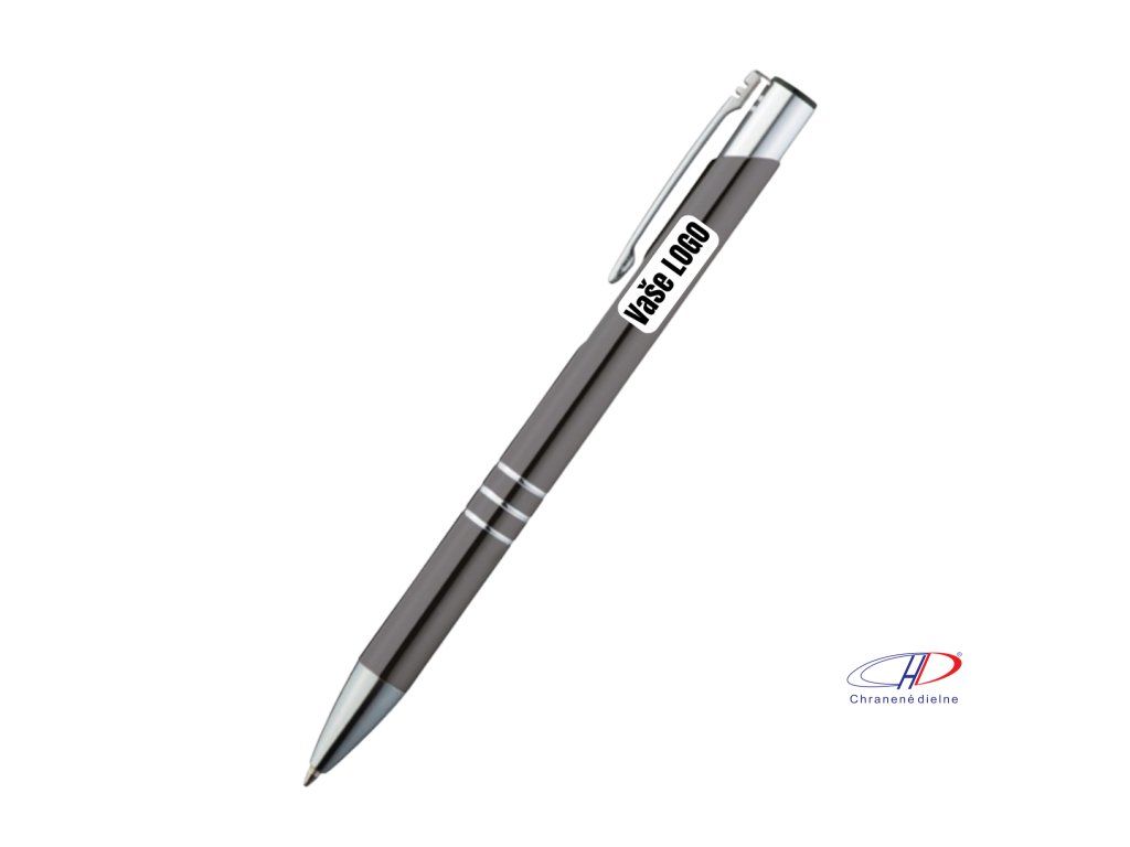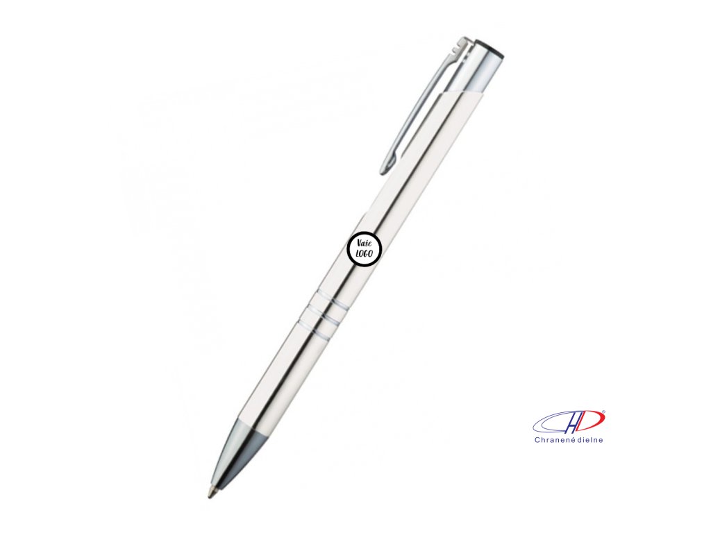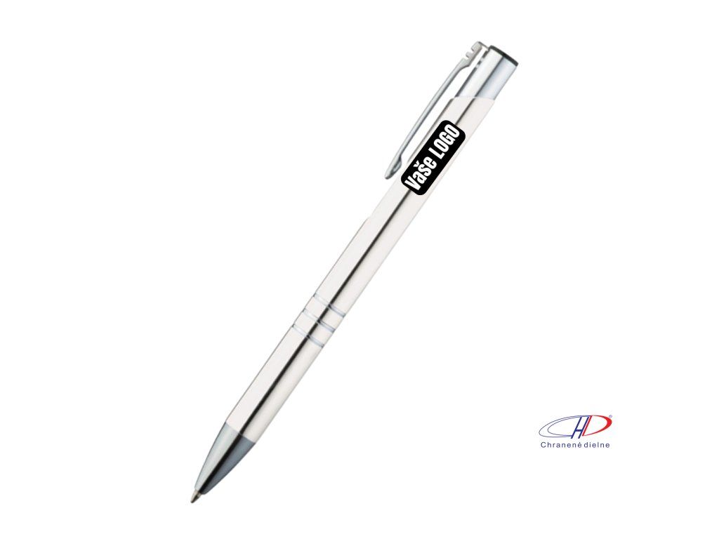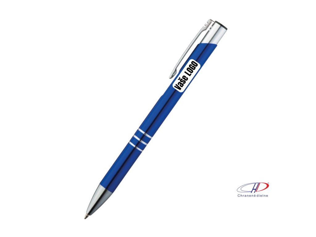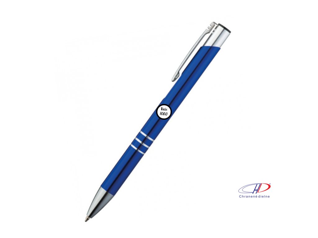 Hliníkové guľôčkové pero s 3 ozdobnými prúžkami. Pero má veľkú modrú náplň.