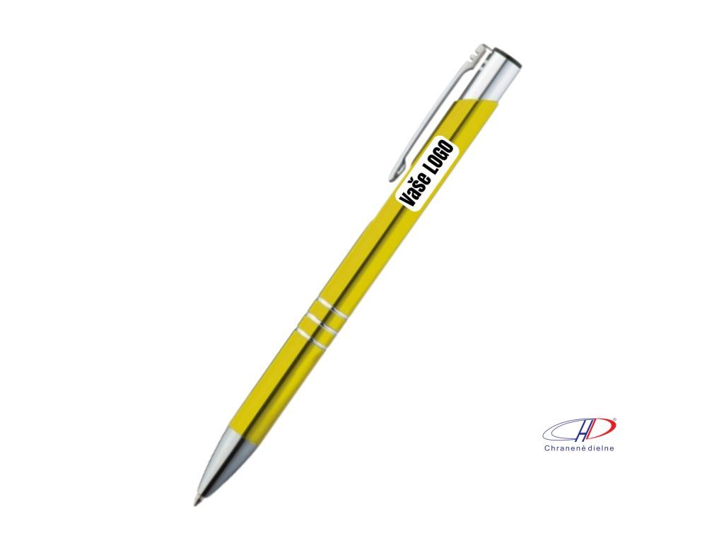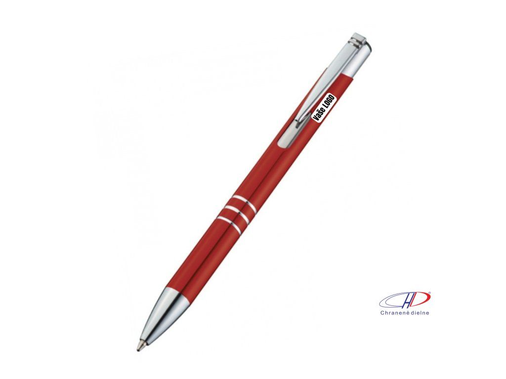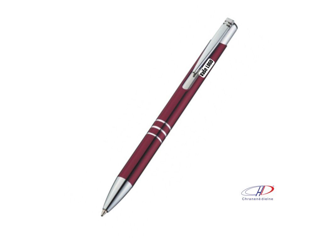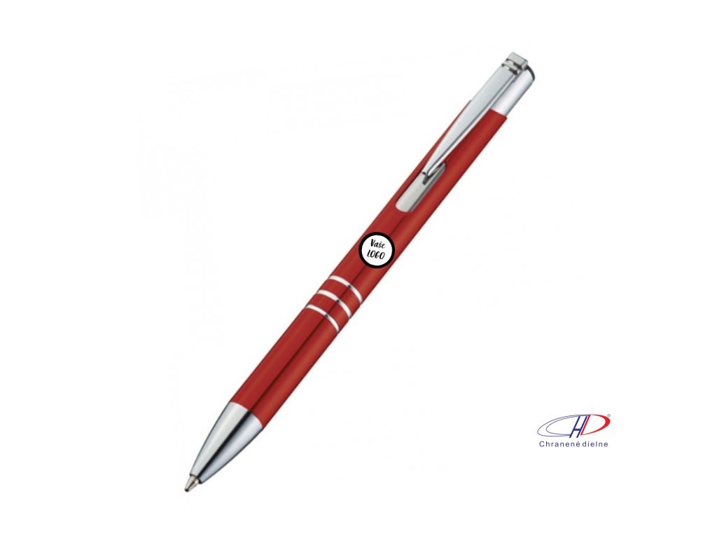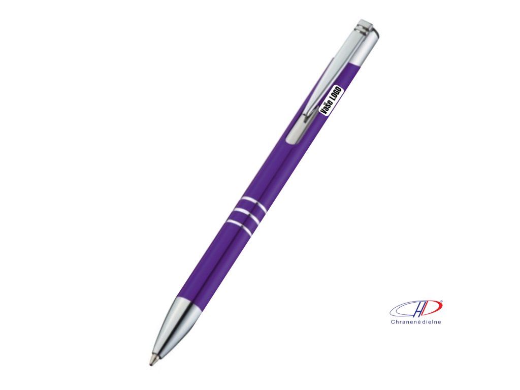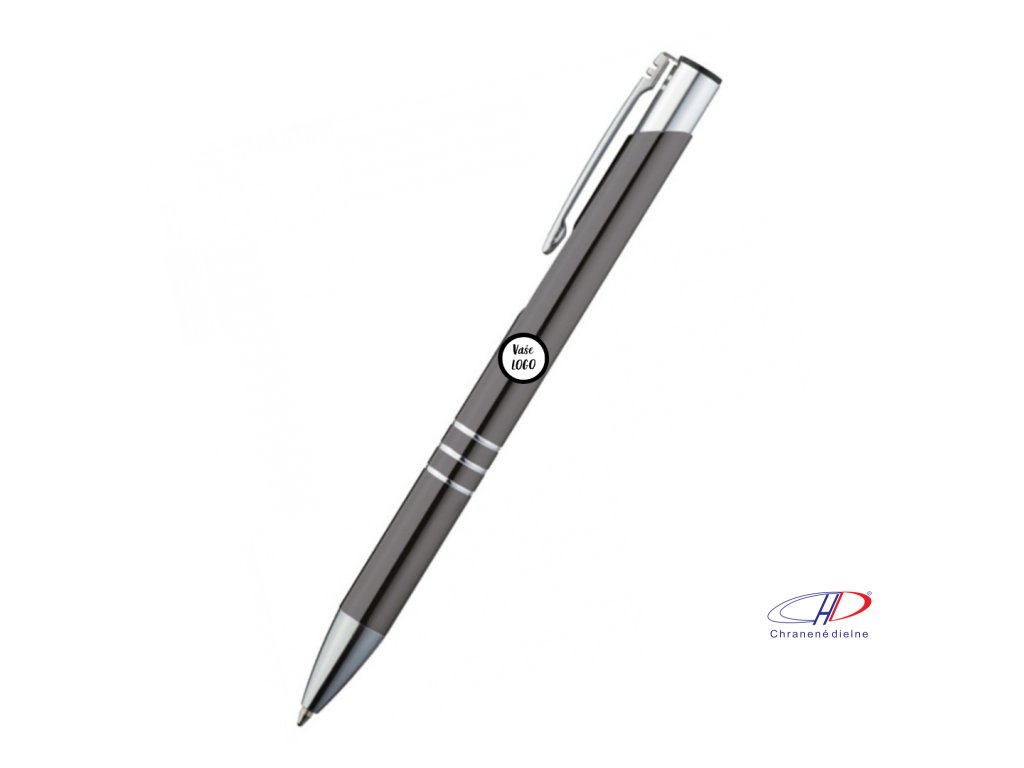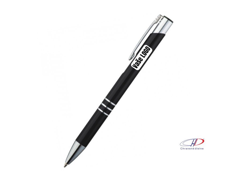 Hliníkové guľôčkové pero s 3 ozdobnými prúžkami. Pero má veľkú modrú náplň.