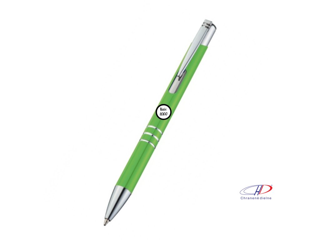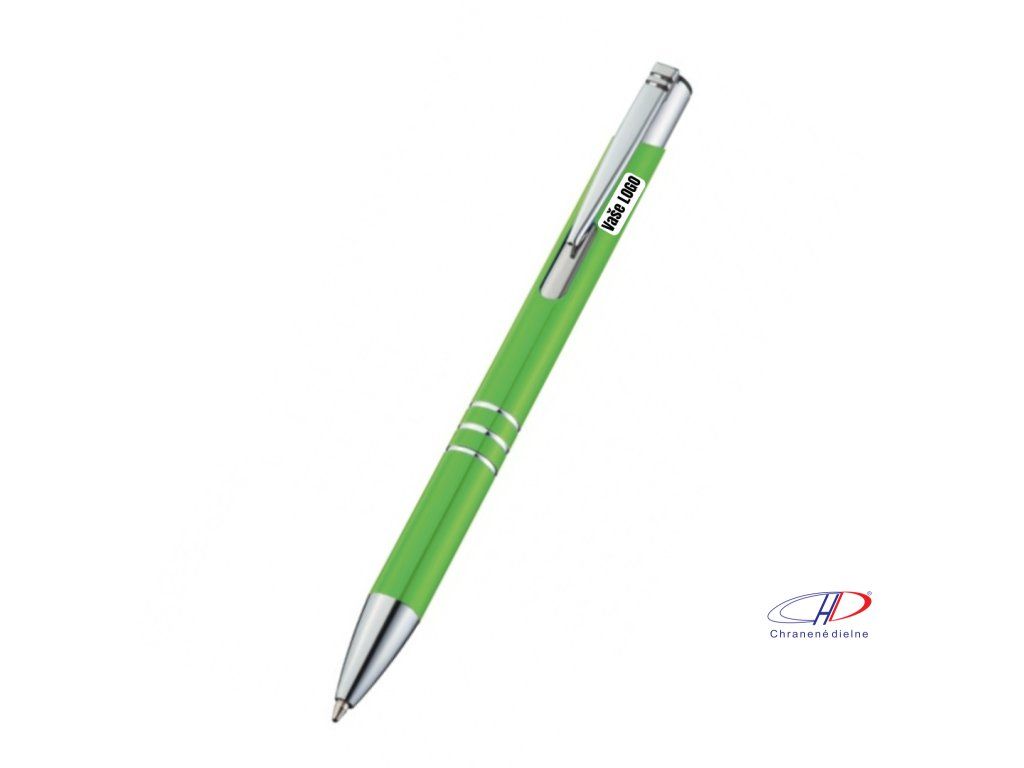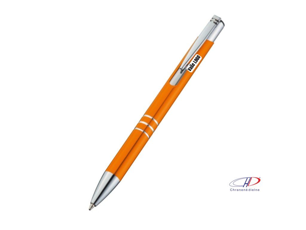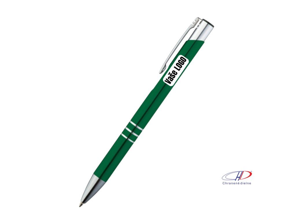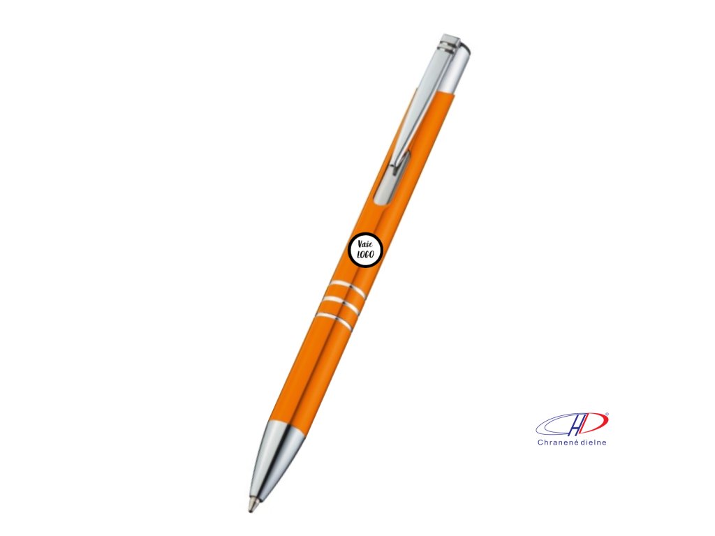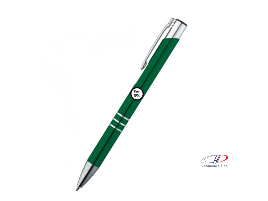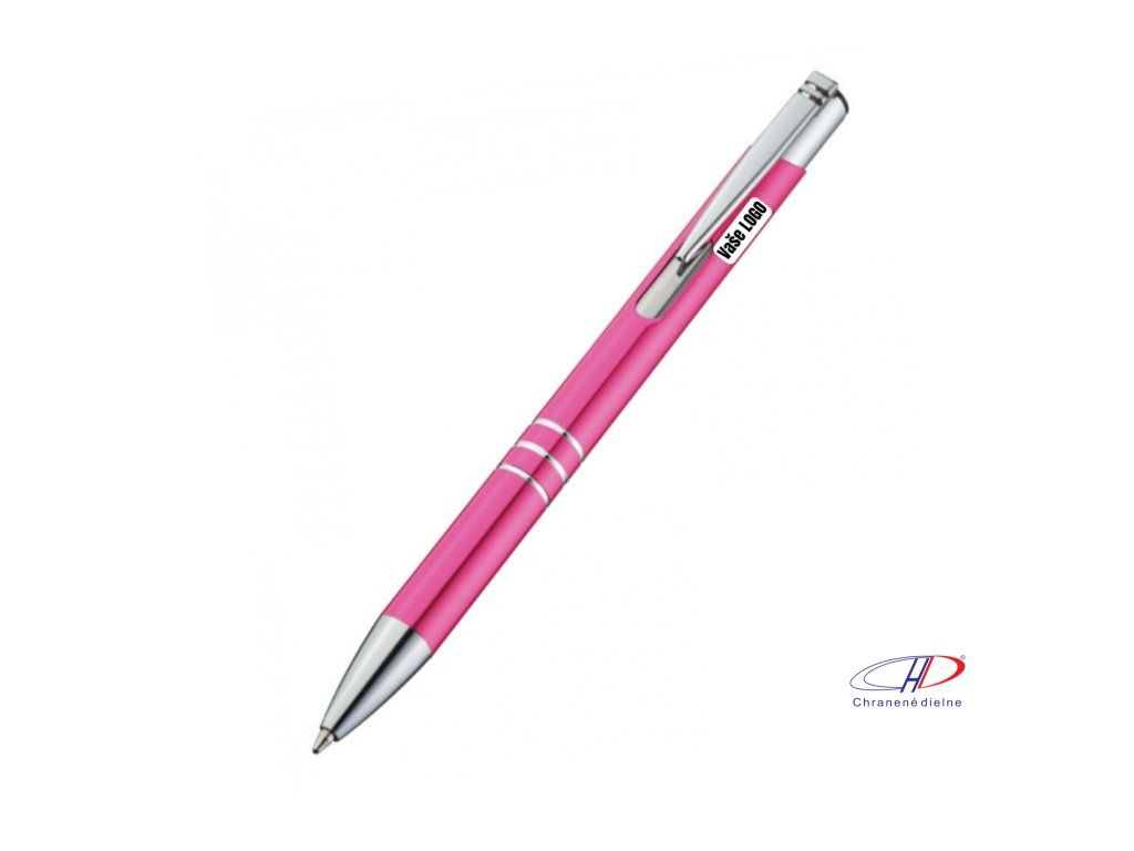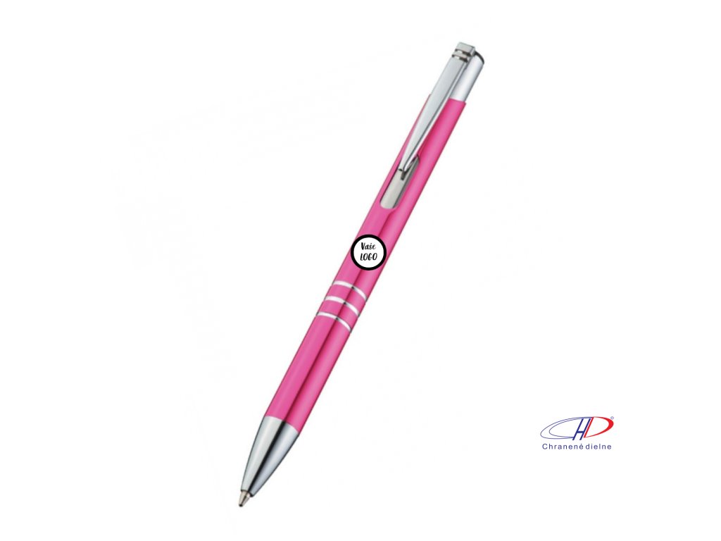 Hliníkové guľôčkové pero s 3 ozdobnými prúžkami. Pero má veľkú modrú náplň.
