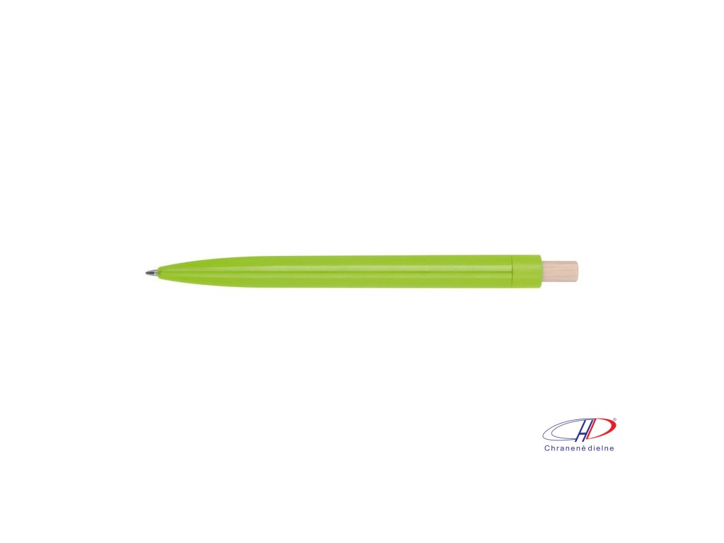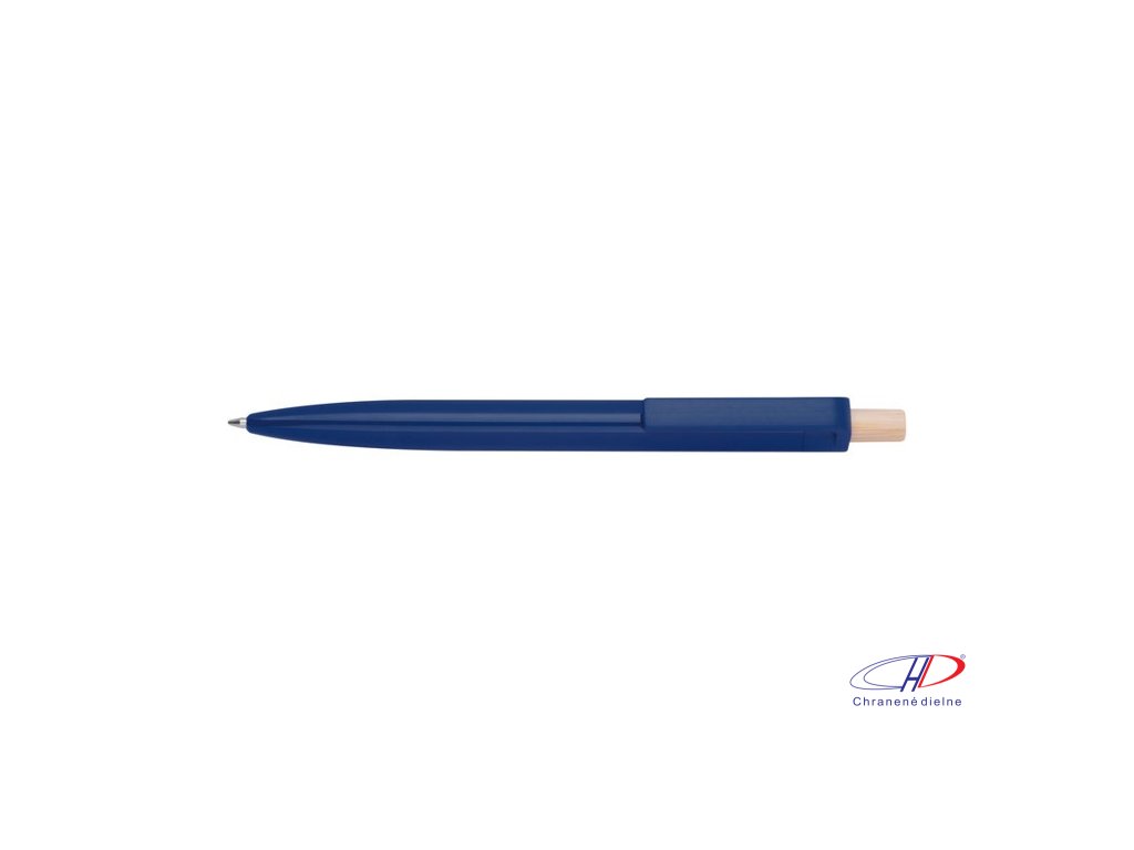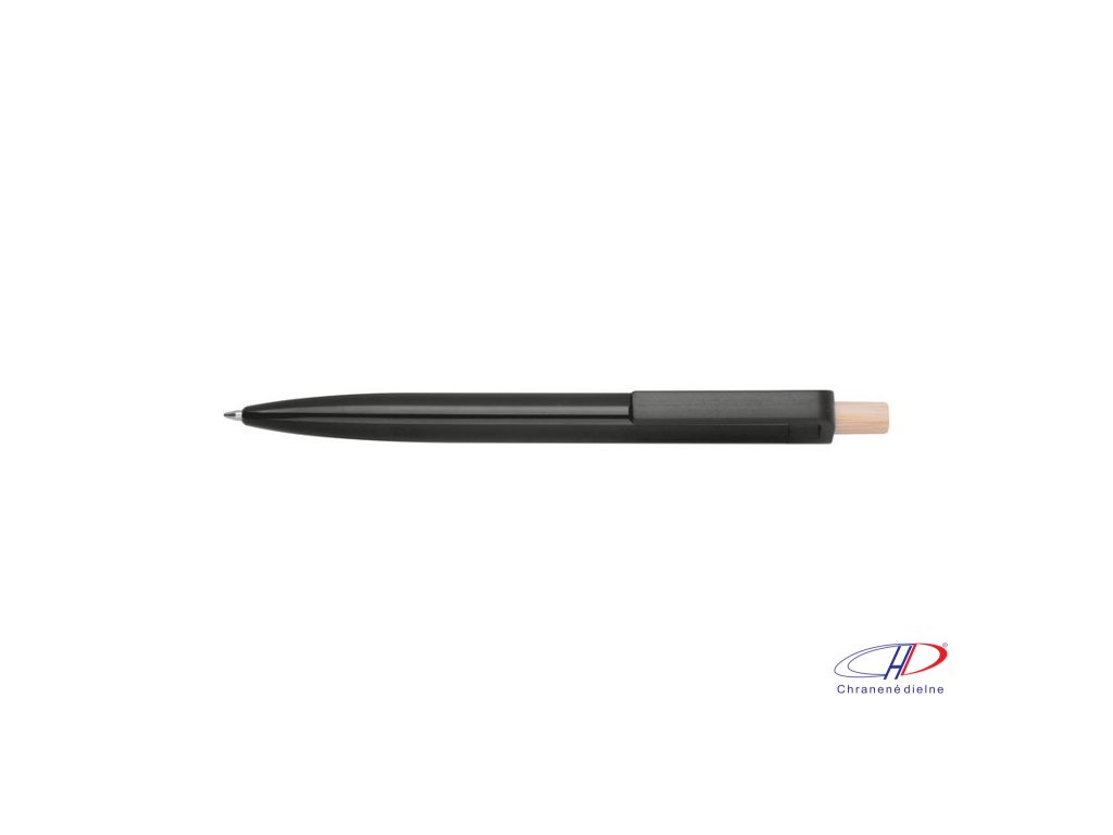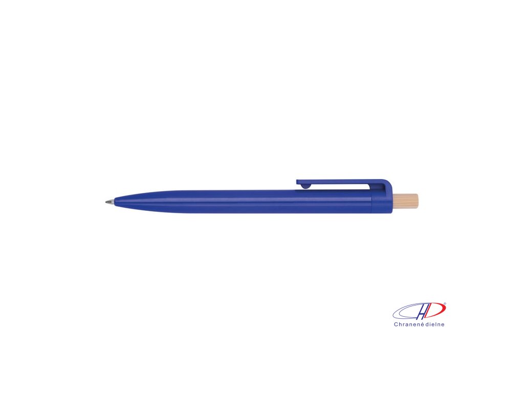 Guľôčkové pero vyrobené z recyklovaného ABS s tlačidlom z bambusu. Obsahuje modrú plastovú náplň.