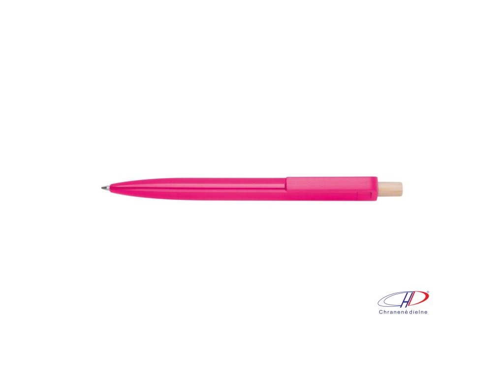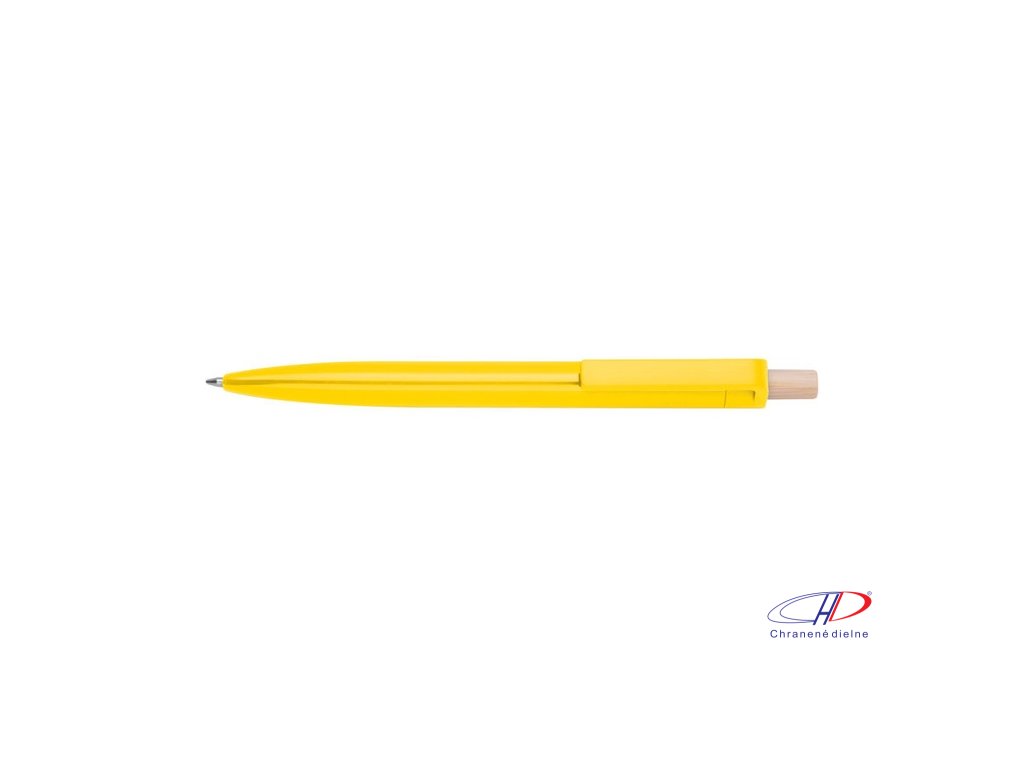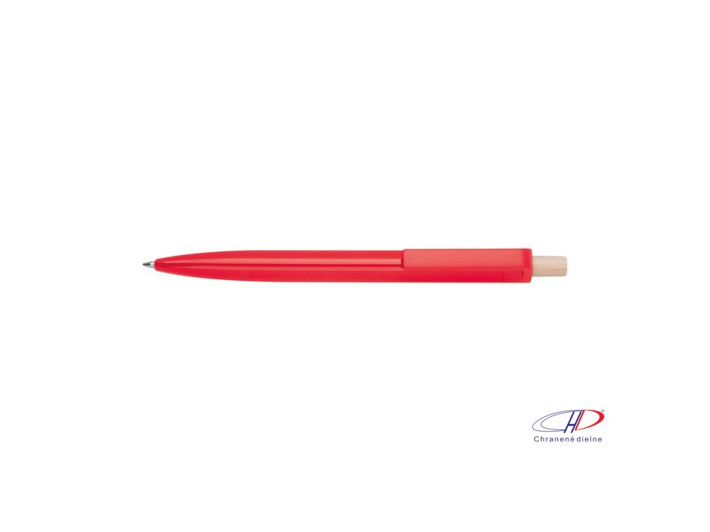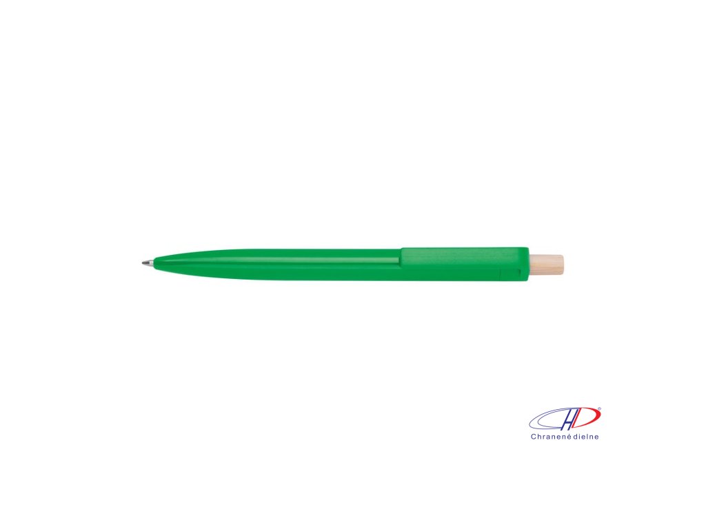 Guľôčkové pero vyrobené z recyklovaného ABS s tlačidlom z bambusu. Obsahuje modrú plastovú náplň.