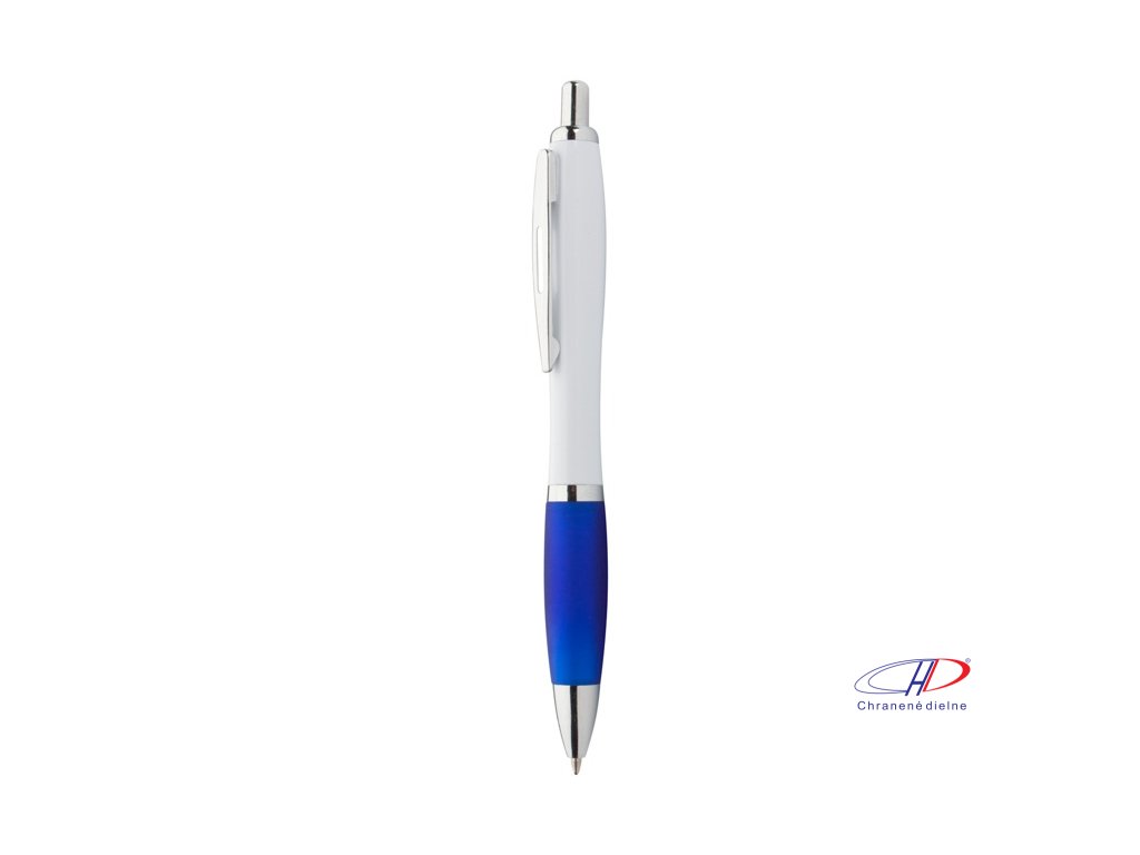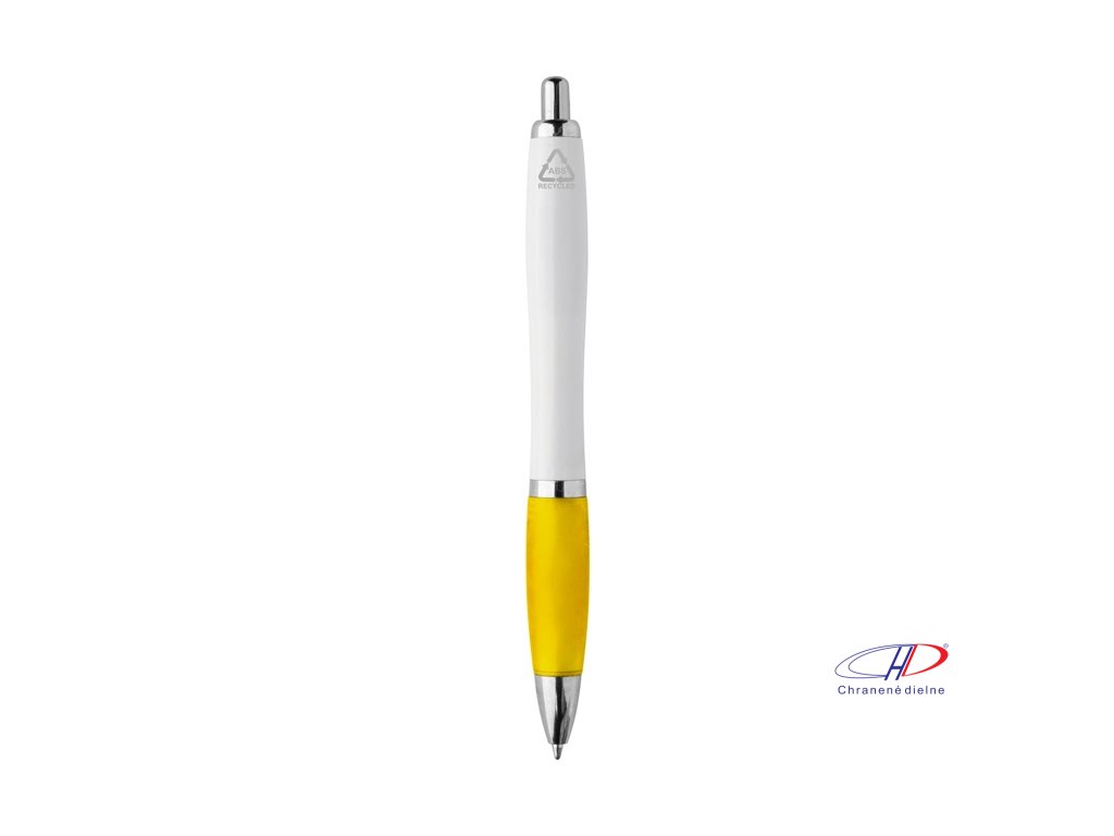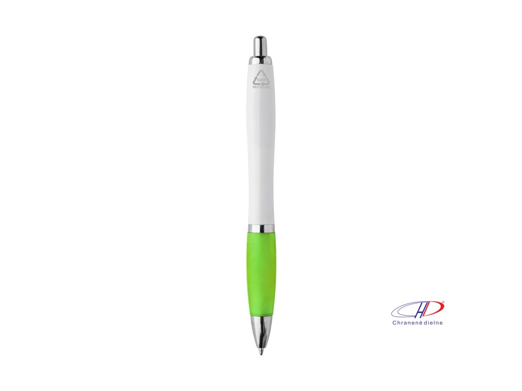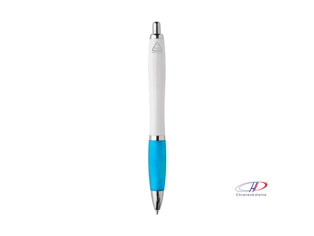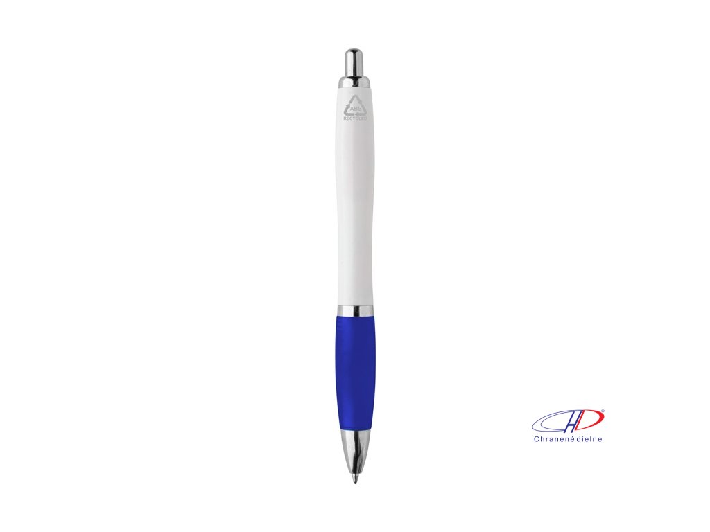 Guľôčkové pero z recyklovaného ABS plastu s bielym telom, farebným úchopom a chrómovanými časťami. S modrou náplňou.Dodatočné parametre