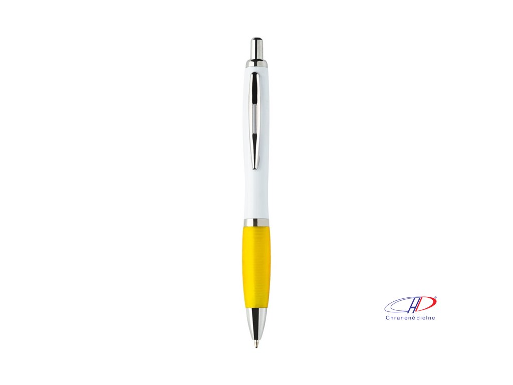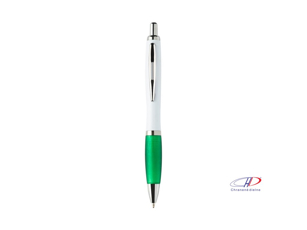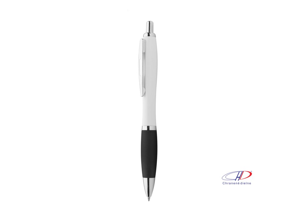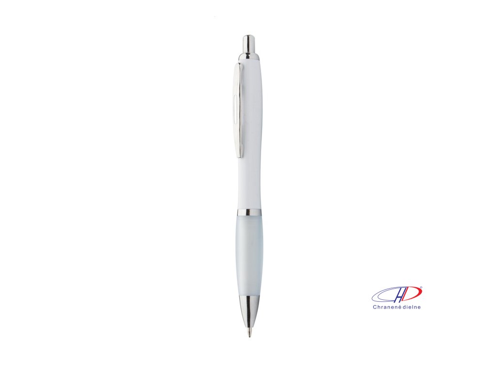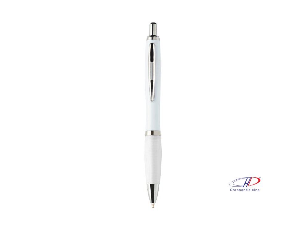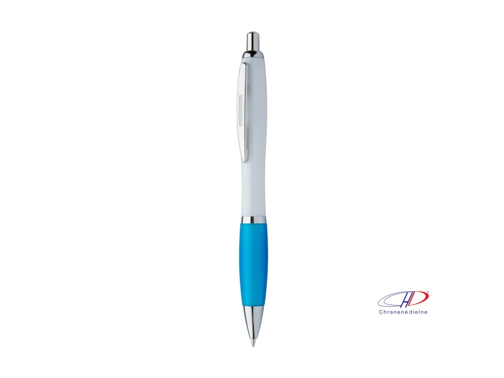 Guľôčkové pero z recyklovaného ABS plastu s bielym telom, farebným úchopom a chrómovanými časťami. S modrou náplňou.Dodatočné parametre