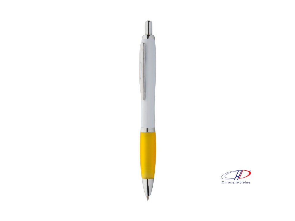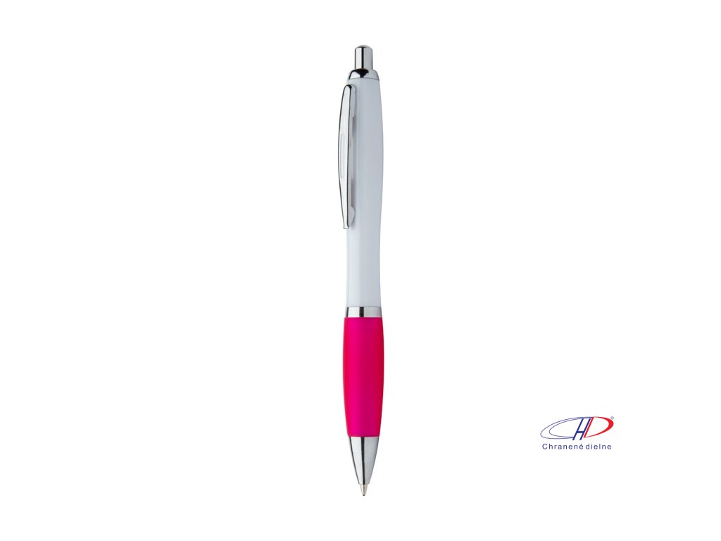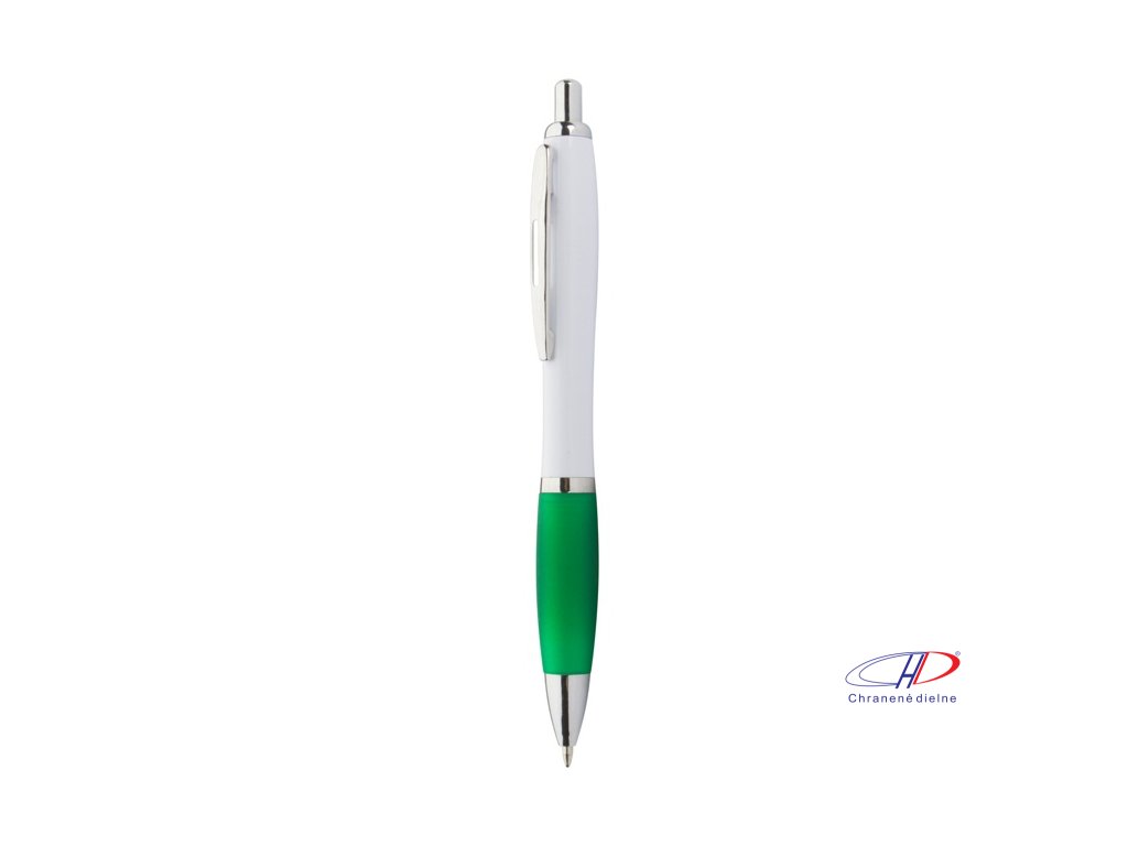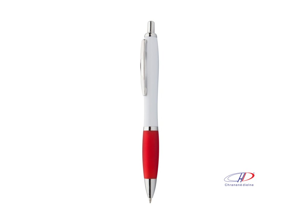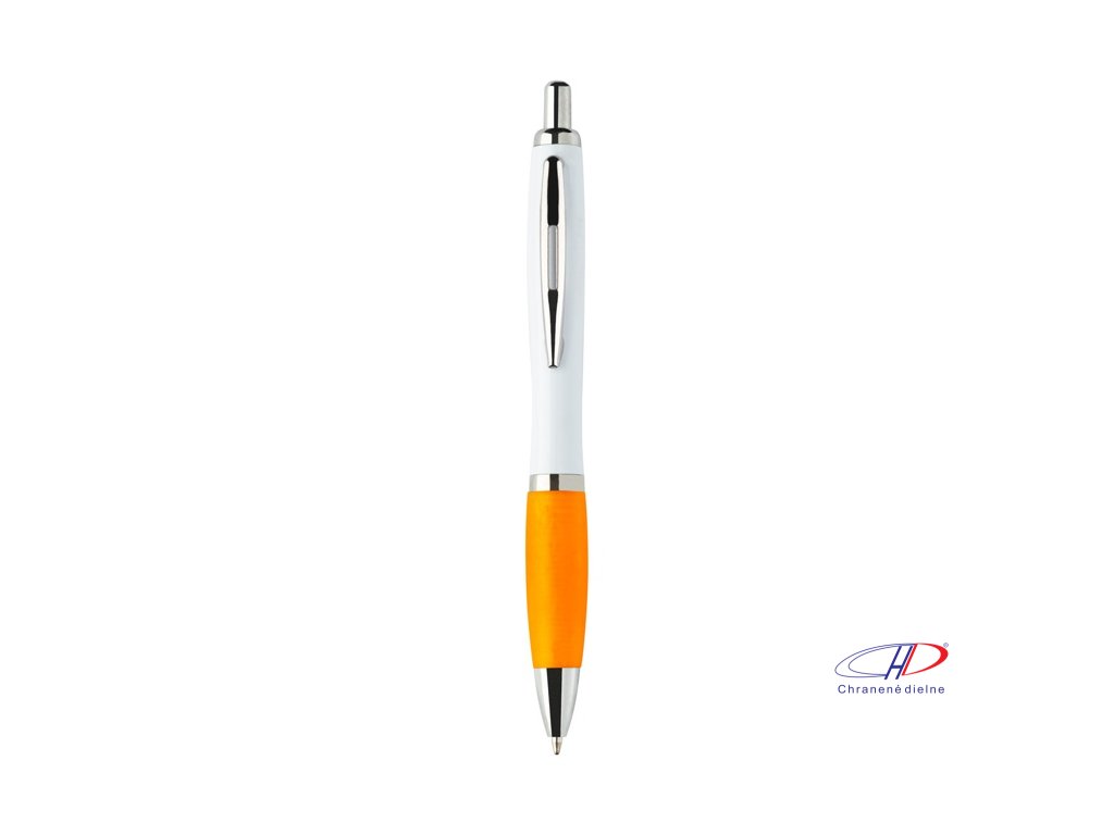 Guľôčkové pero z recyklovaného ABS plastu s bielym telom, farebným úchopom a chrómovanými časťami. S modrou náplňou.Dodatočné parametre