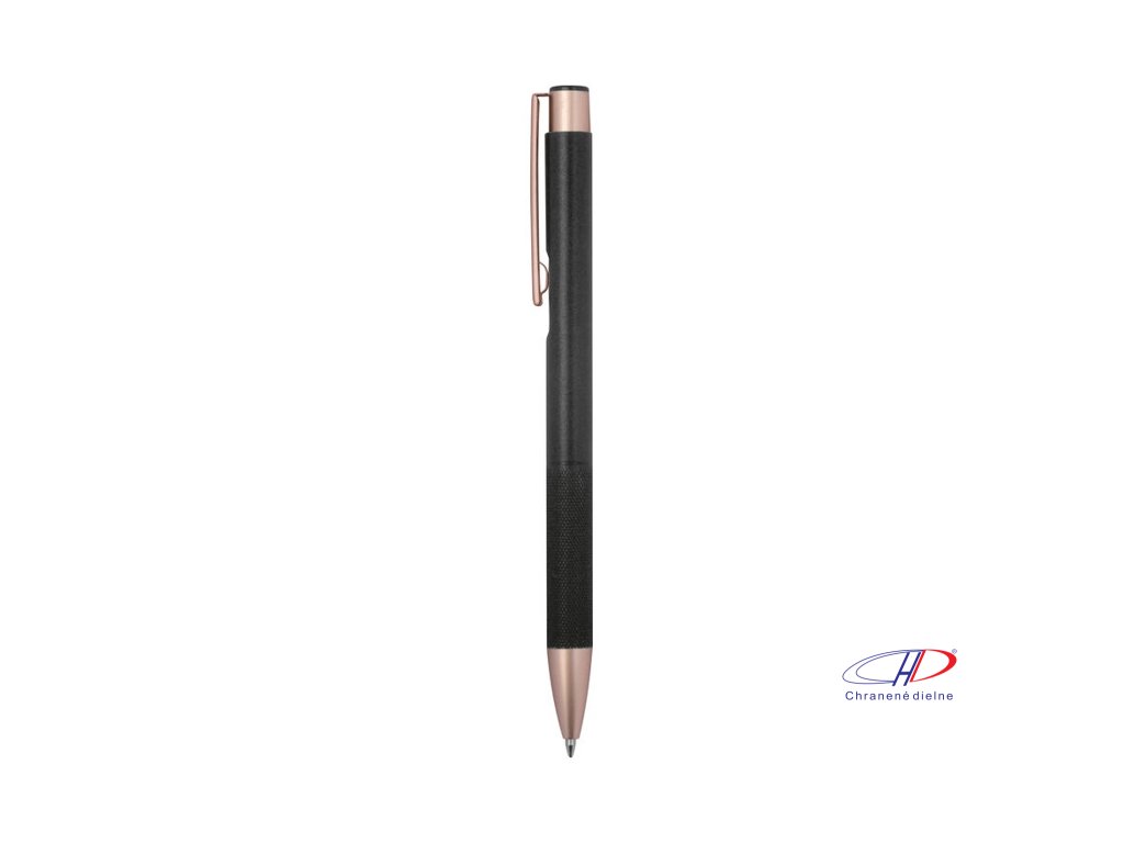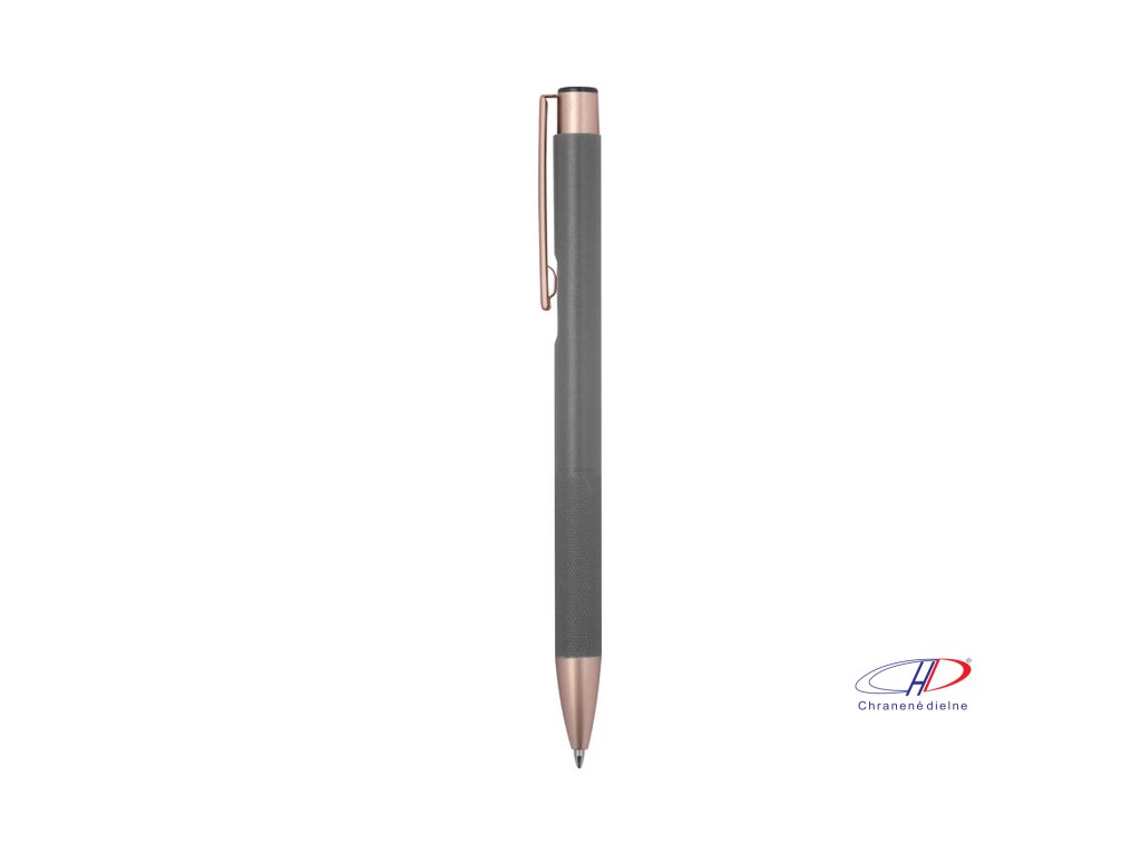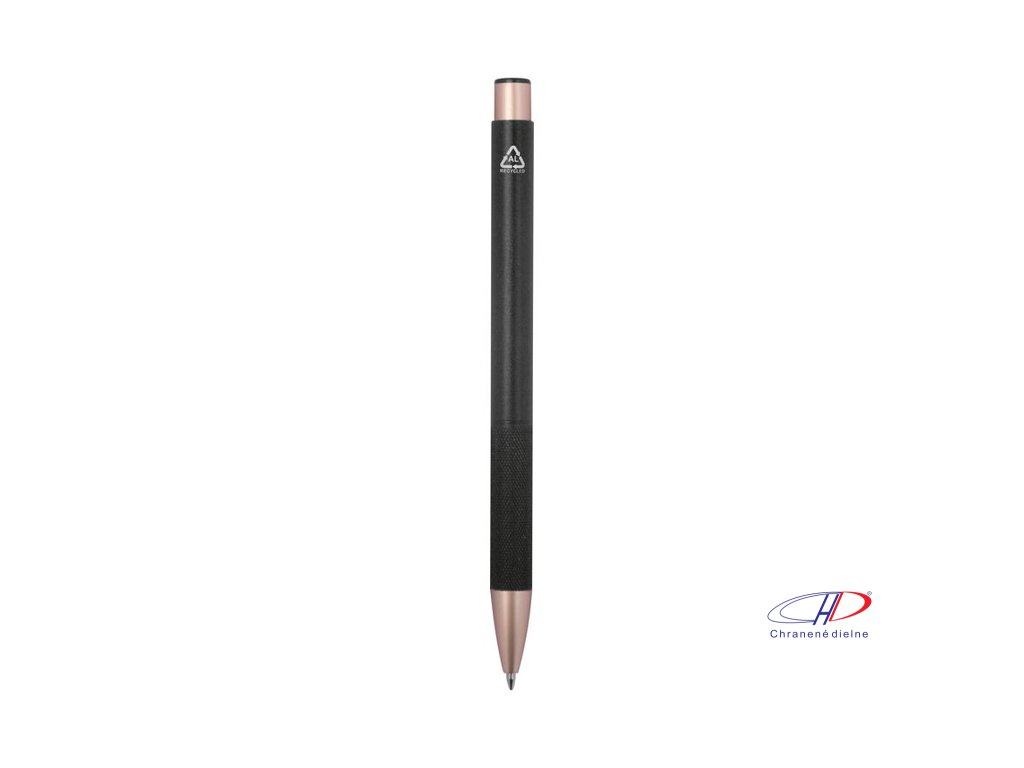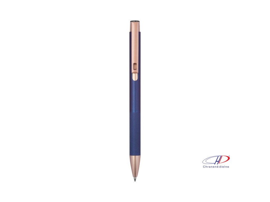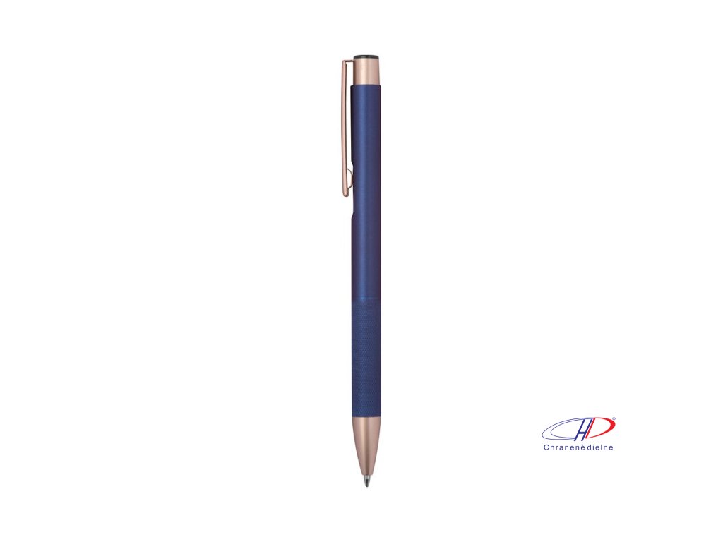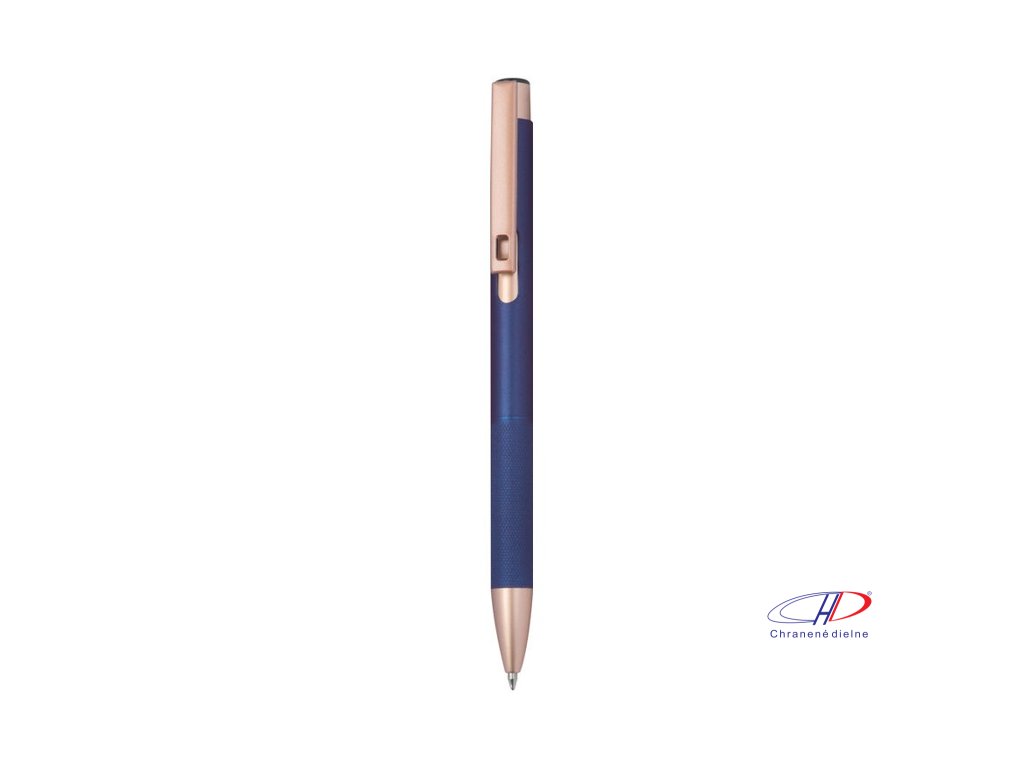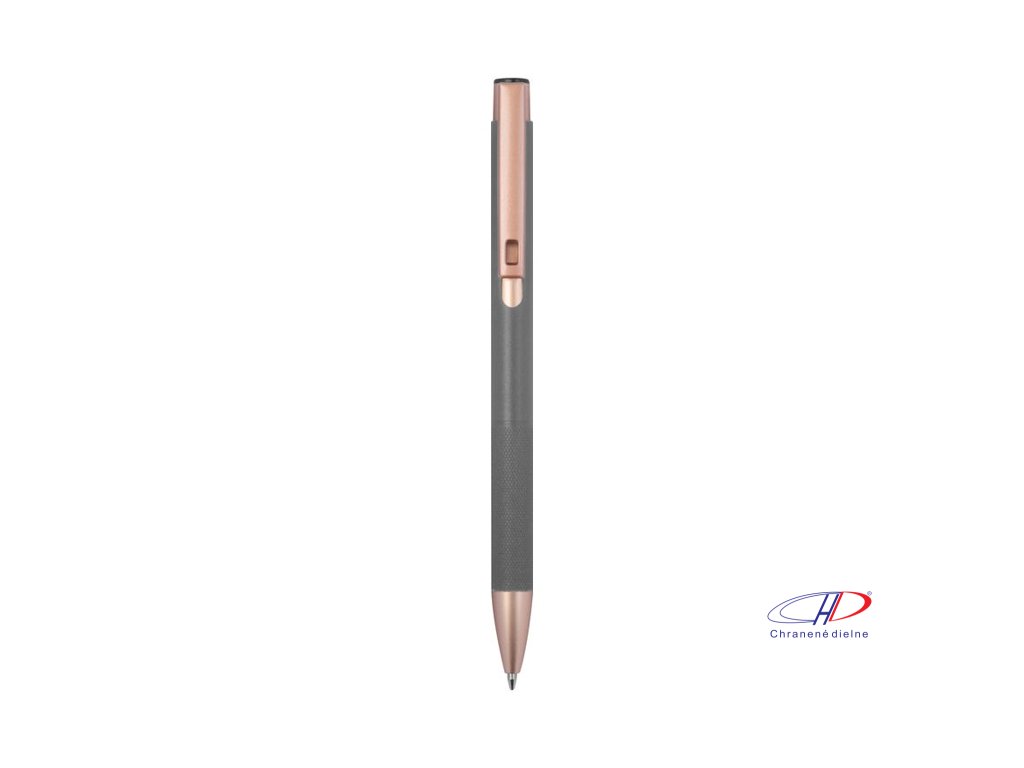 Guľôčkové pero z recyklovaného hliníka s matným povrchom, ružovo-zlatými detailmi, modrou náplňou a úchopom s diamantovým vzoromDodatočné parametre