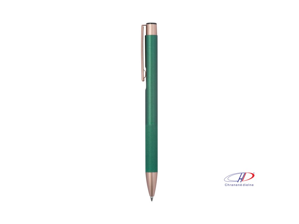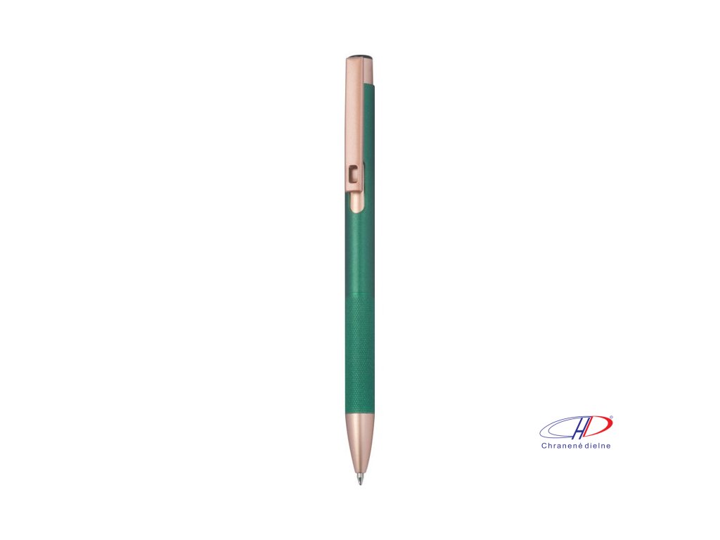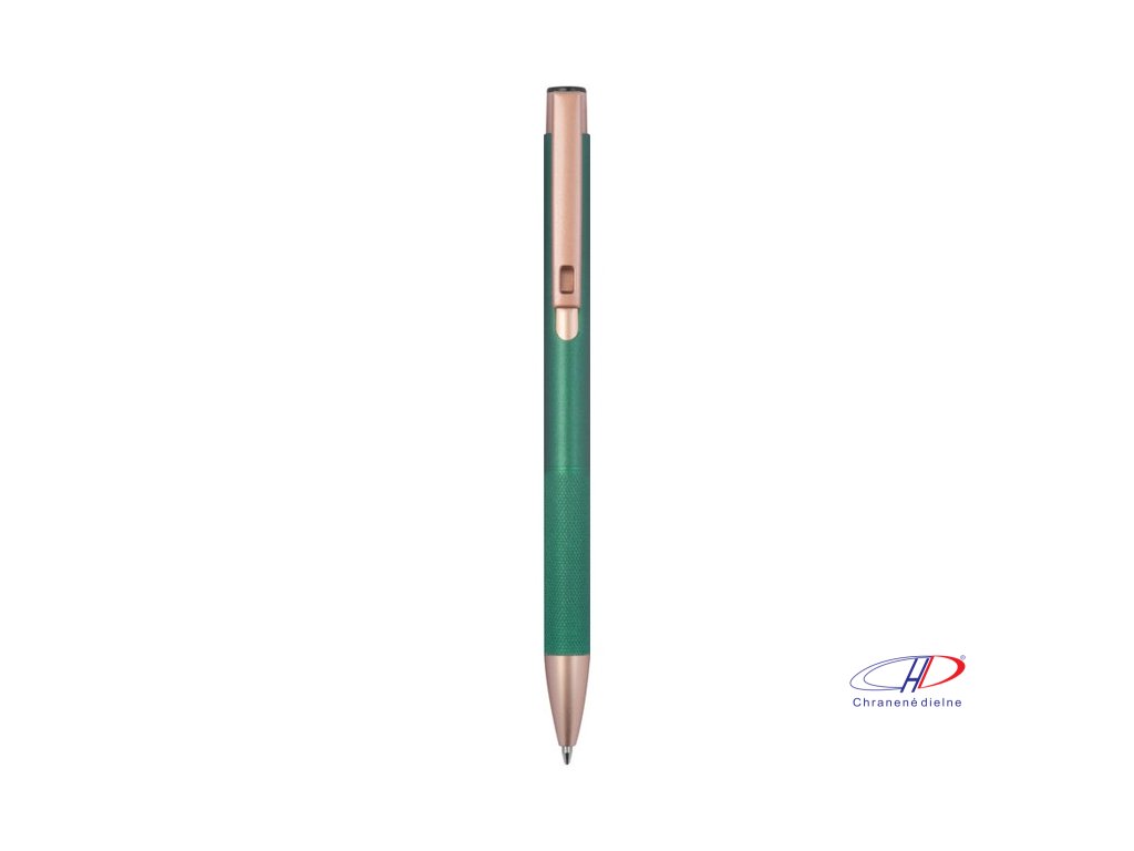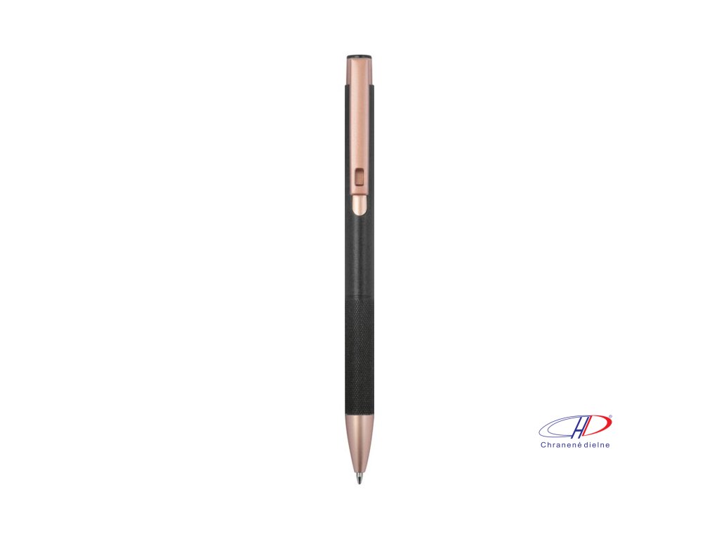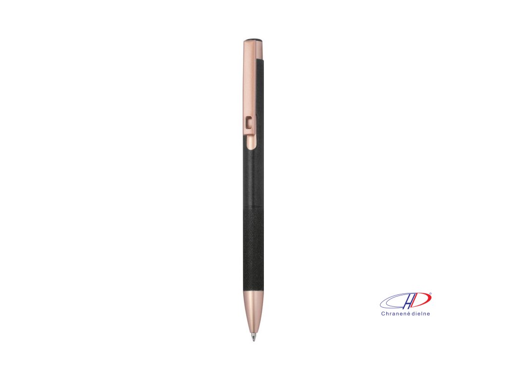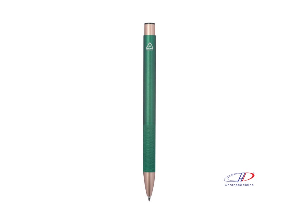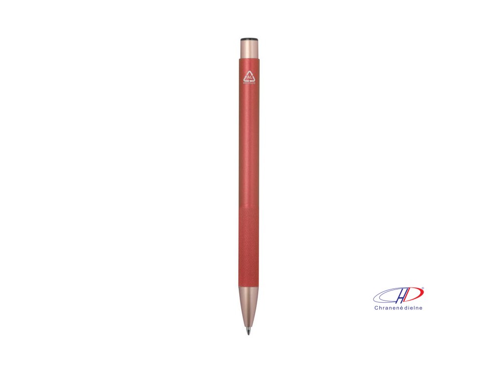 Guľôčkové pero z recyklovaného hliníka s matným povrchom, ružovo-zlatými detailmi, modrou náplňou a úchopom s diamantovým vzoromDodatočné parametre