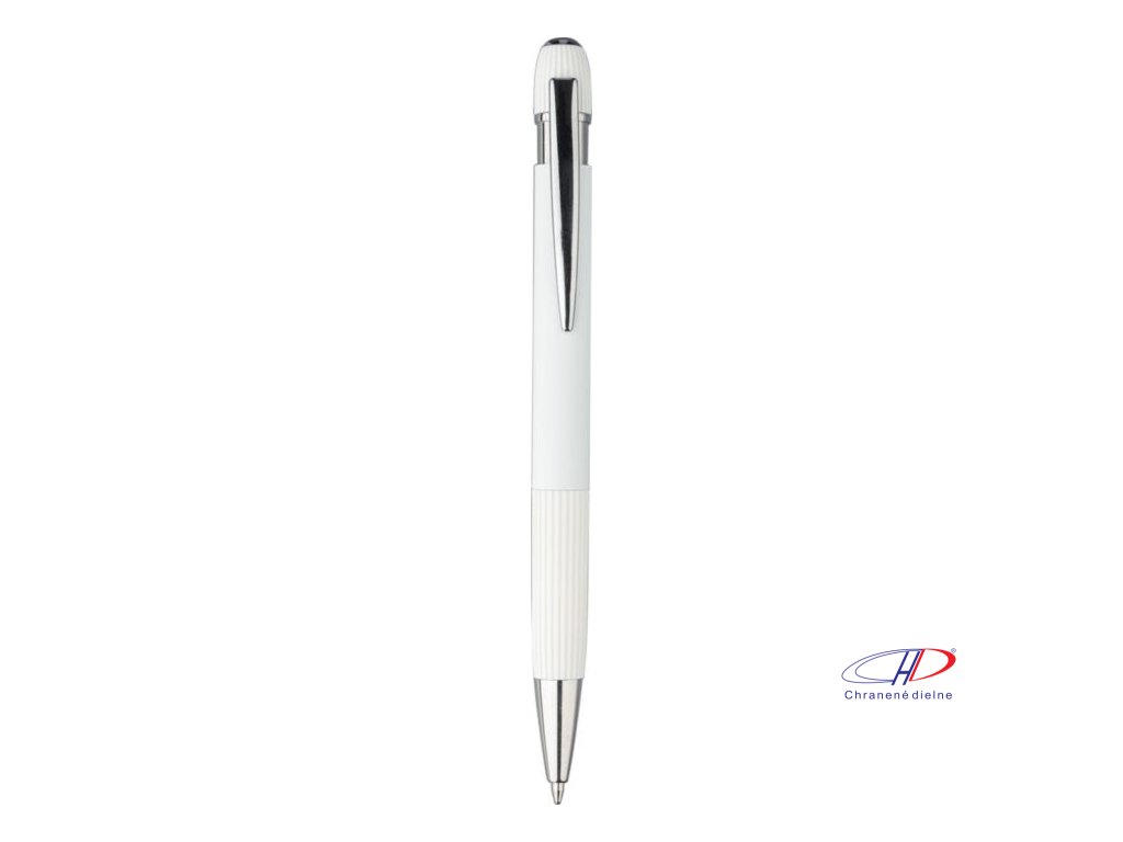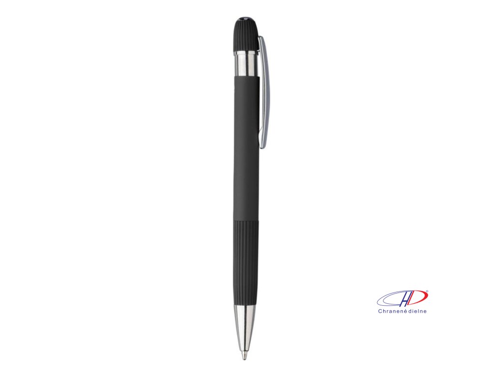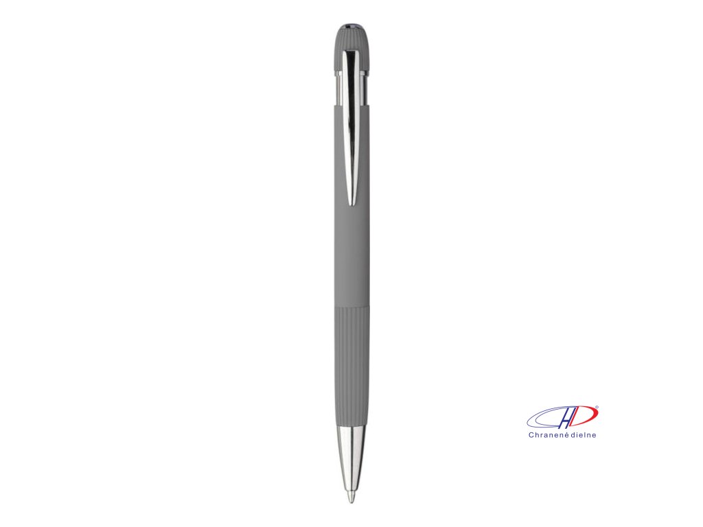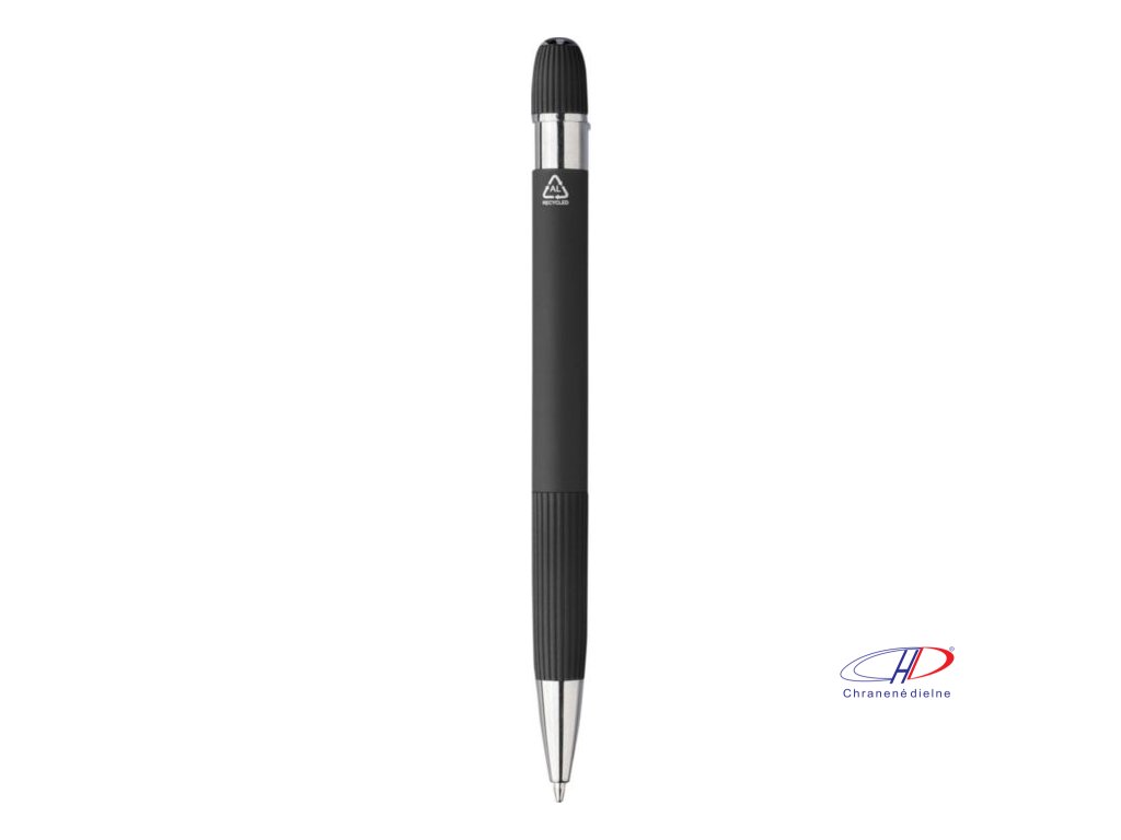 Guľôčkové pero z recyklovaného hliníka s pogumovanou povrchovou úpravou. Má pruhované detaily na úchope a vrchnej strane, chrómovaný plastový hrot a tlačidlo s kovovým klipom. Súčasťou je laserom gravírované recyklované logo. Modrá náplň.Dodatočné parametre