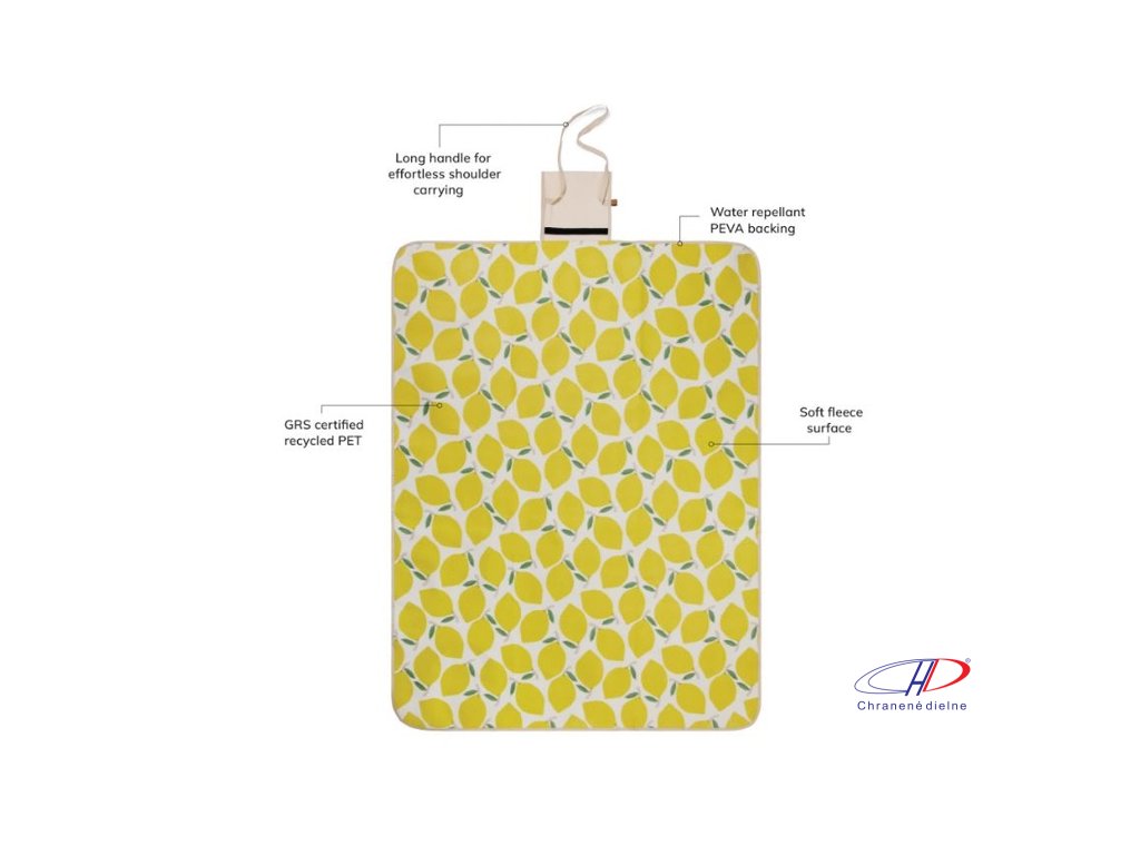 Deka má mäkký fleecový povrch s citrónovým vzorom a pohodlný vodoodpudivý PEVA podklad. Certifikácia GRS zaručuje, že celý dodávateľský reťazec recyklovaných materiálov je certifikovaný. Podiel recyklátu: 51 %.Dodatočné parametre