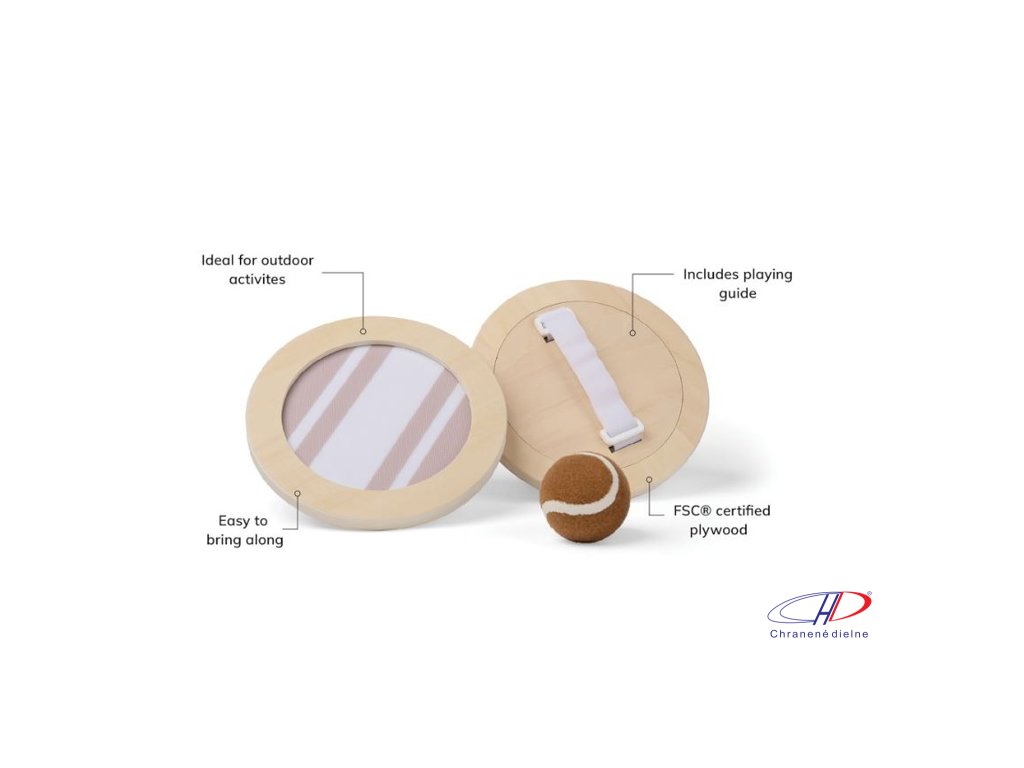 Hra obsahuje jednu loptičku a dve lapačky na suchý zips z preglejky s certifikátom FSC®. Hra je zabalená v plátennom vrecku so sieťovaným chrbtom. Súčasťou balenia je aj návod na použitie.Dodatočné parametre
