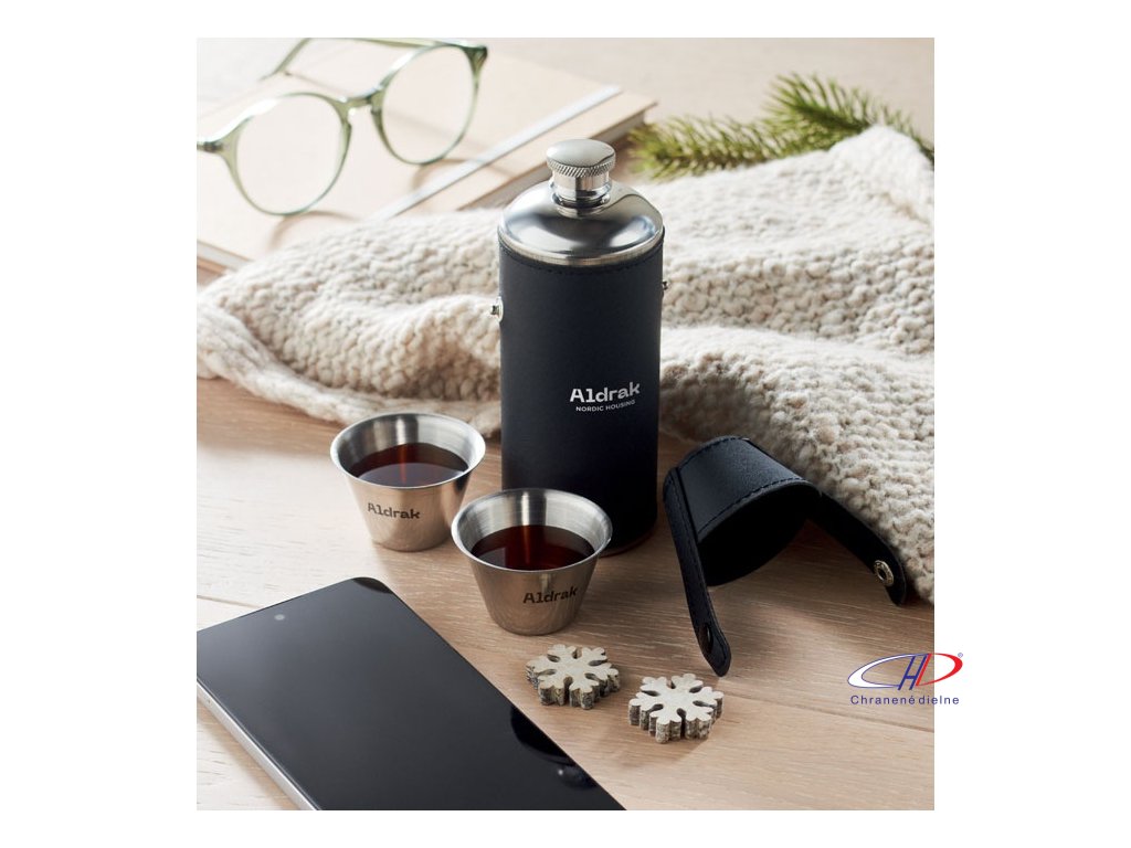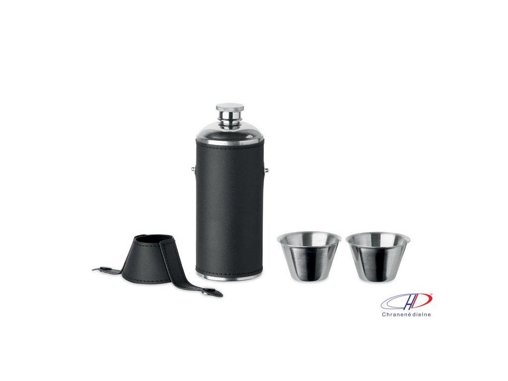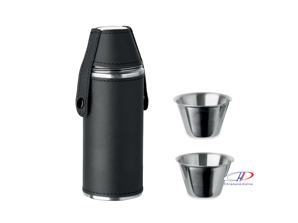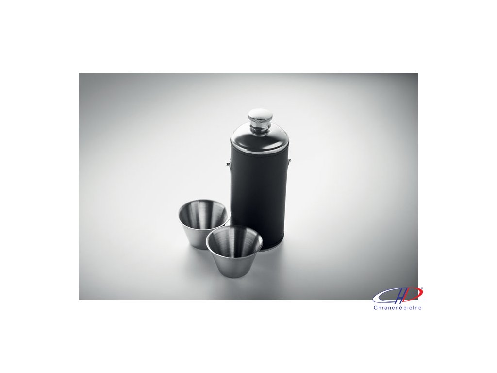 Ploskačka z nehrdzavejúcej ocele s povrchom z PU kože a 2 kusmi nerezových 20ml pohárikov vo viečku. Objem: 230ml.Dodatočné parametre